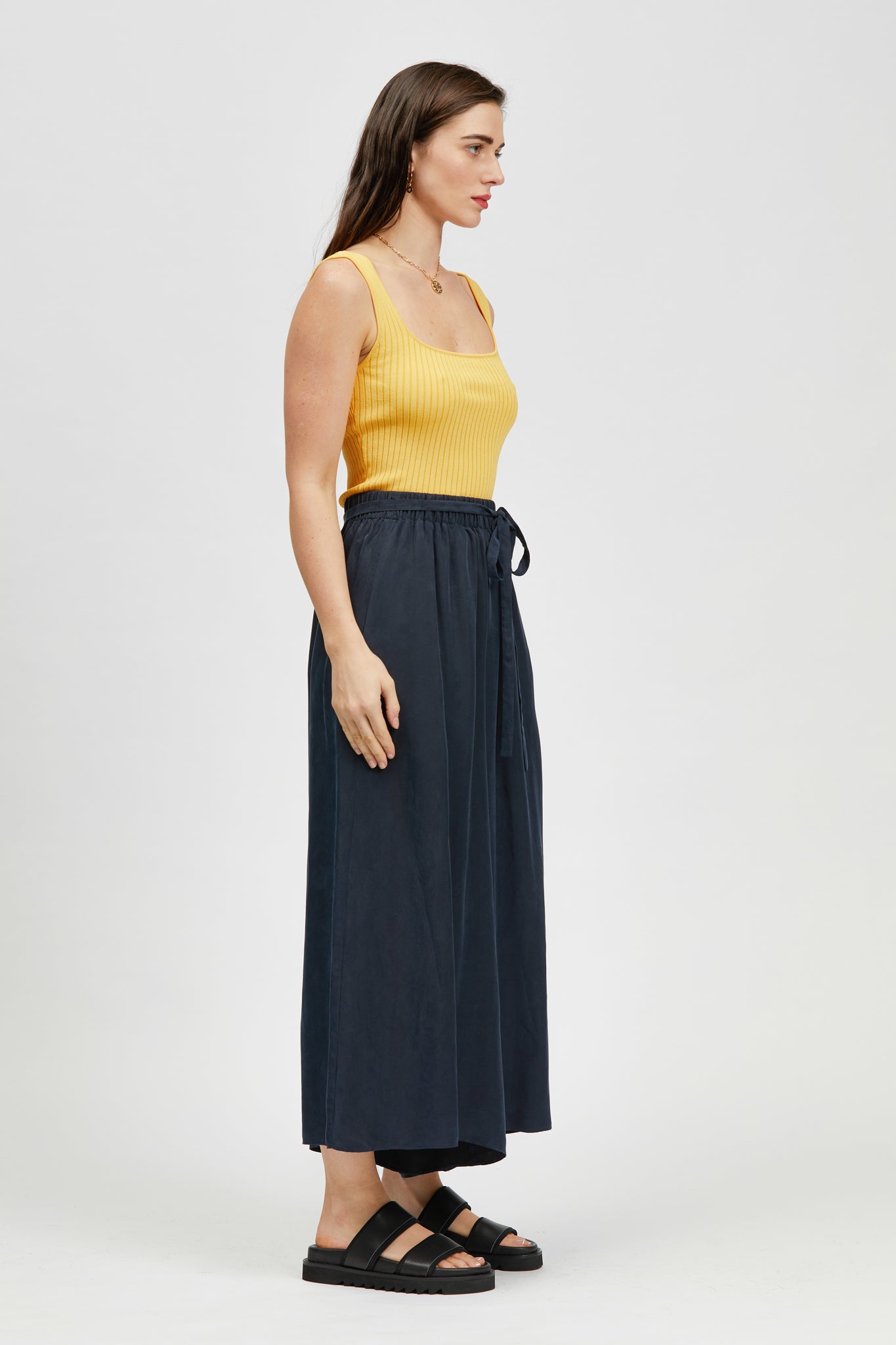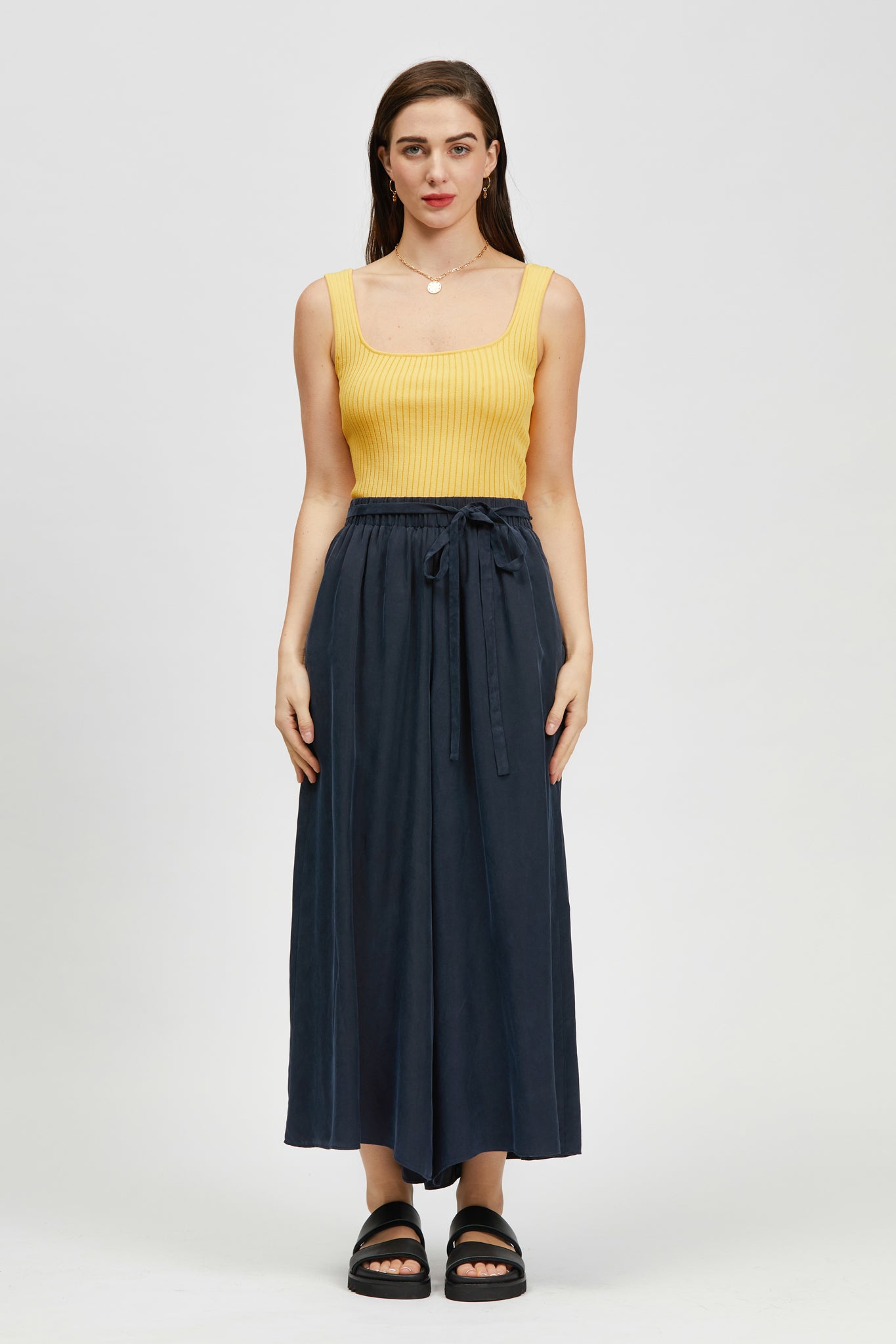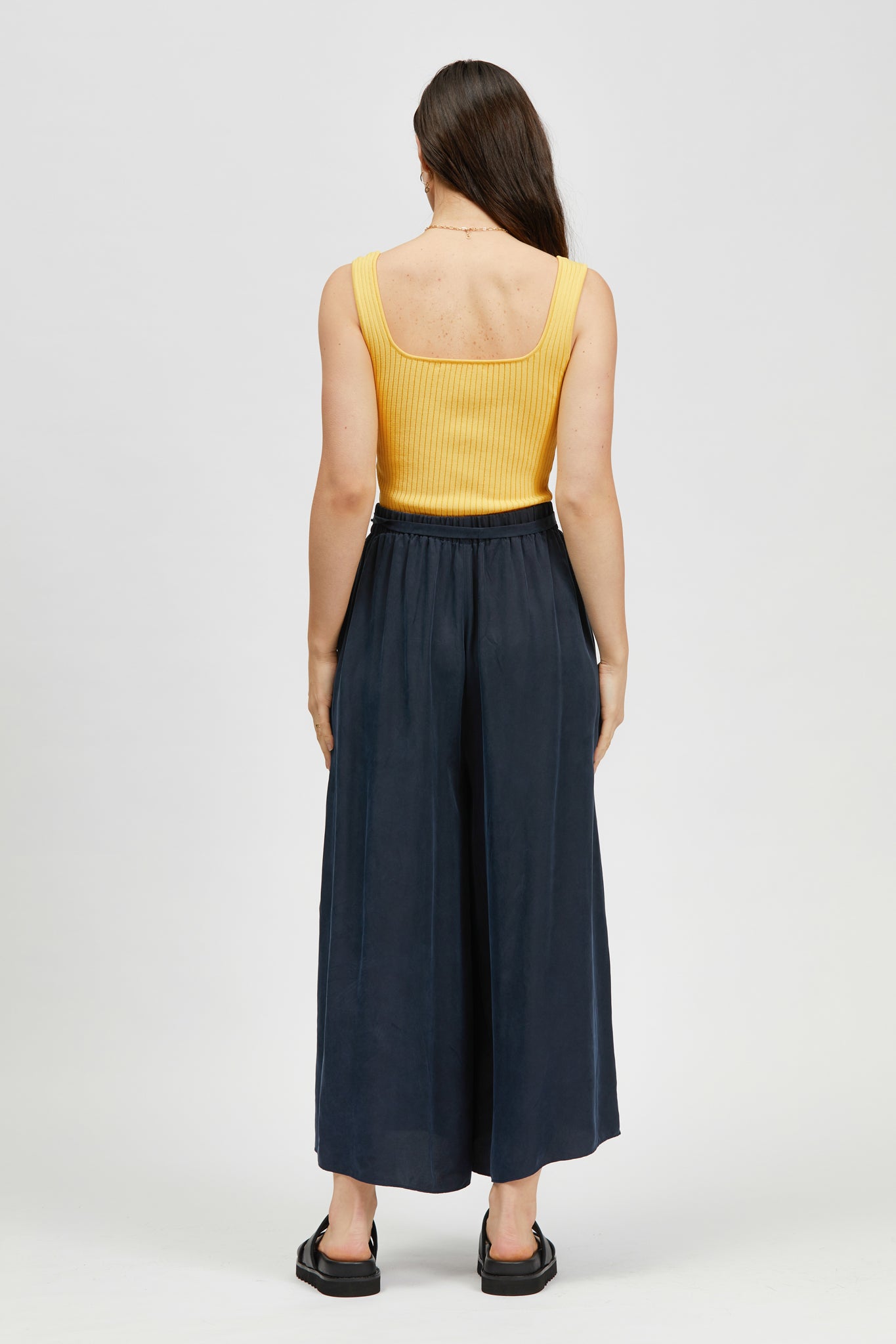The Pillar Singlet is a sleeveless cropped rib knit style with a square neckline. Made in a soft Rayon/Nylon blend.
