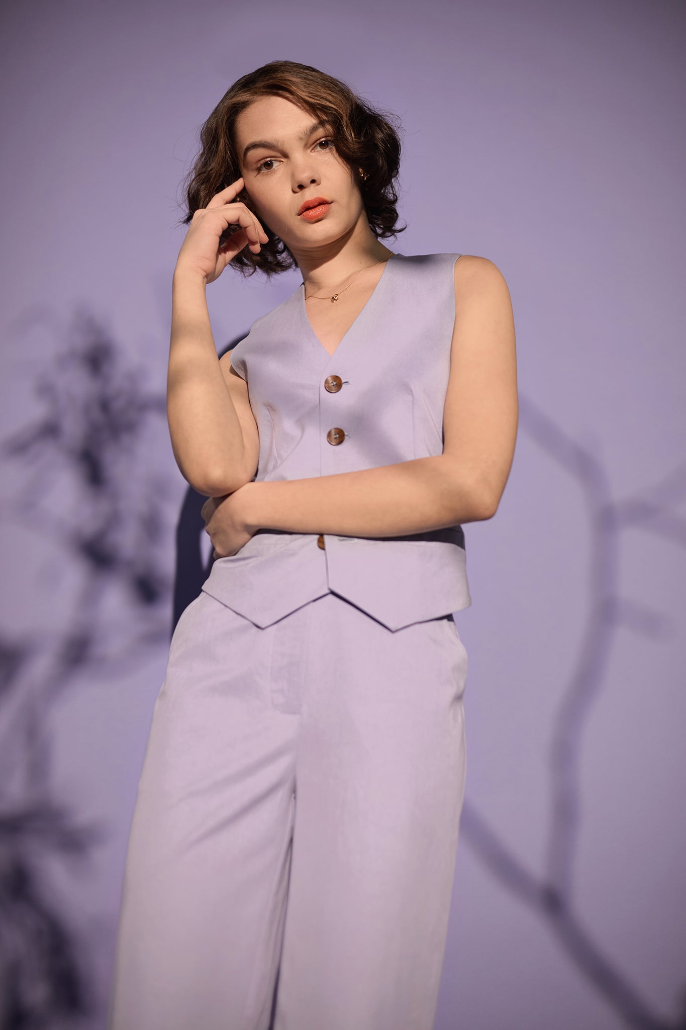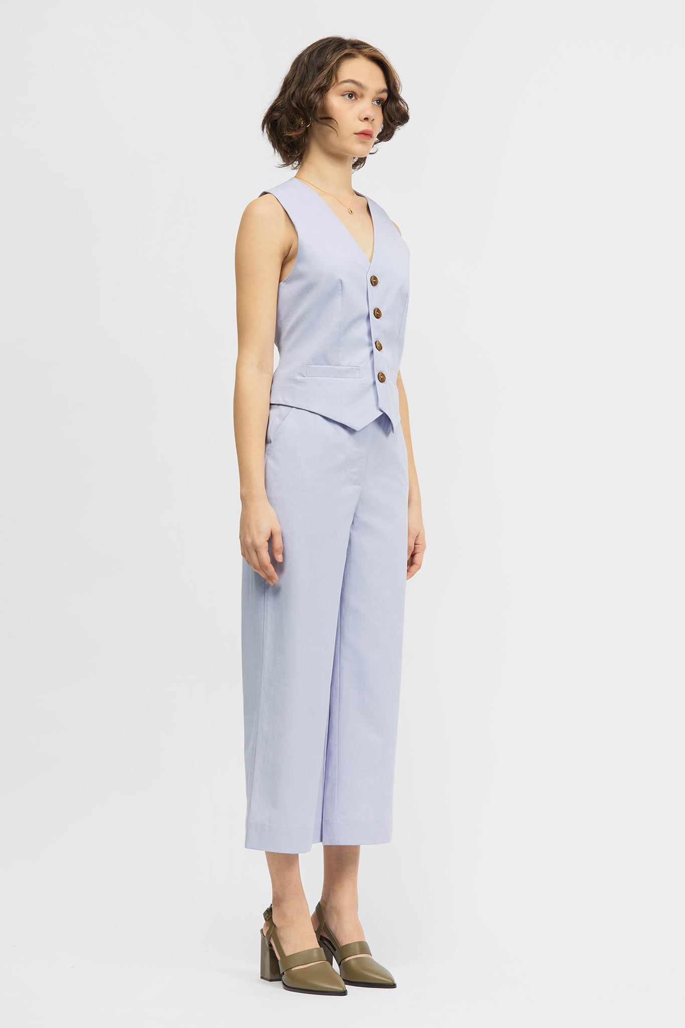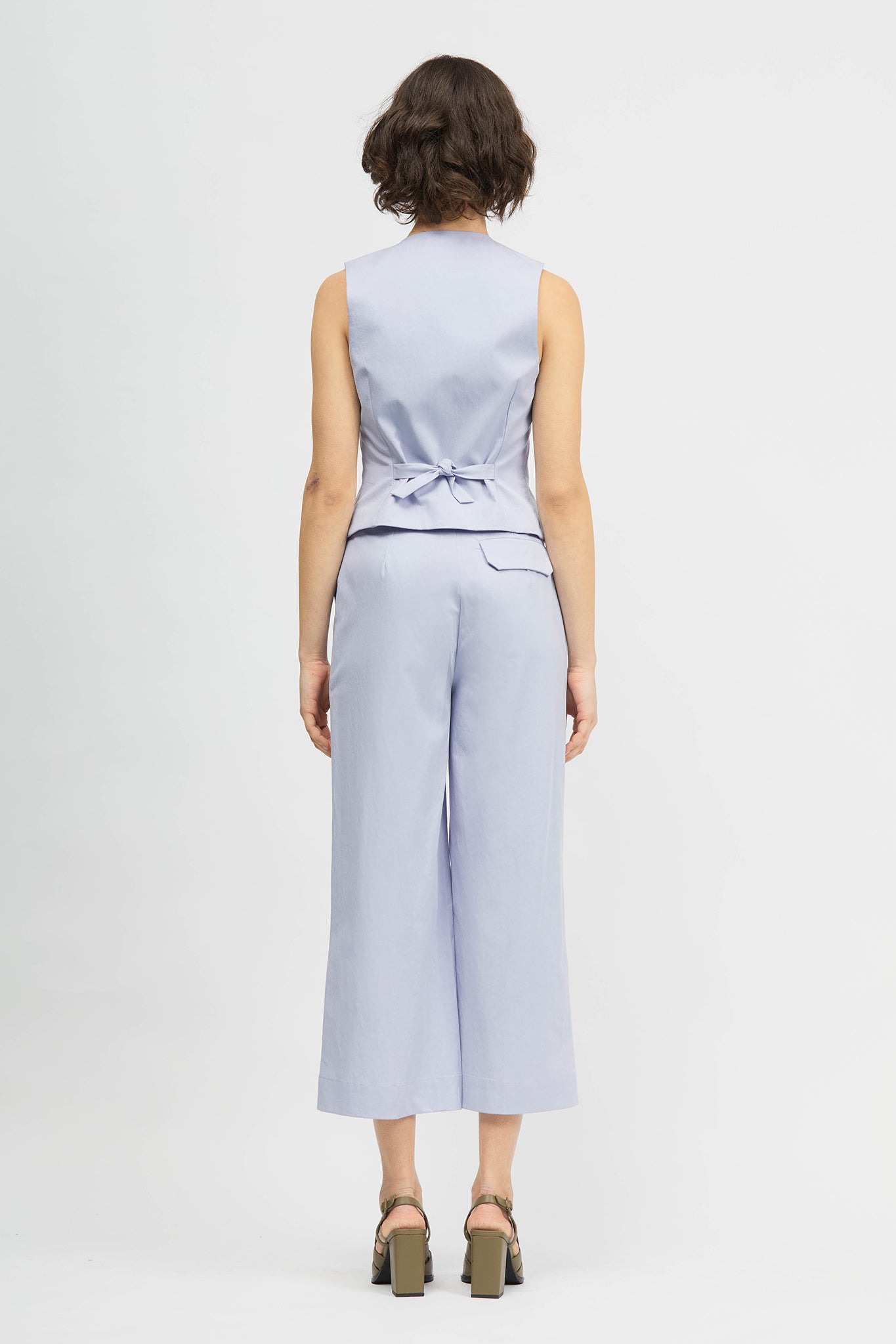 The Ulster Vest is a tailored-fit with a button-up front. Details include a tie at the back to help shape waist and mock-welt pockets at the front. Made in a lightweight cotton/ tencel fabrication and fully lined in a soft rayon. This style can be paired back with your existing wardrobe favourites or with the Brisa Pant and Minhwa Blazer in matching fabric as a set.