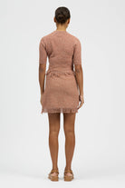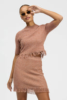 The Borla Top is a cropped knit style with half sleeves, featuring fringe detailing along the sleeve edges and body hemline. Made in 100% textured cotton. This style can be paired with your existing wardrobe favourites or with the Borla Skirt in matching fabric as a set.