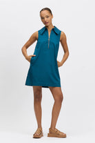 The Alcusas Mini Dress features a zip-front detail, collared neckline, and side pockets. Made from a soft Tencel and cotton blend.