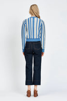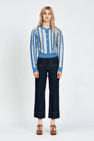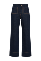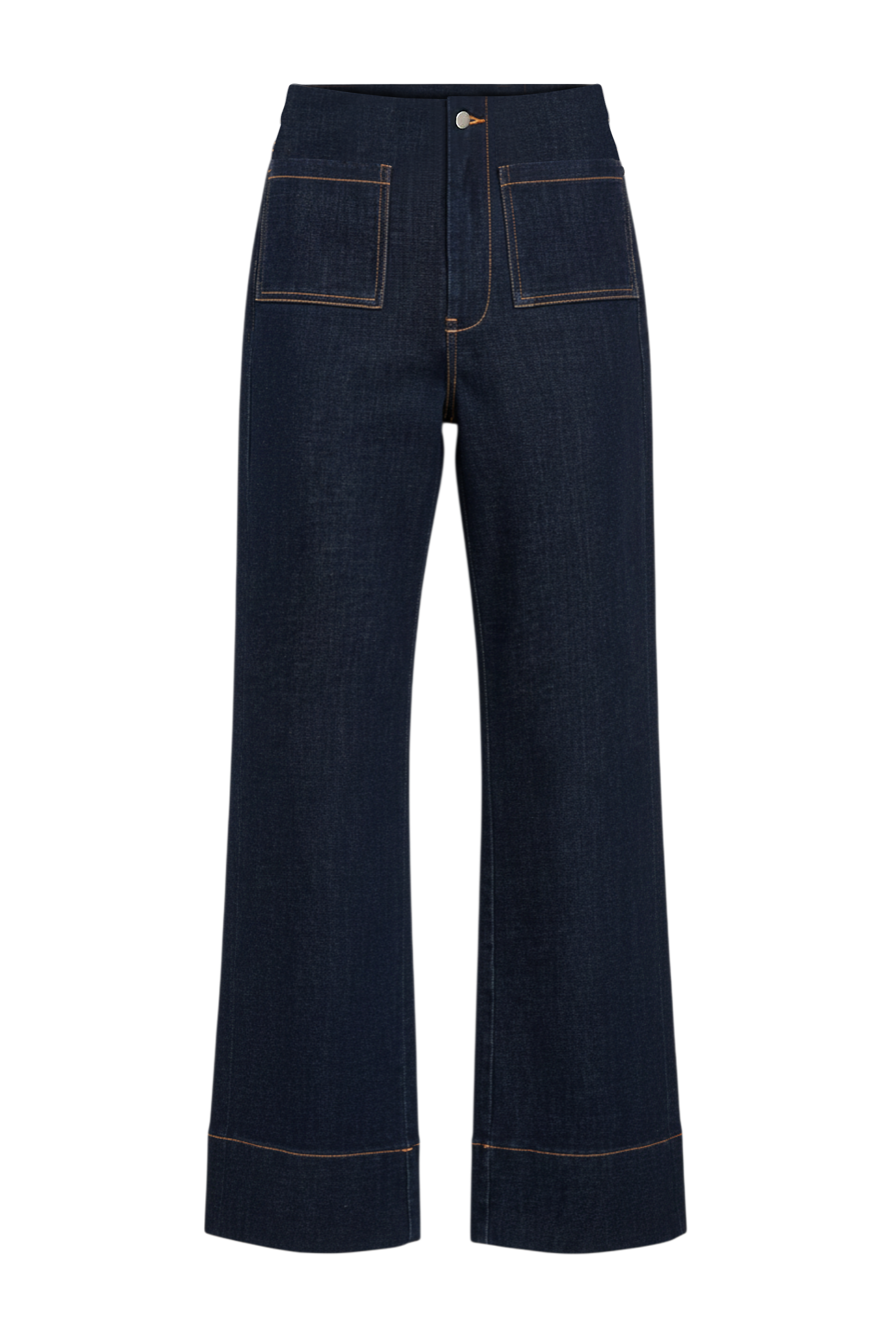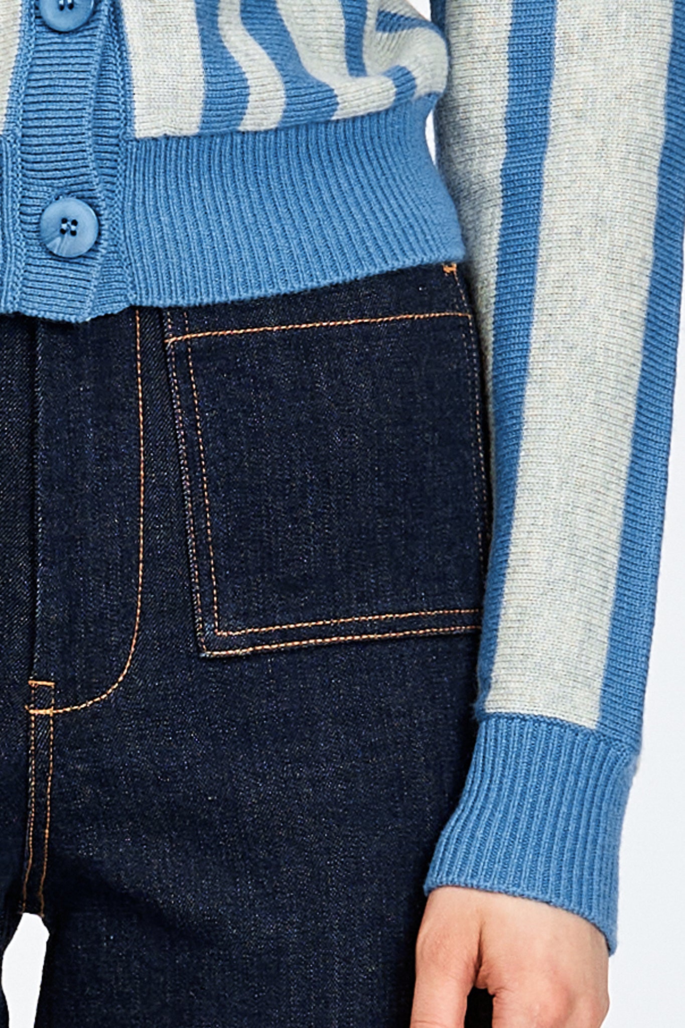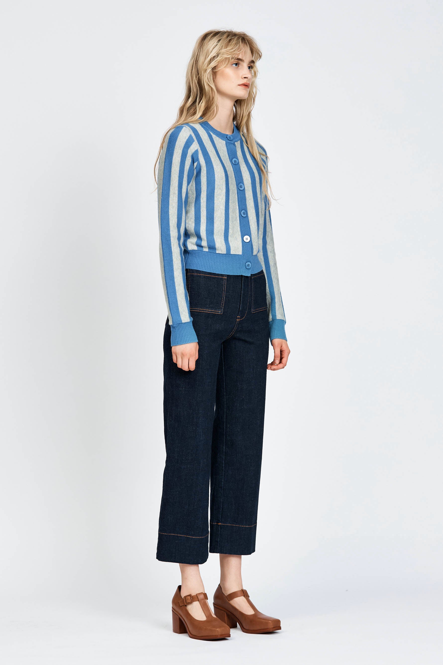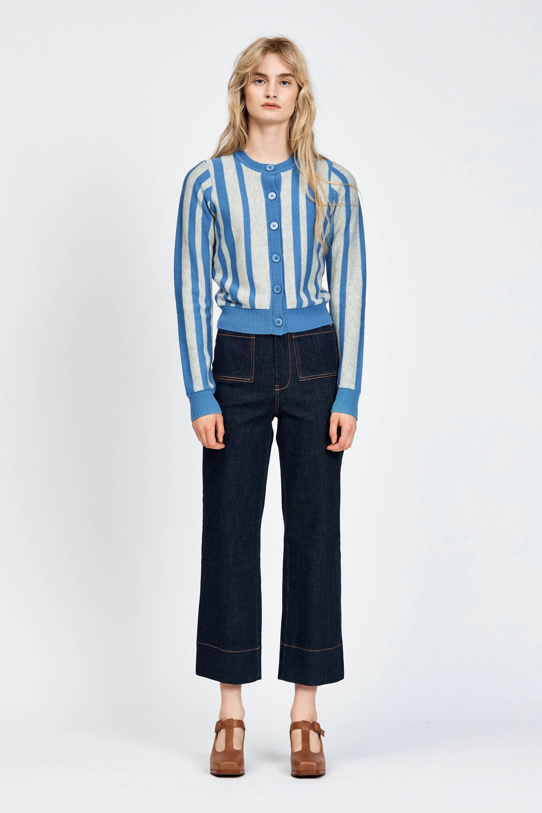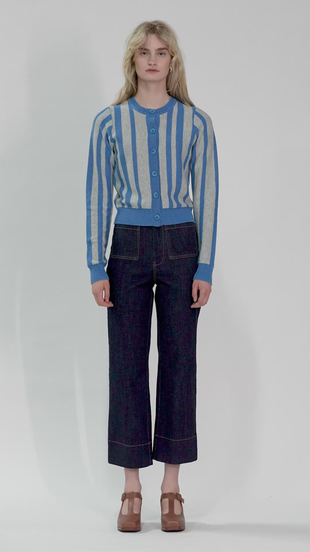 The Aurora Jean is designed in a high-waisted, relaxed wide-leg fit with a cropped silhouette and an exaggerated hem height. Includes búl’s signature Nouveau Logo embroidery detailing. Available in a dark denim wash. Styled with the Havu Cardigan.