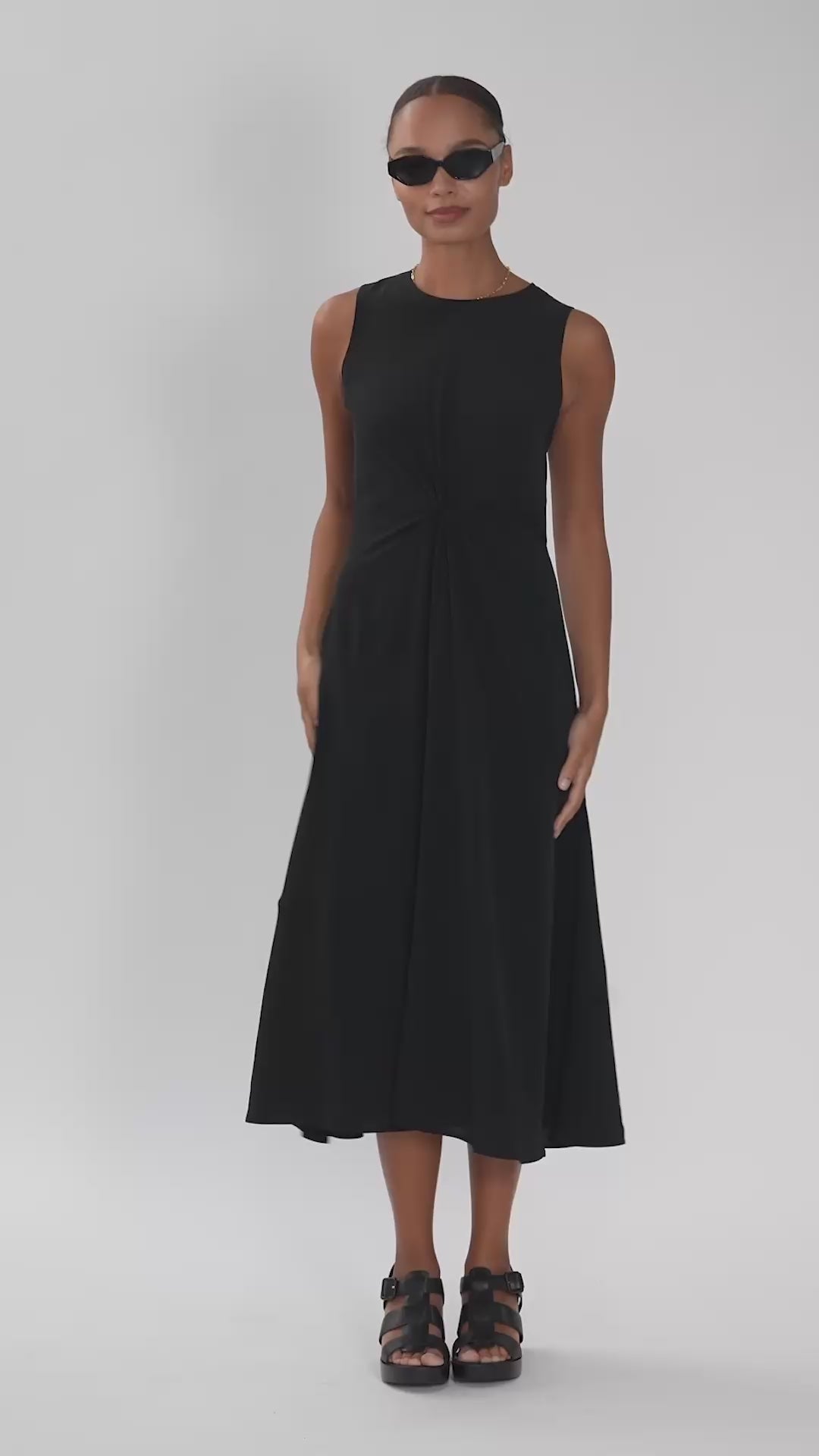 The Celeste Dress is a maxi-length style with a knotted front detail at the waist. Made from a soft fabric, it offers a comfortable fit with a natural drape.