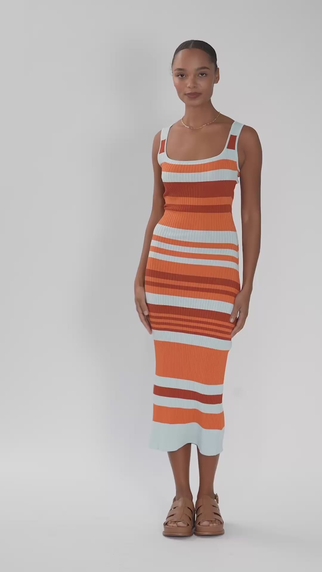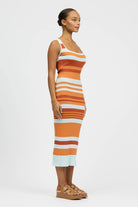 The Frenja Dress is a maxi-length style made from yarn-dyed striped fabric, featuring a flattering scooped neckline. Made in a soft Viscose/Nylon blend.