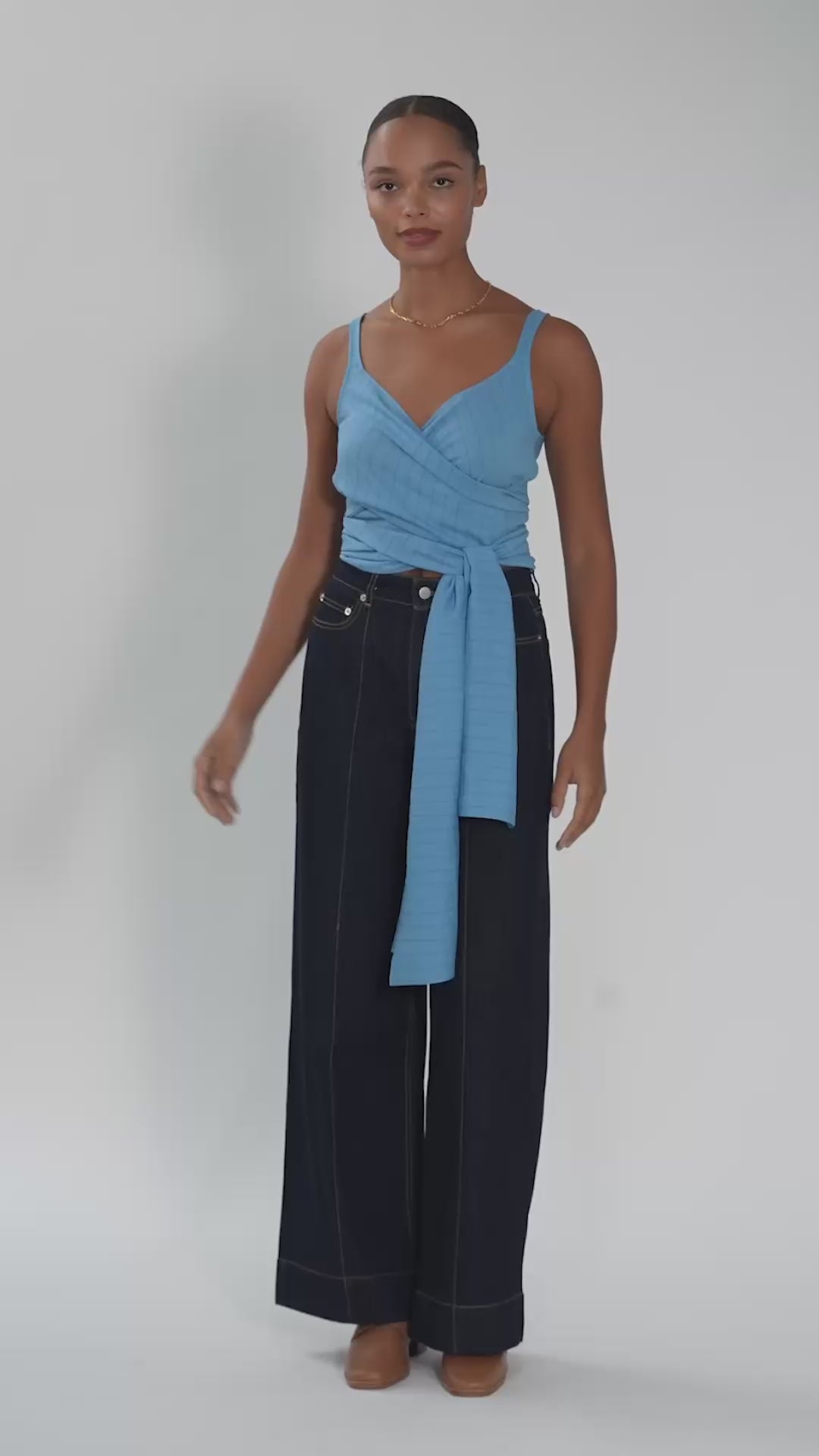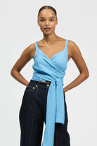 The Irazu Top features a front wrap design with an adjustable tie detail, made from a soft Viscose and Linen blend.