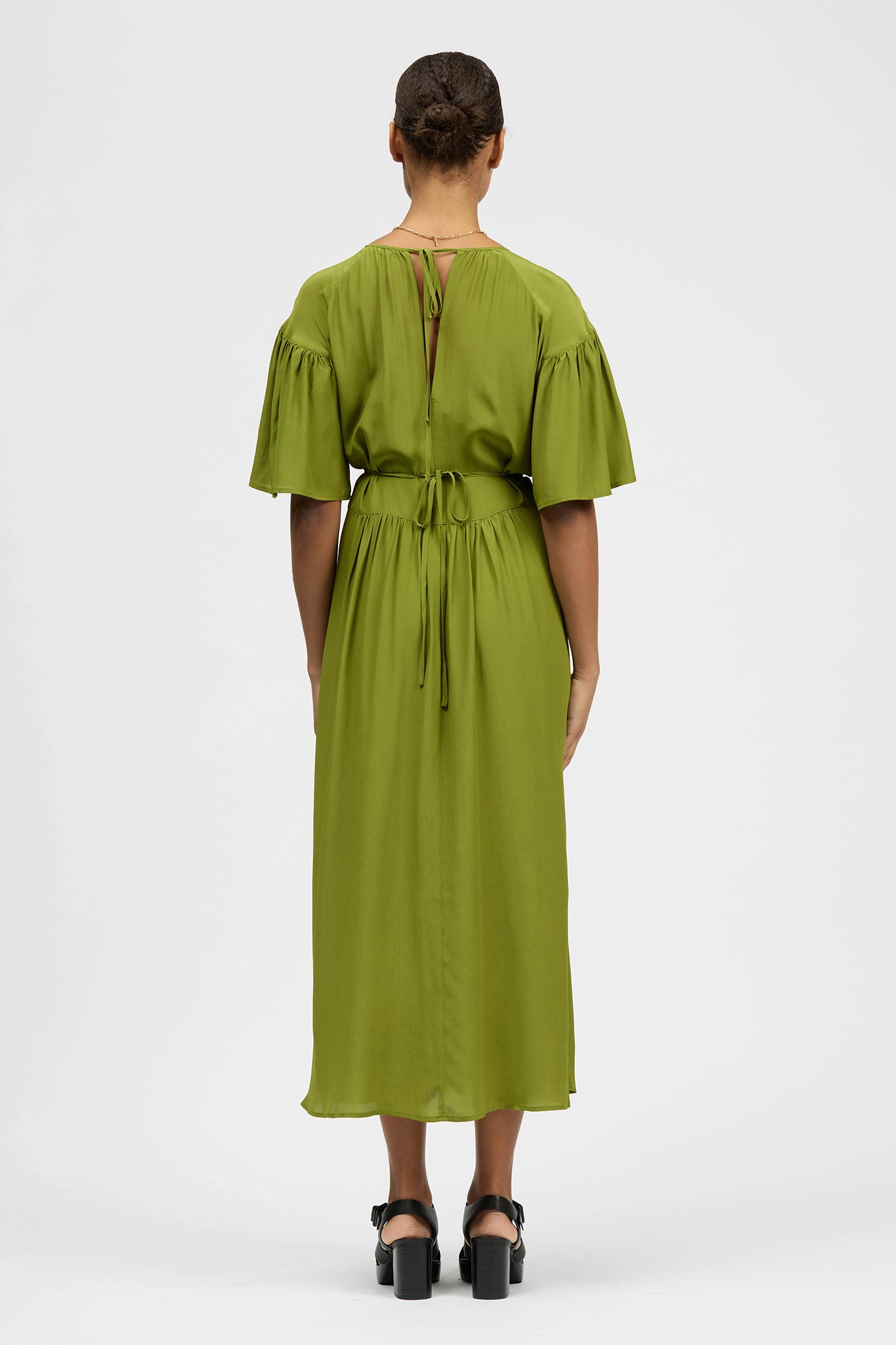 The Prazer Dress is a midi-length style with gathered detailing at the neck, waist, and sleeves. It includes a waist tie to gently cinch the waist and is made from a soft acetate and viscose blend for a smooth, comfortable feel.