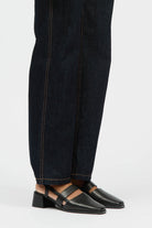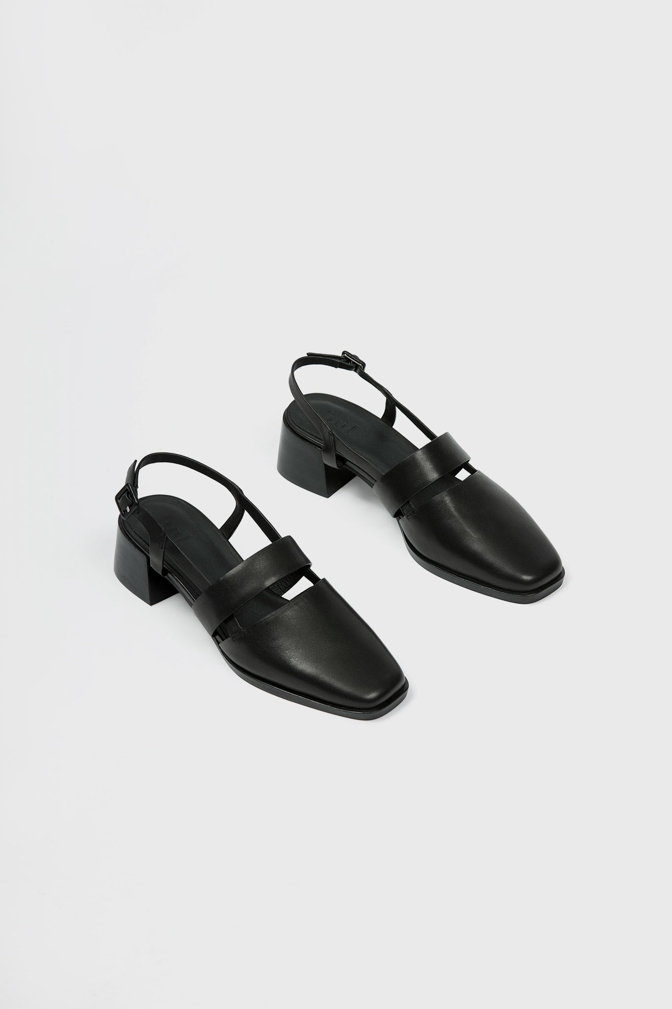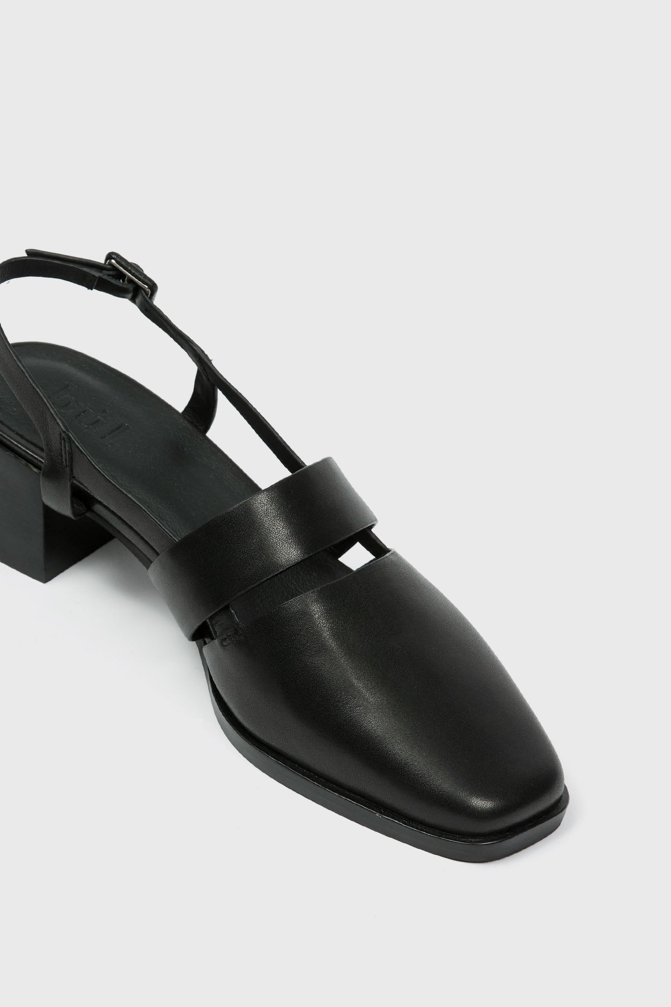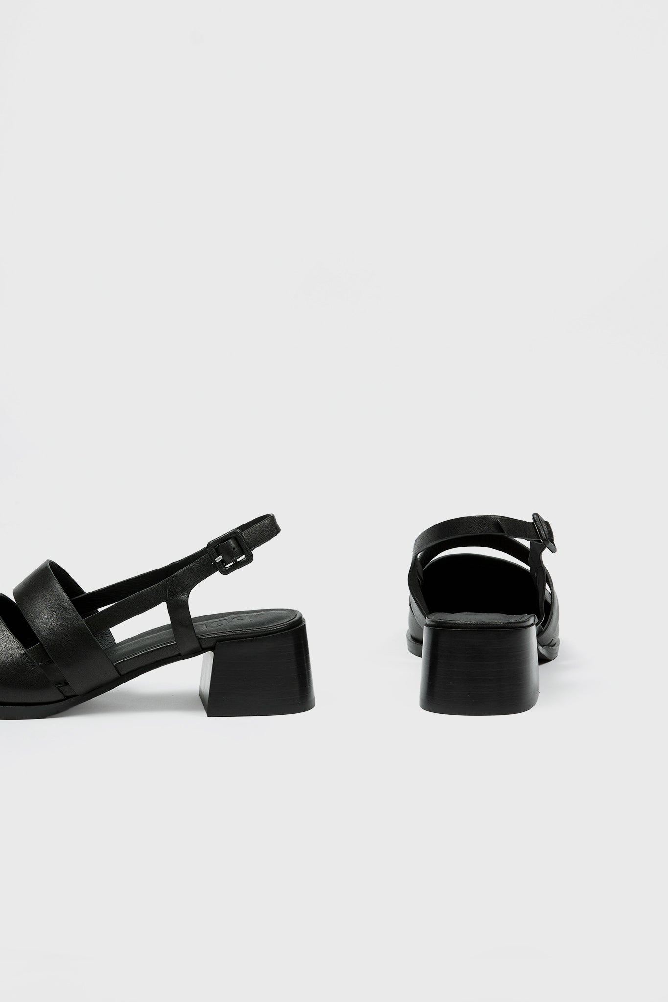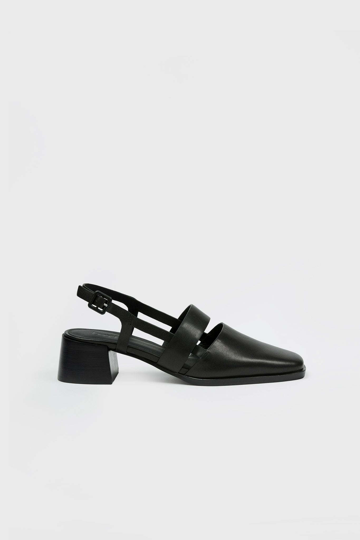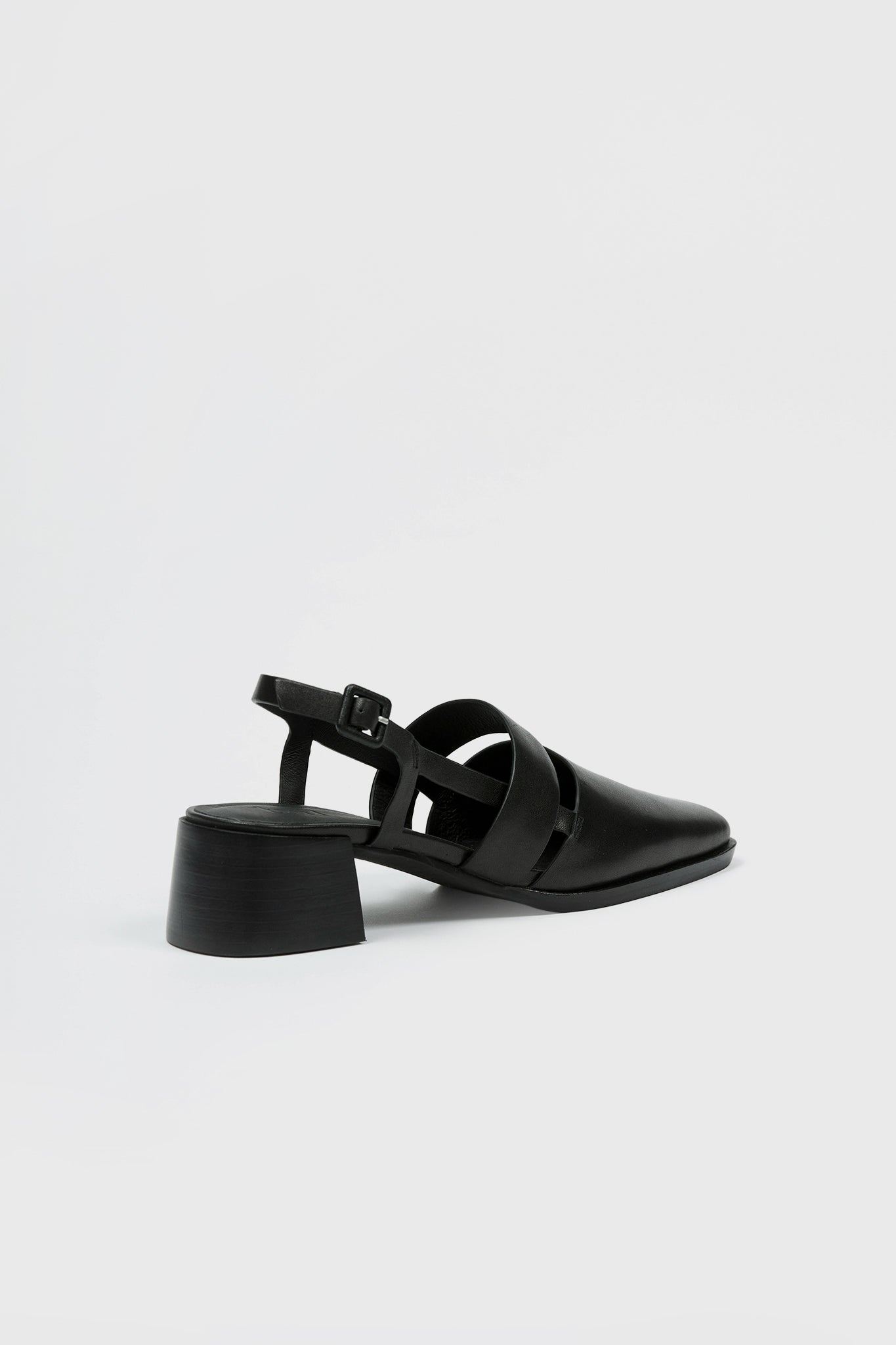 The Savannah is a closed-toe slingback sandal with cut out straps and self-covered buckle detail. Made in smooth leather.