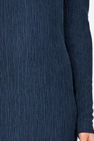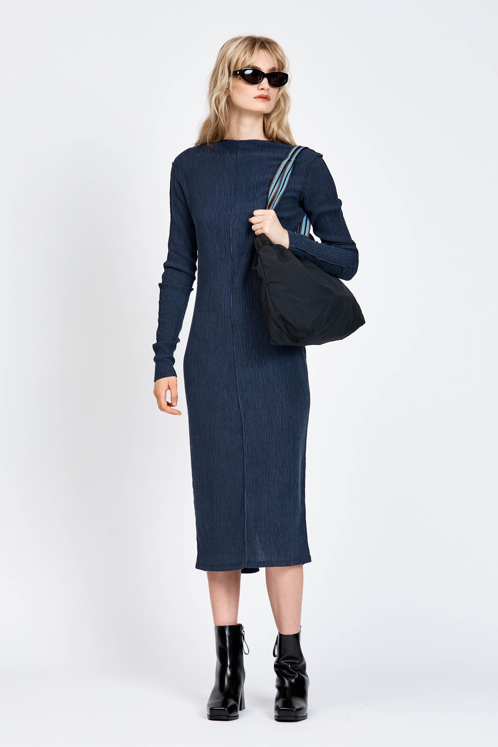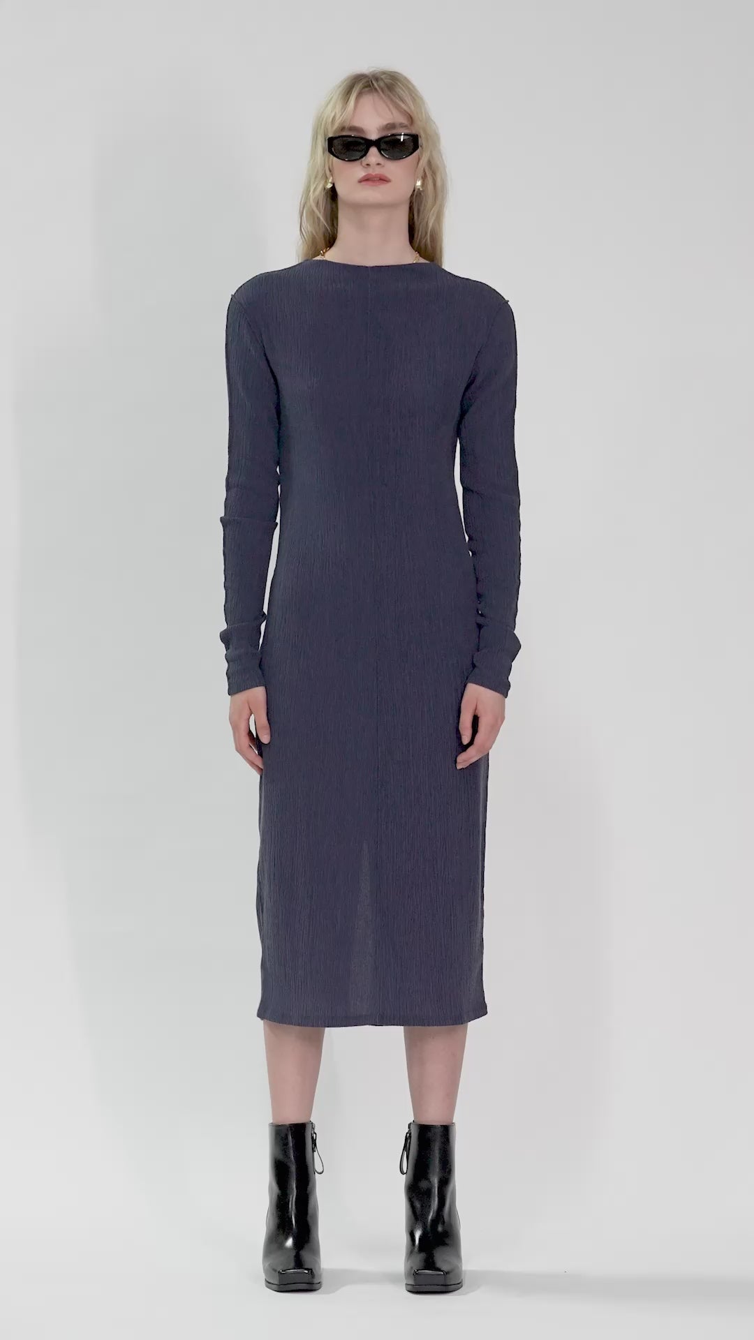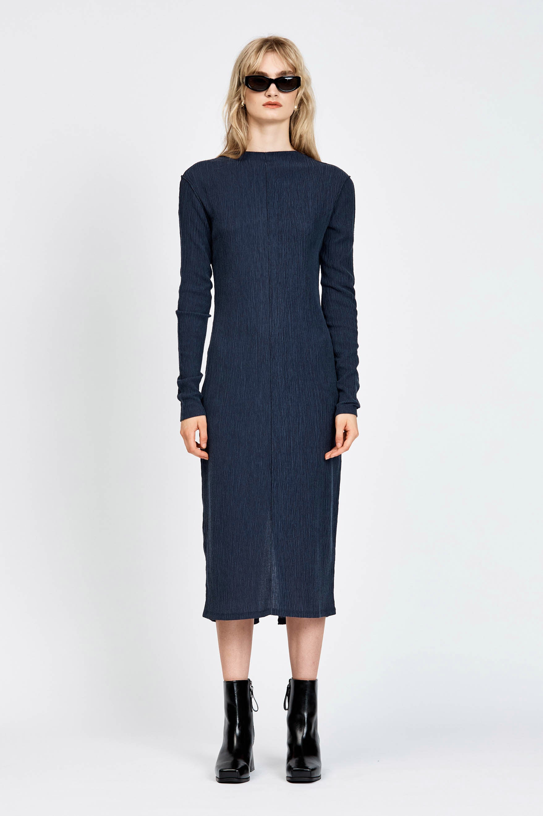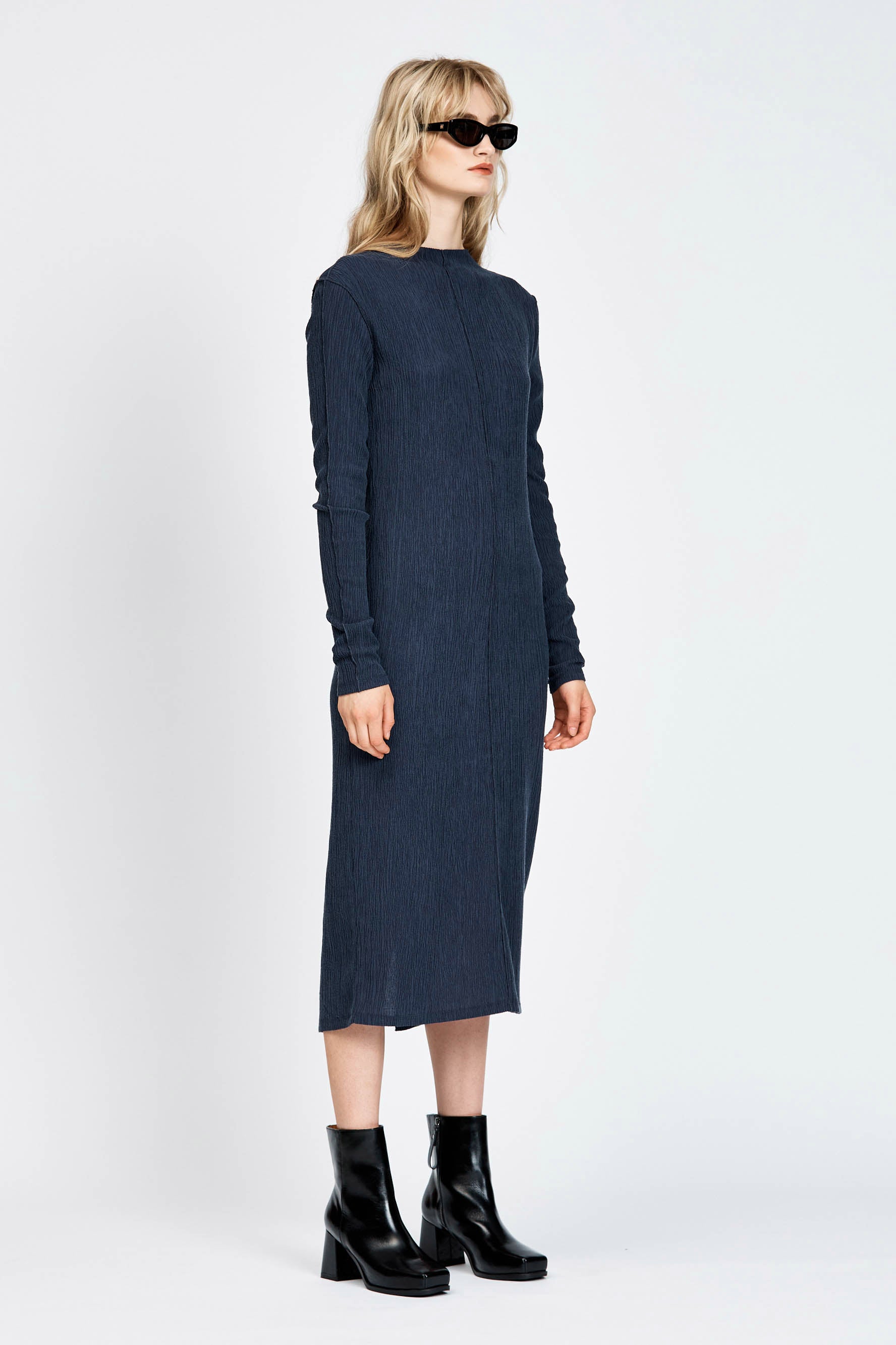 The Eira Dress is a long sleeve, midi-length design with a high neckline and front seam detailing. Made from a specialty textured pleated fabric blend with high stretch for comfort. Styled with the Lumo Boot.