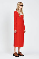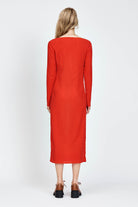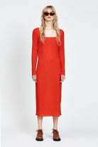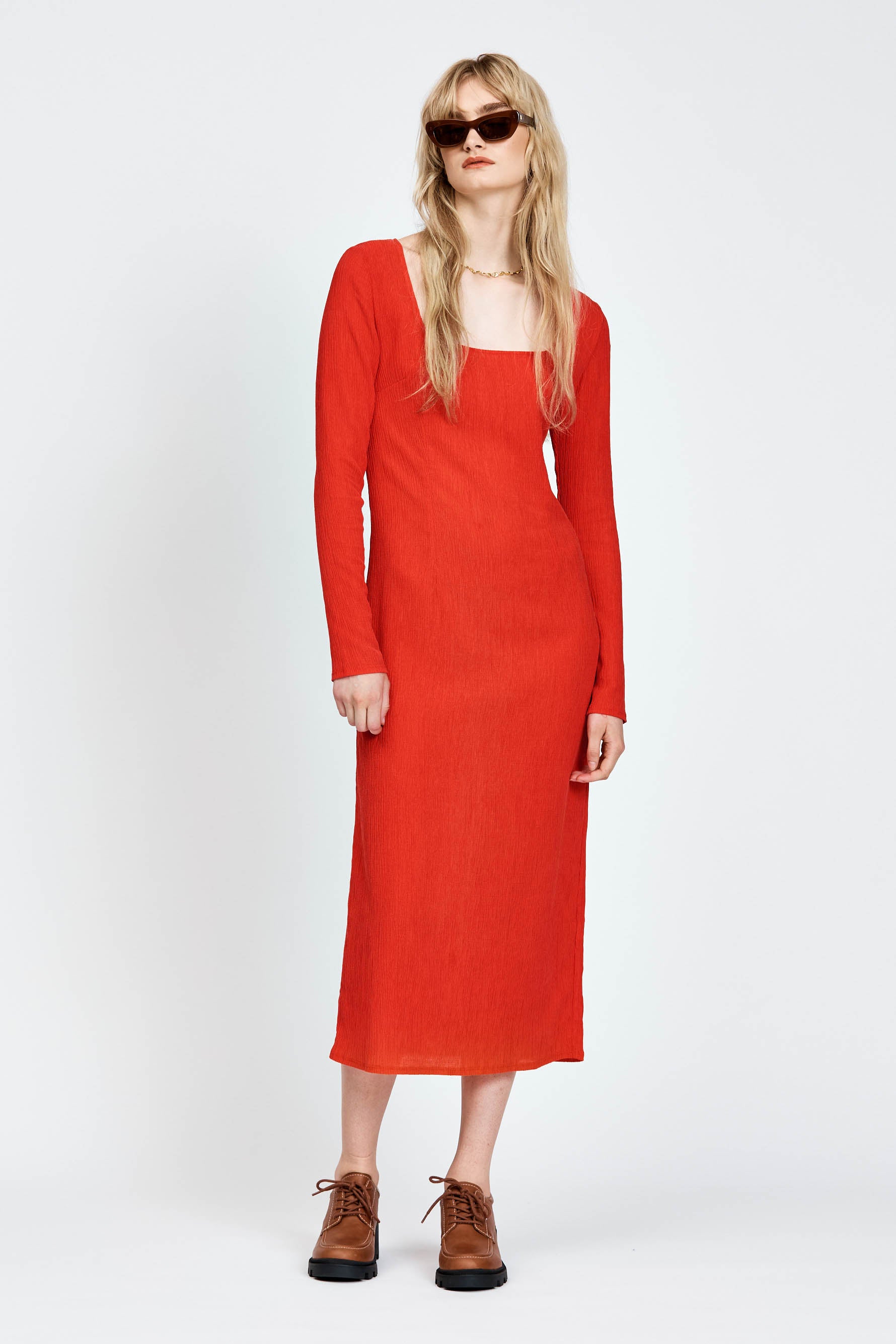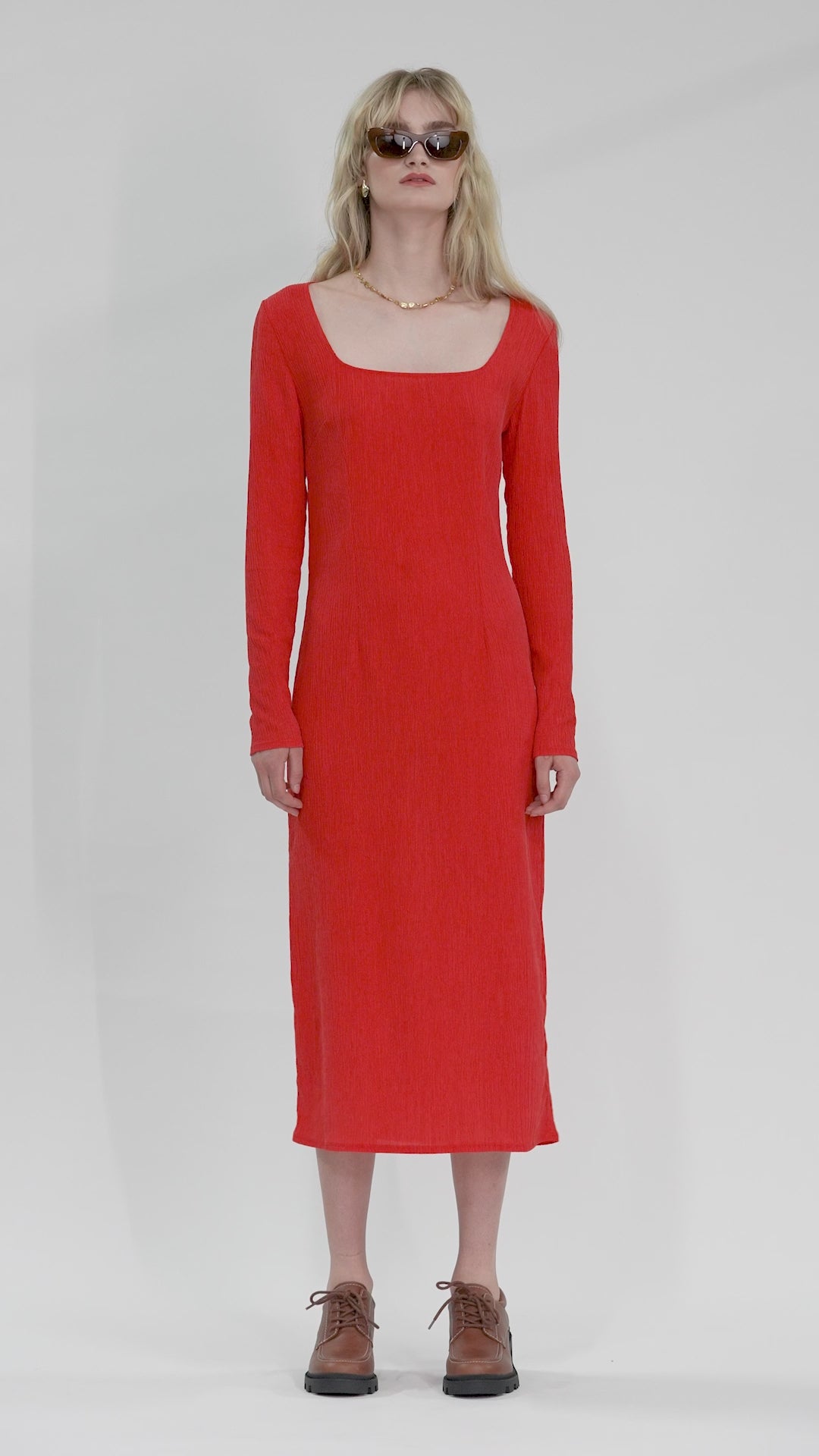 The Joki Dress is a long sleeve midi-length design featuring a soft square neckline. Made from a specialty textured pleated fabric blend with high stretch for comfort. Styled with the Siema Brogue.