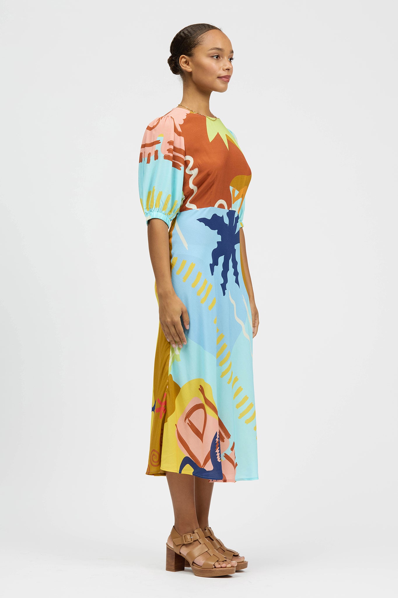 The Leo Midi Dress is a midi-length dress with a skirt cut on the bias for a flattering fit. It has gathered sleeves and is made from a soft rayon and viscose blend.