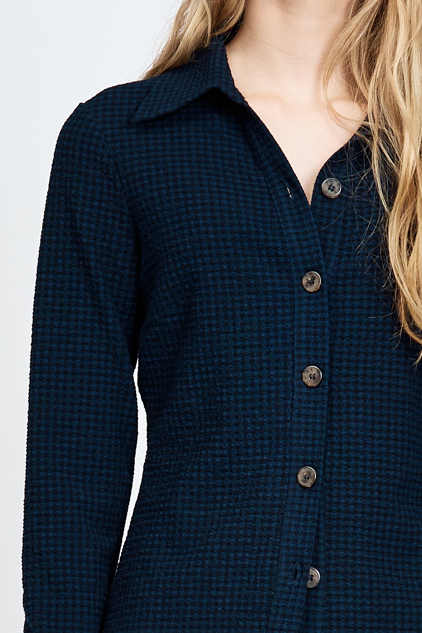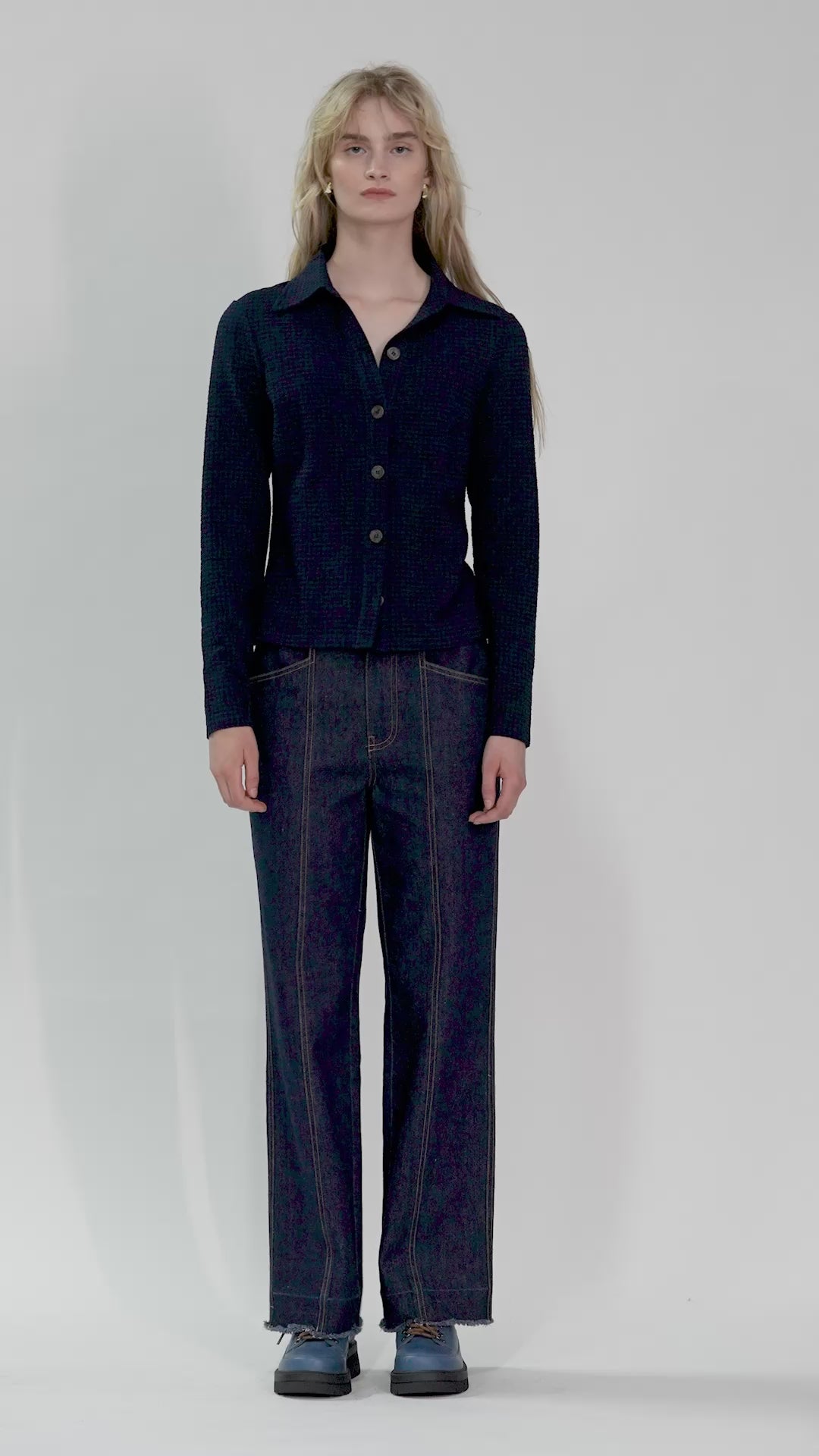 The Sade Shirt is a long sleeve design with tortoiseshell button-down front detailing. Made in a soft, specialty textured check fabric. Styled with the Vantaa Jean and Vire Shoe.