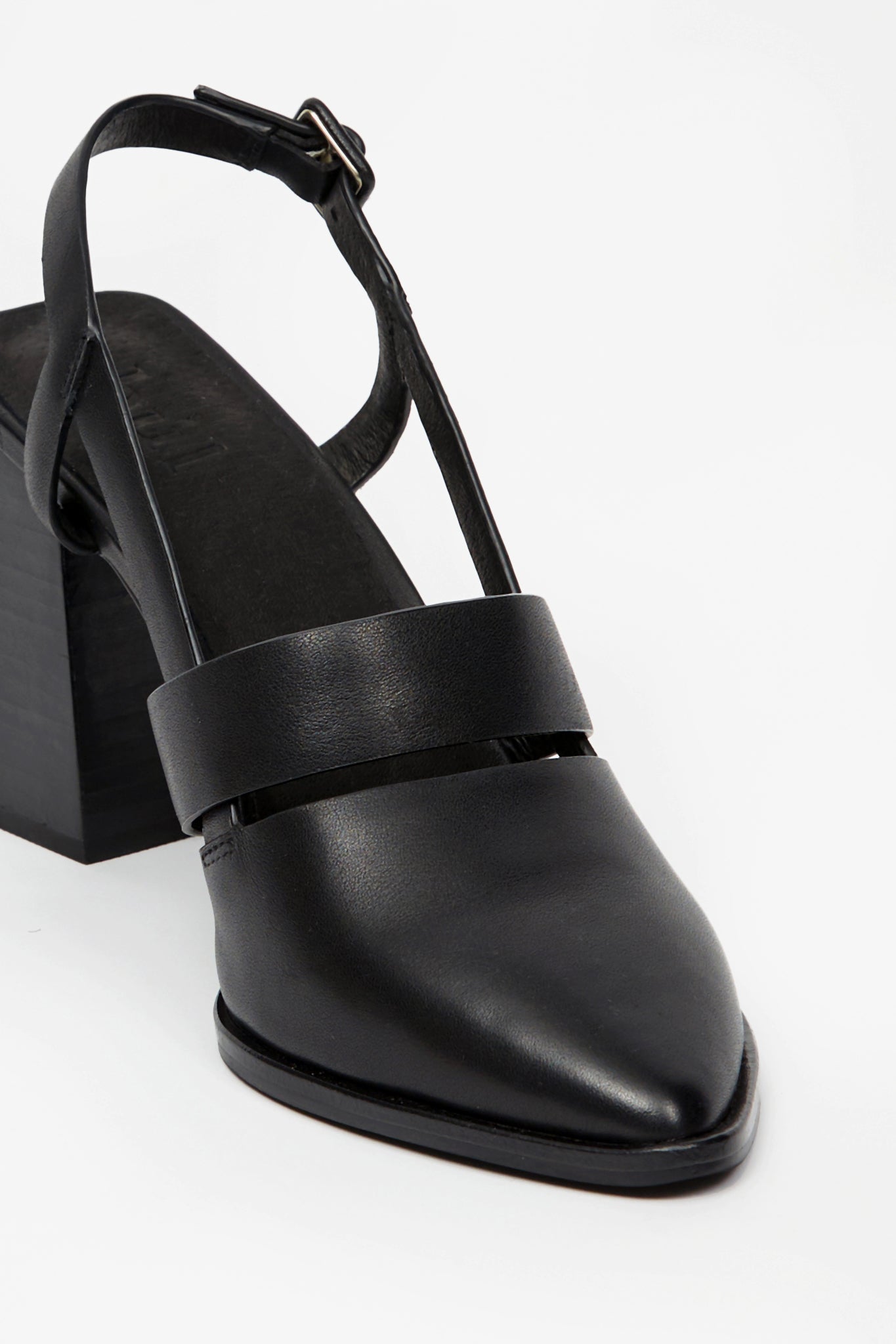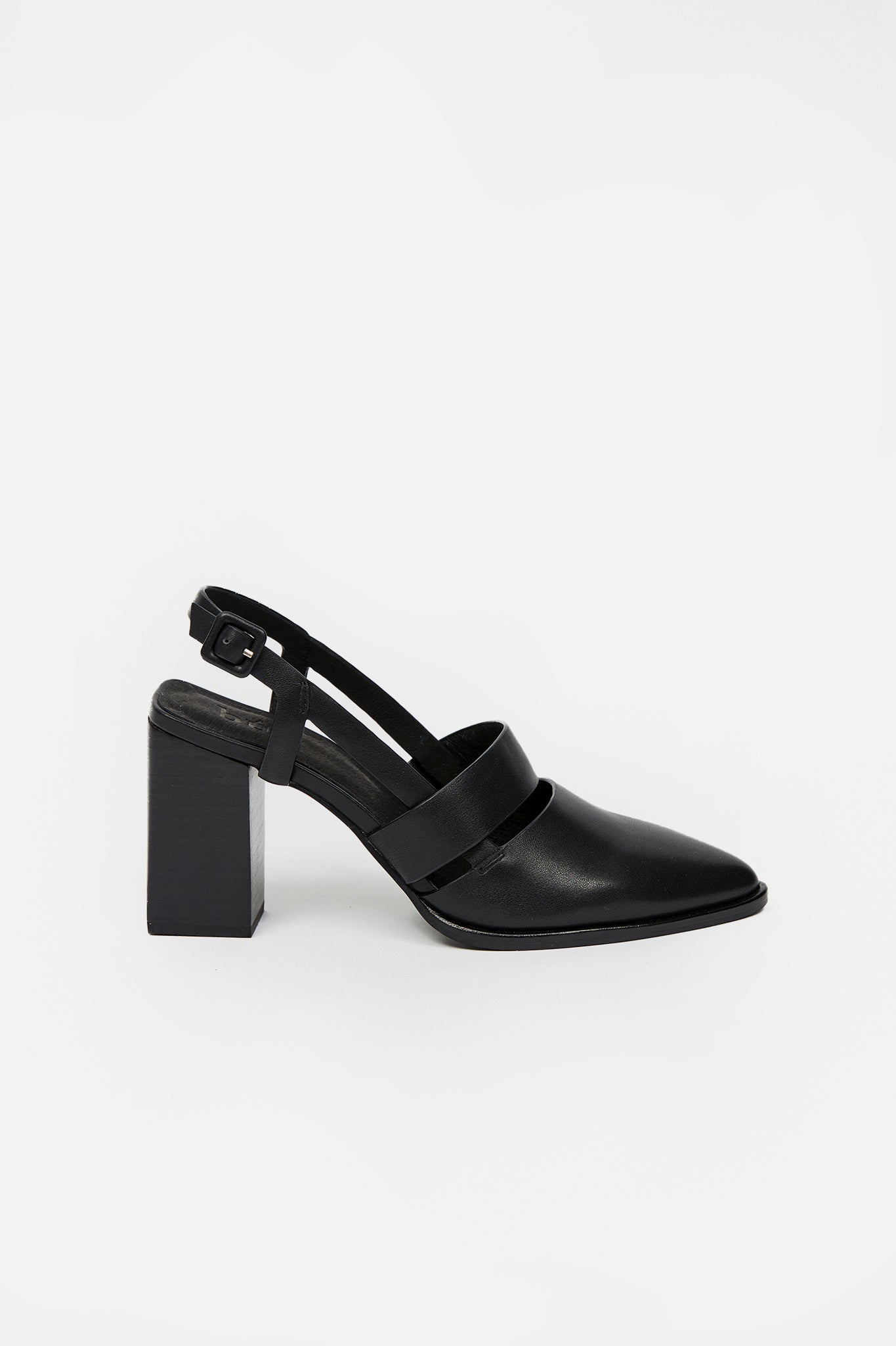 The Bitna Heel is a pointed closed-toe style with a wood-look block heel. Features include an ankle strap, self-covered buckle and a cut-out detail across the upper. Made in smooth leather.