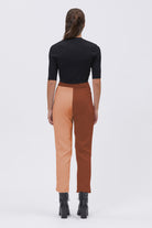 The Brigue Pant is a cigarette style that has a cropped length, high-waist, front pleats and a side zip closure. Features contrast coloured panelling and a split at the hem edge.