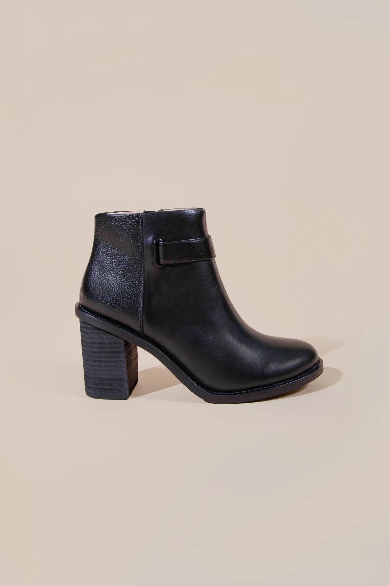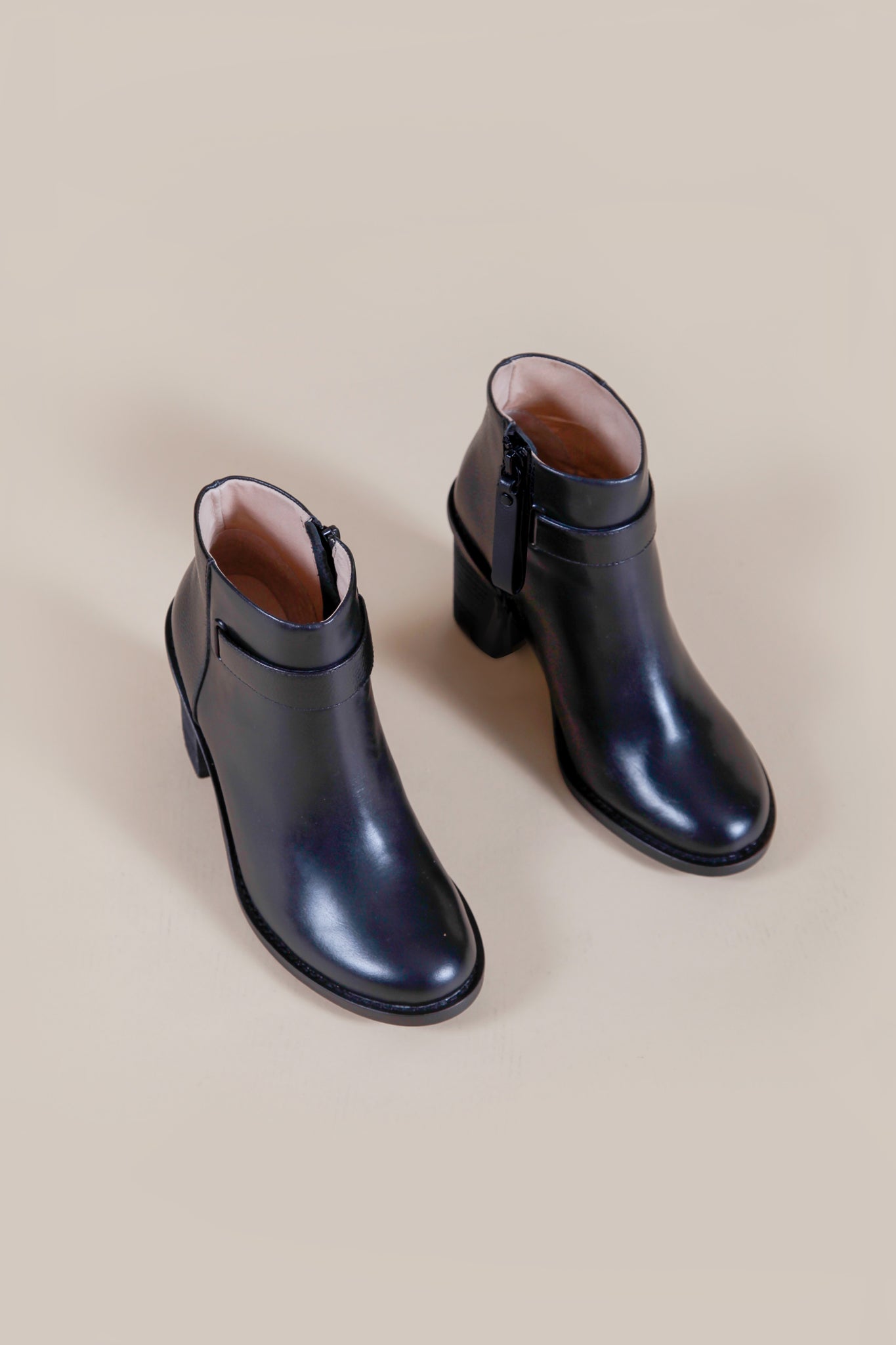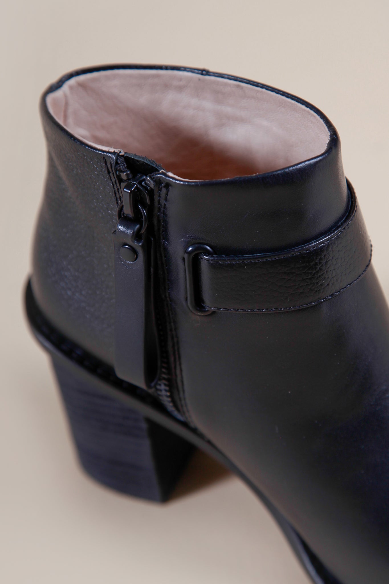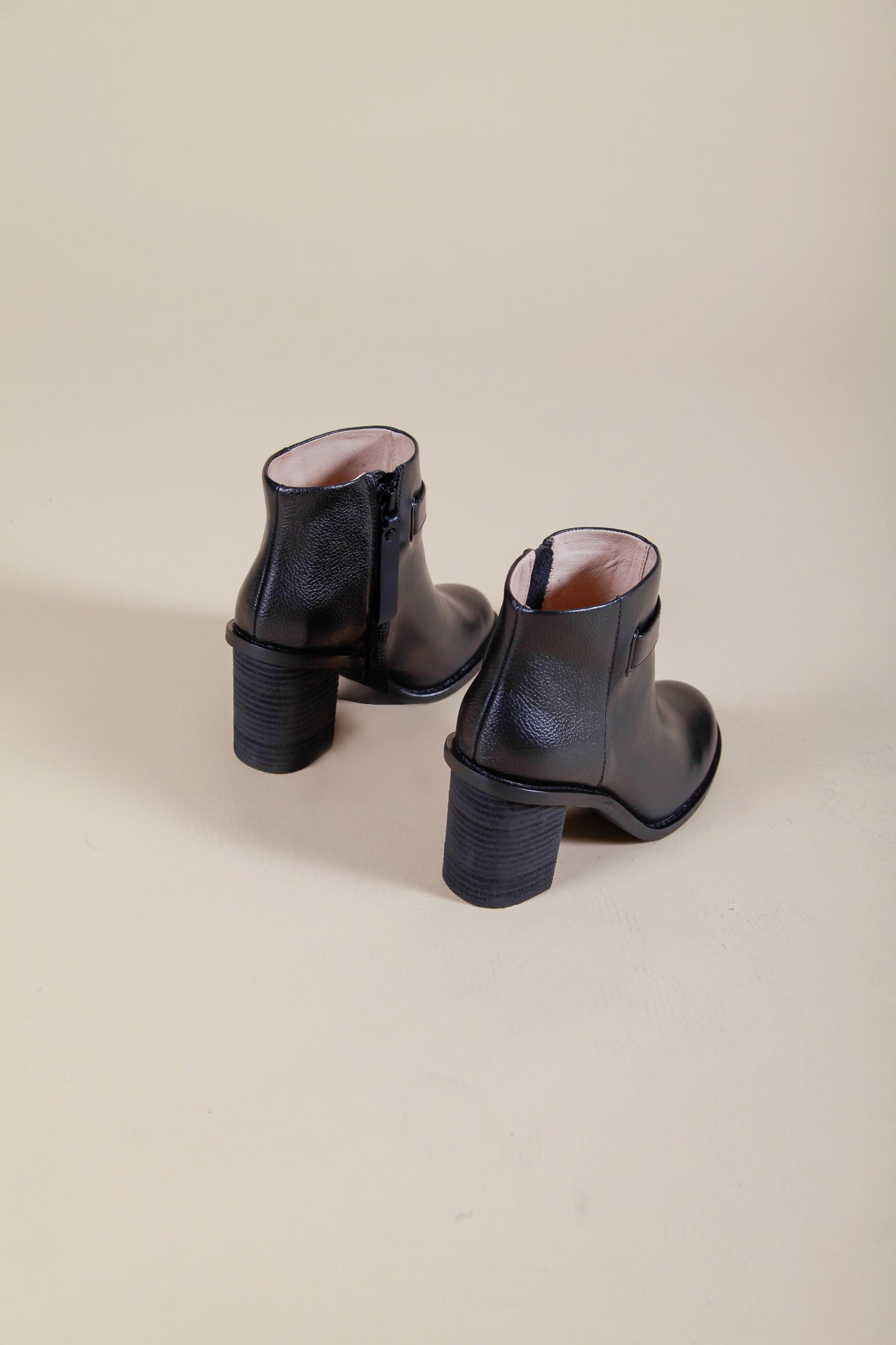 the duchamp boot is a round toy heeled boot with an 8cm heel. it features a front belt detail, and side zip closure.