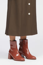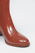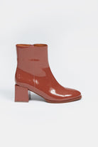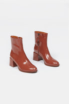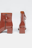 The Ett Ankle Boot is a round-toed style with a self-covered block heel. This style features a front seam detail and an inner leg zip. Made in glossy, patent leather and lined in a camel colour leather inner.