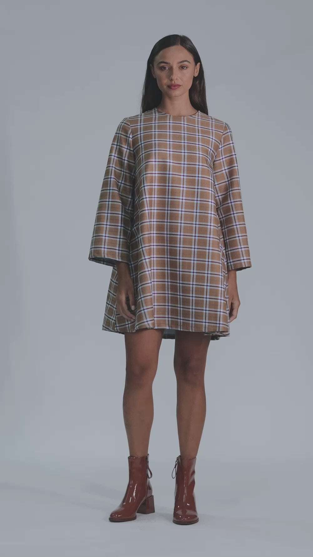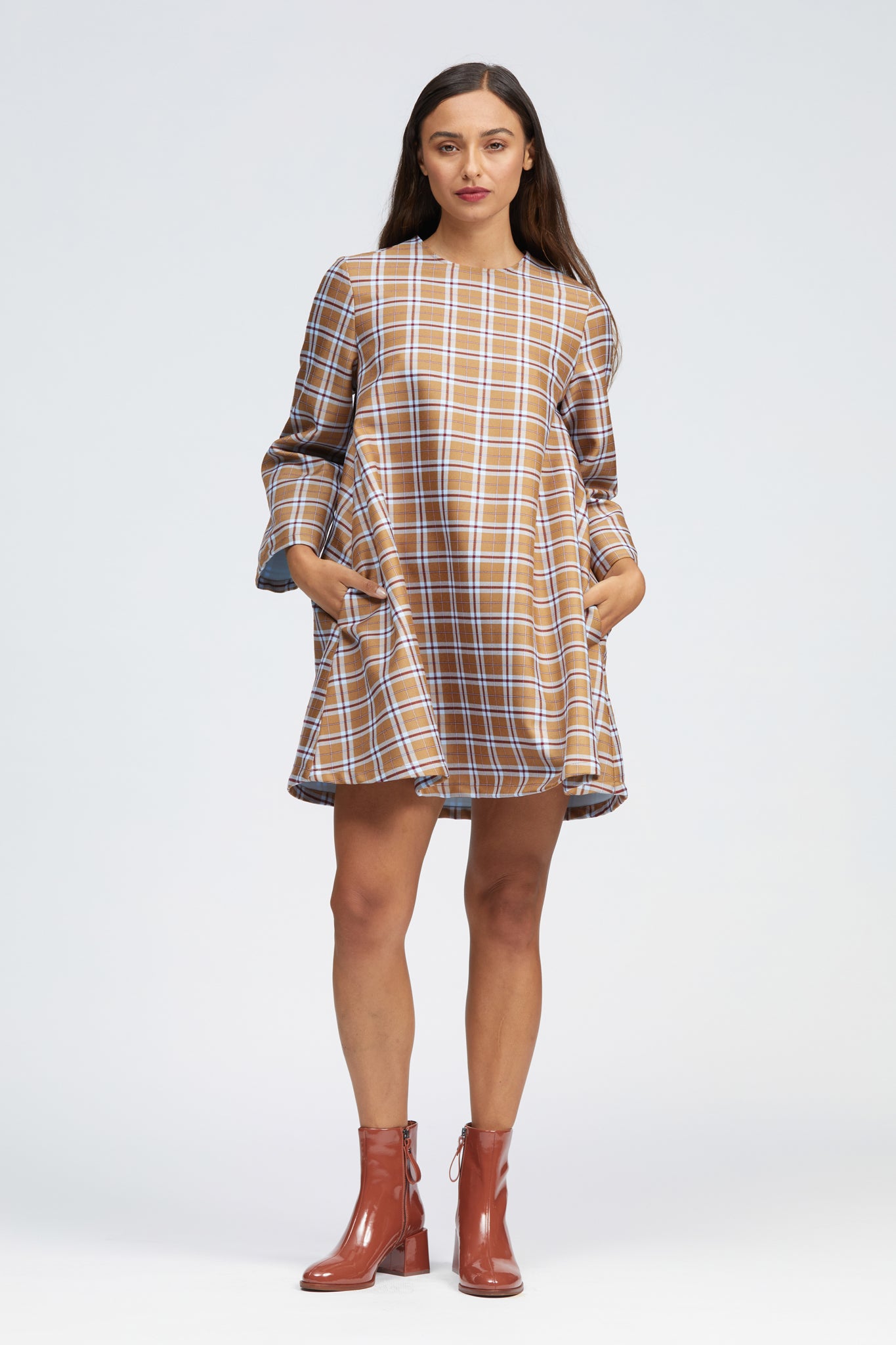 The Fala Dress is an a-line, mini-length shift dress with an oversized fit. This style offers bell sleeves and inseam pockets. Made with a structured Tencel blend check with interior blue fusing. This style can be paired back with your existing wardrobe favourites or with the Traf Pant in matching fabric as a set.