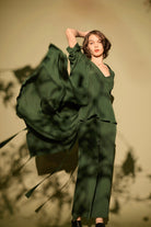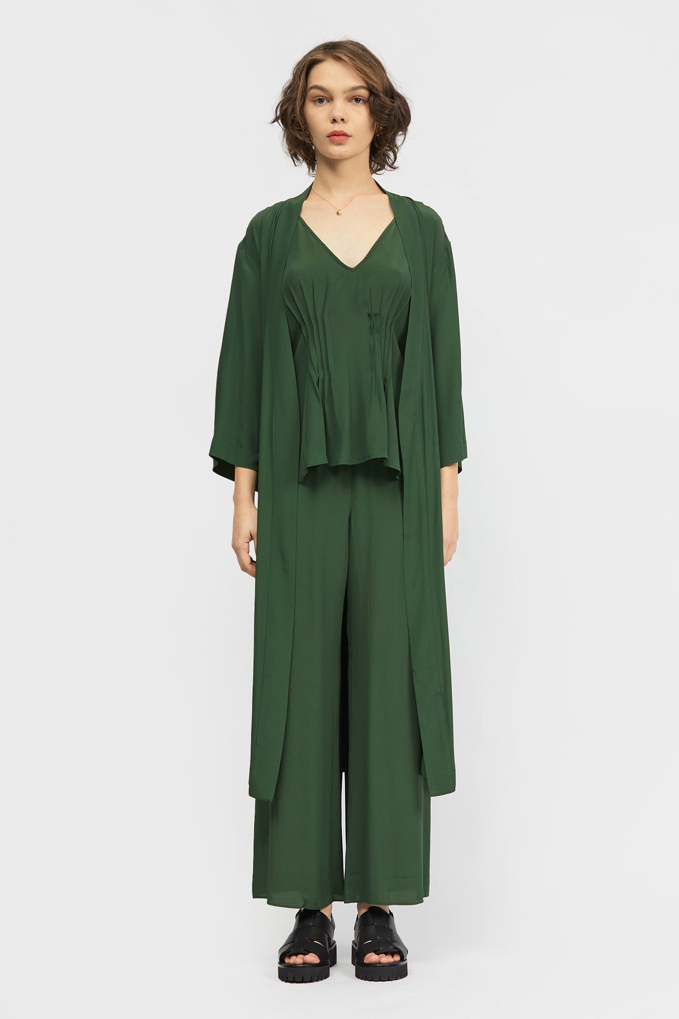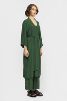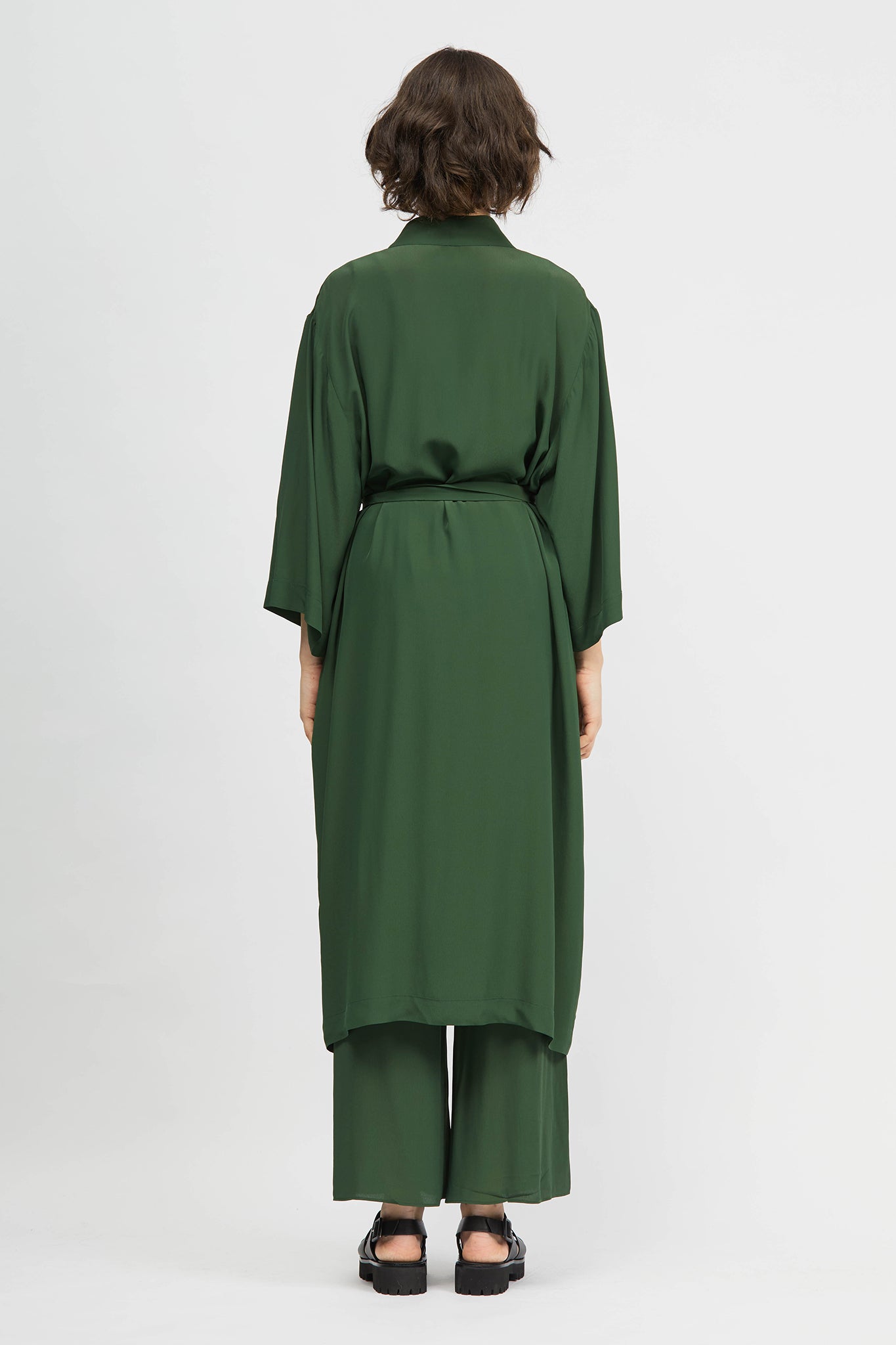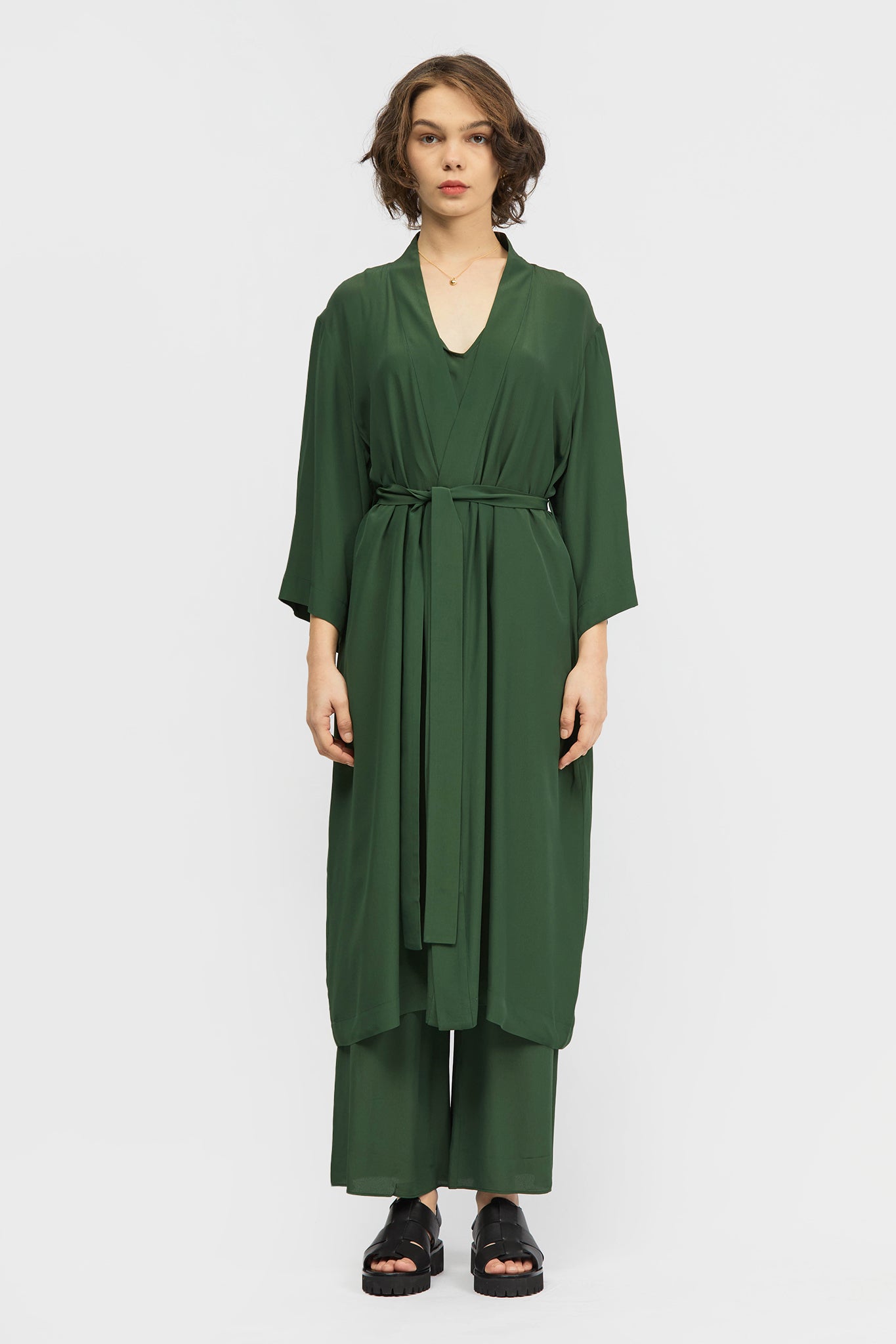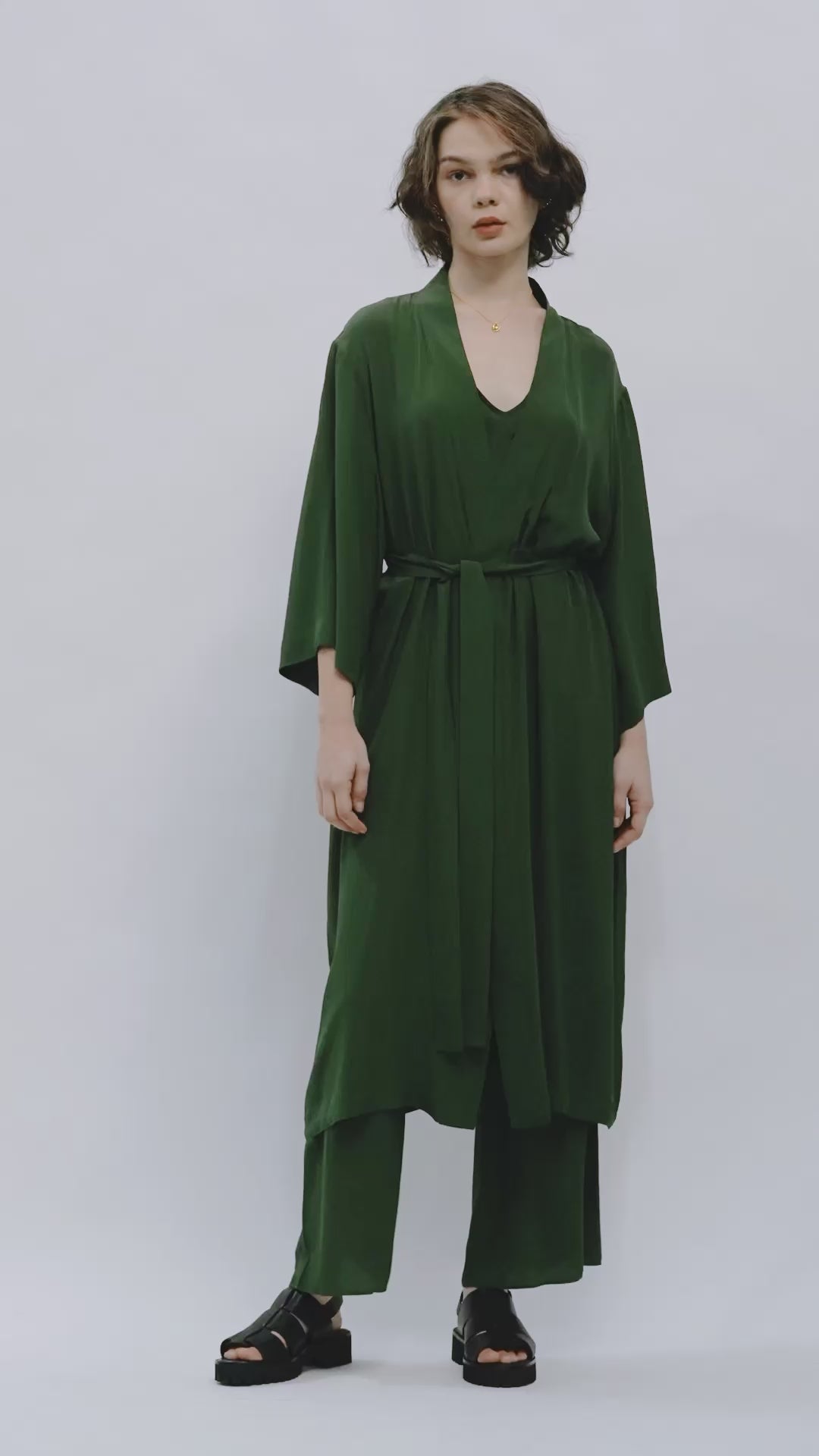 The Gamsa Robe is a mid-length, wrap style with a relaxed fit and wide sleeves. This style offers a detachable tie-up belt and inseam pockets. Made from a soft and flowy acetate blend.