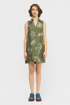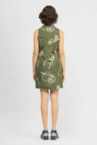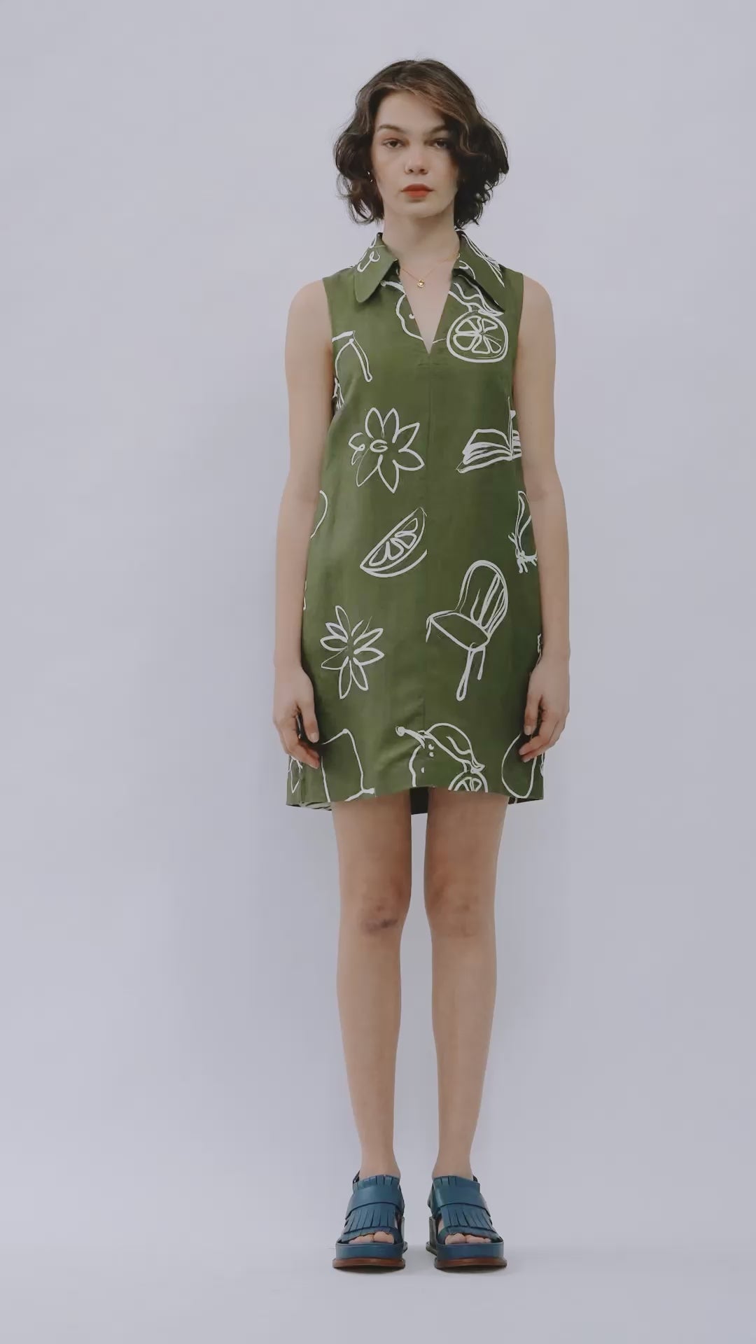 The Gicha Dress is an A-line, sleeveless, mini-length style in a relaxed fit. This style offers an open collar, V-neckline and inseam pockets. Made from a soft linen/ viscose blend in búl’s in-house designed Bom Print.