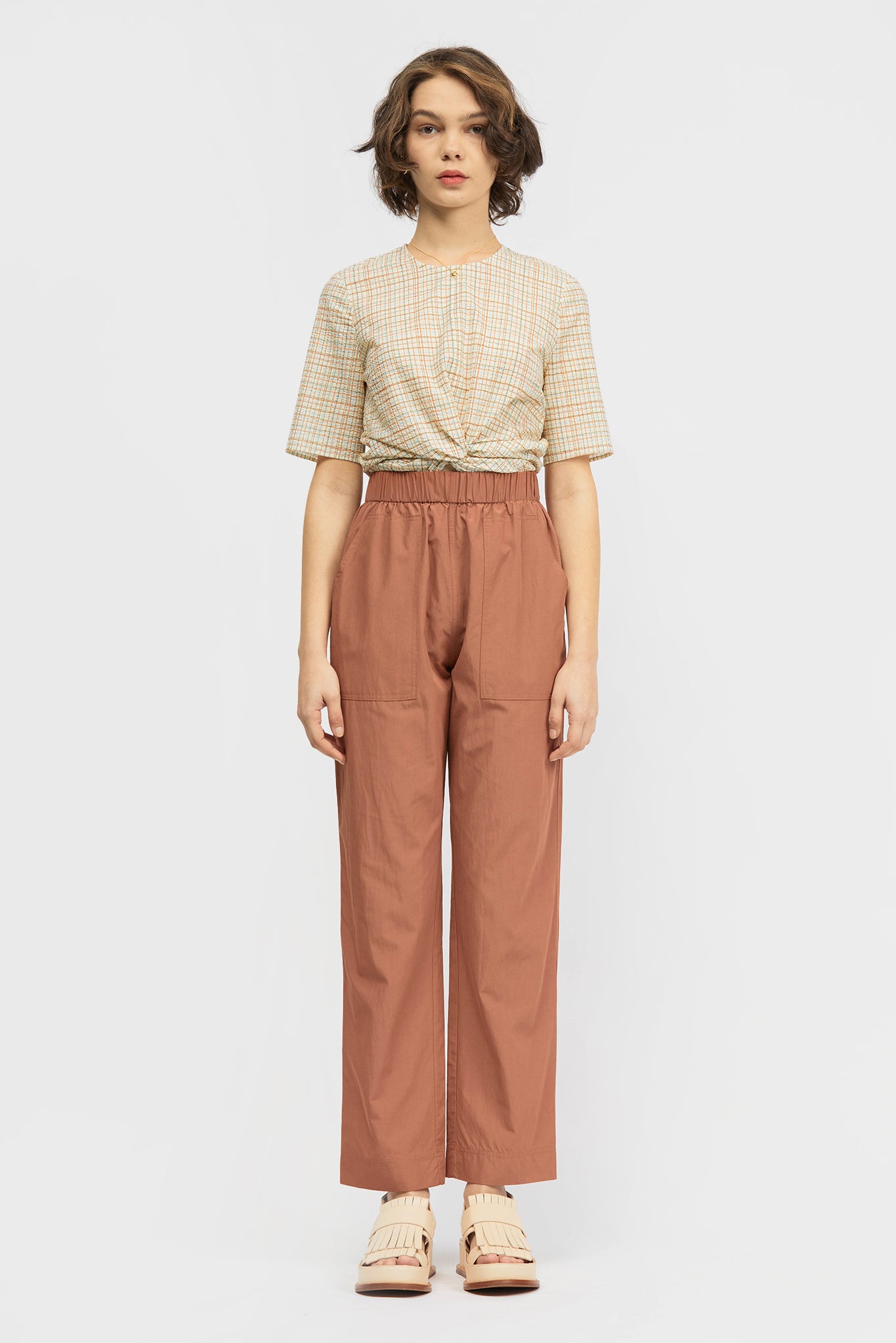 The Hwaga Pant is a full-length, high-waisted, straight leg style in a regular fit. Features include a wide elasticated waistband, large slanted patch pockets and topstitch detailing. This style is made in a lightweight viscose/cotton blend.