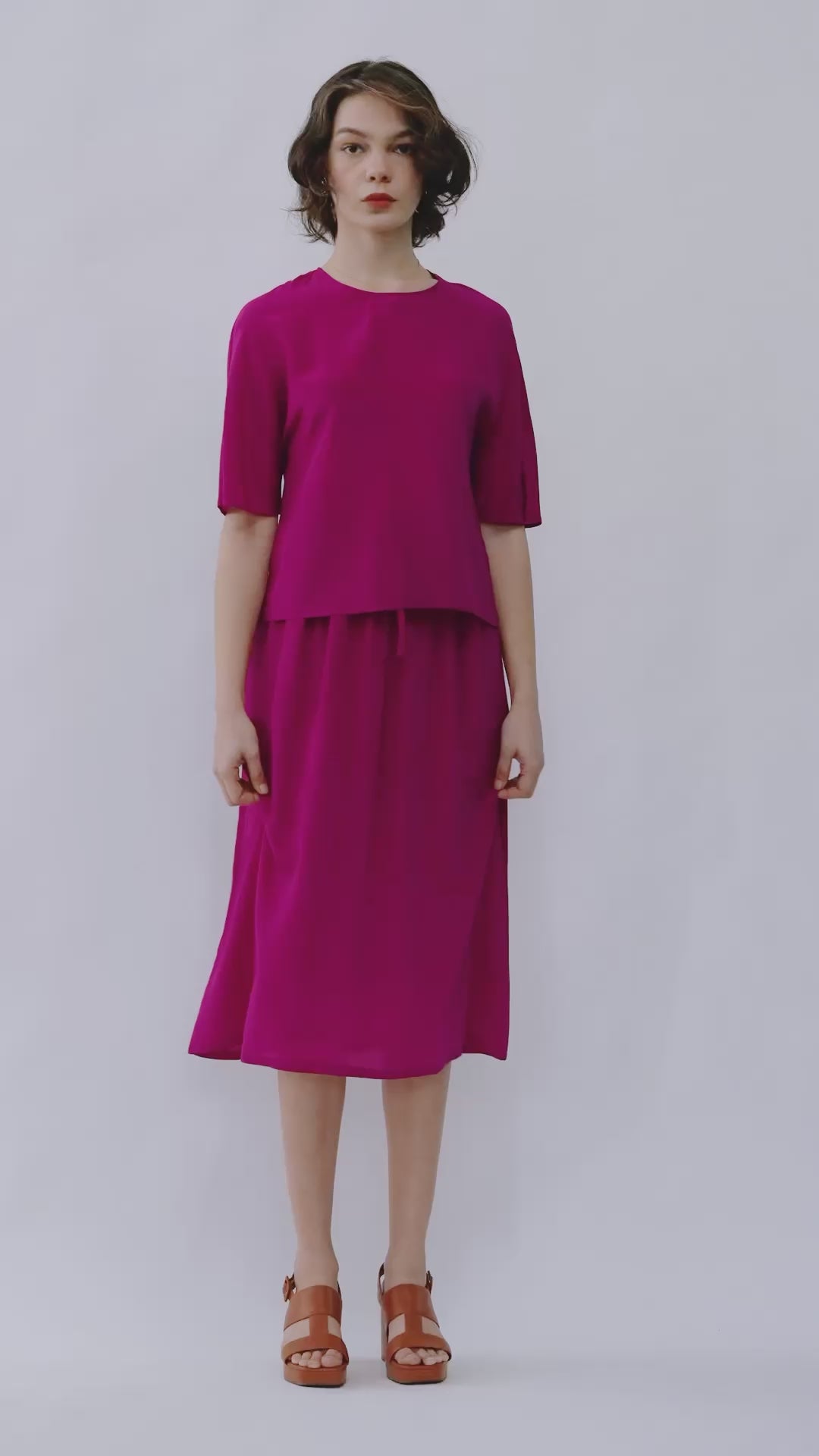 The Joa Top is a short sleeve, relaxed fit style. Features include a round neckline, back neck keyhole and button detail and batwing style sleeves. Made in a smooth crepe de chine silk. This style can be paired back with your existing wardrobe favourites or with the Bingsu Skirt in matching fabric as a set.