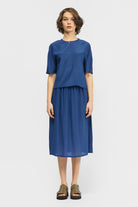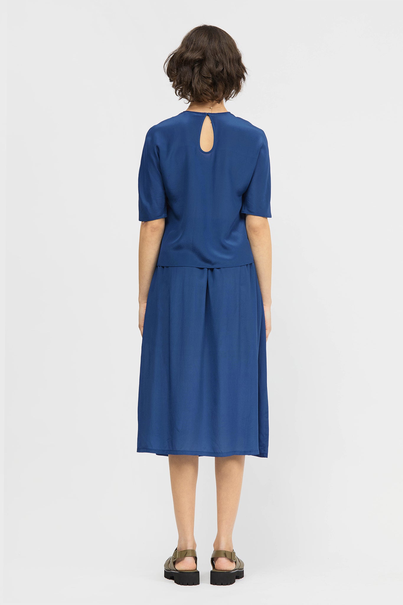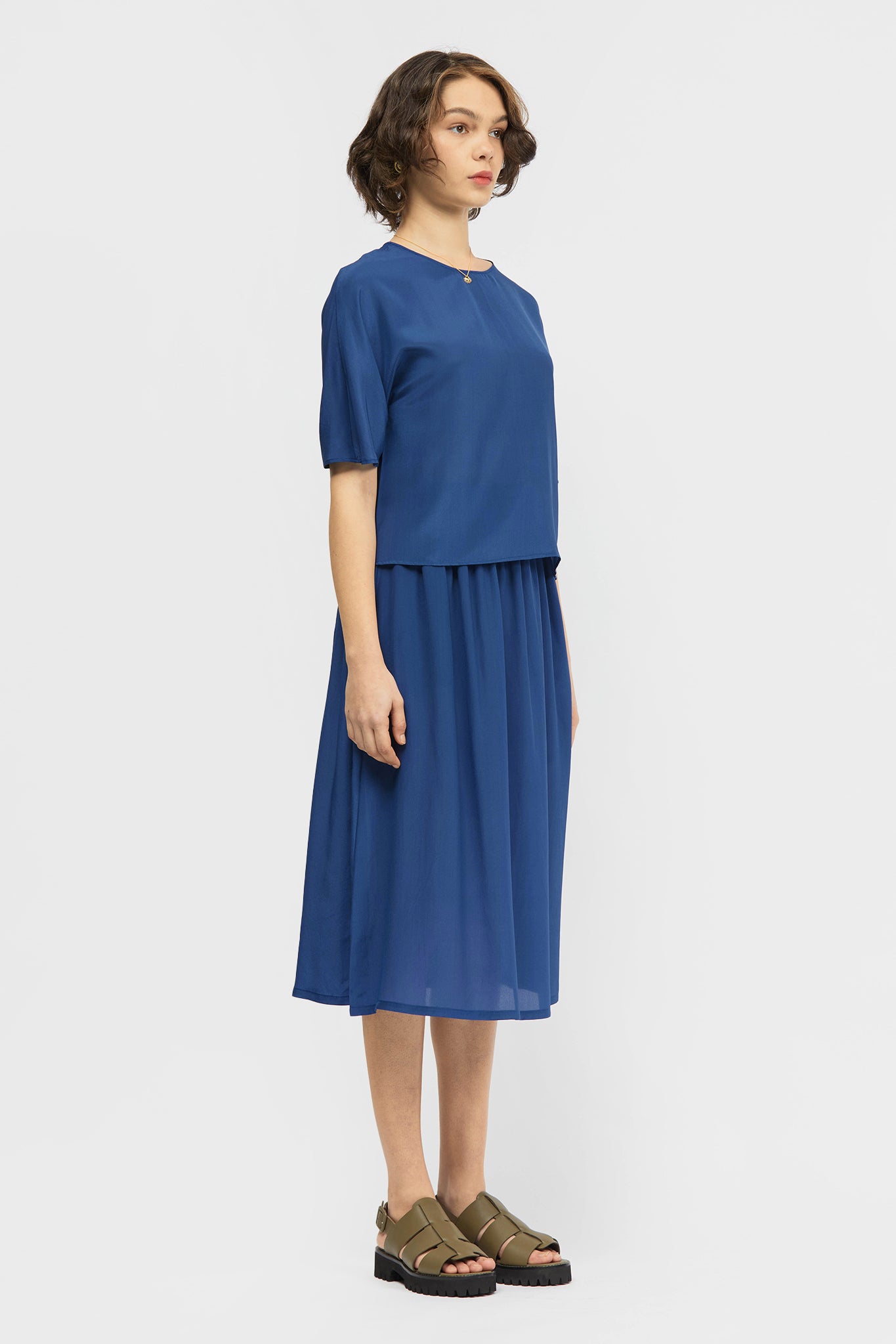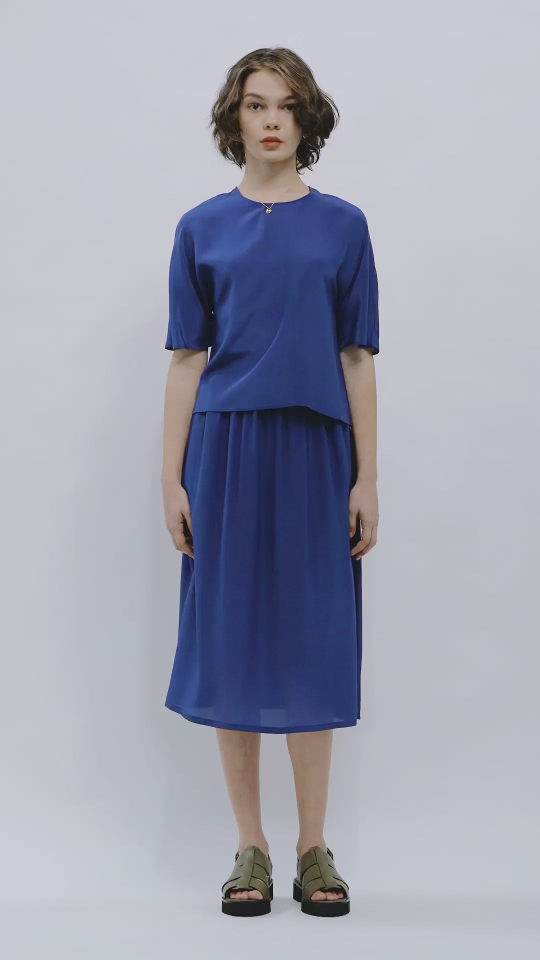 The Joa Top is a short sleeve, relaxed fit style. Features include a round neckline, back neck keyhole and button detail and batwing style sleeves. Made in a smooth crepe de chine silk. This style can be paired back with your existing wardrobe favourites or with the Bingsu Skirt in matching fabric as a set.
