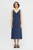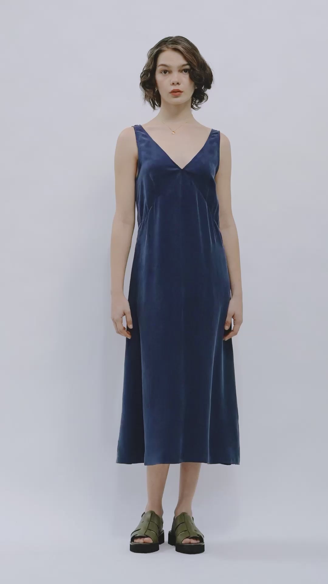 The Josu dress is a sleeveless, mid length style with an A-line silhouette and regular fit. Features include a V-neckline at the front and back and seam detailing around the bust. Made in a soft cupro blend.