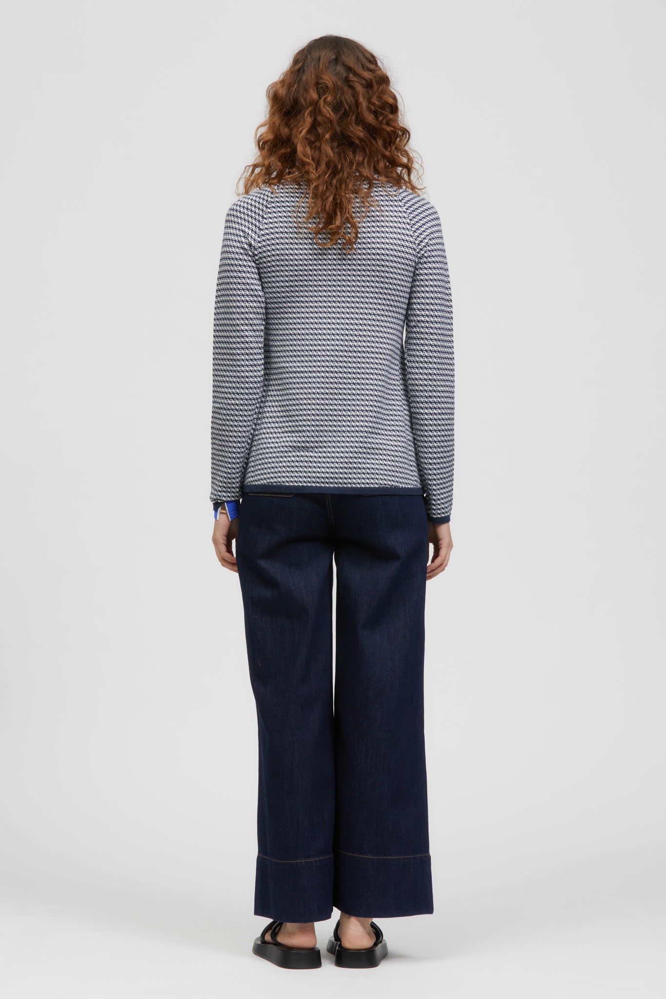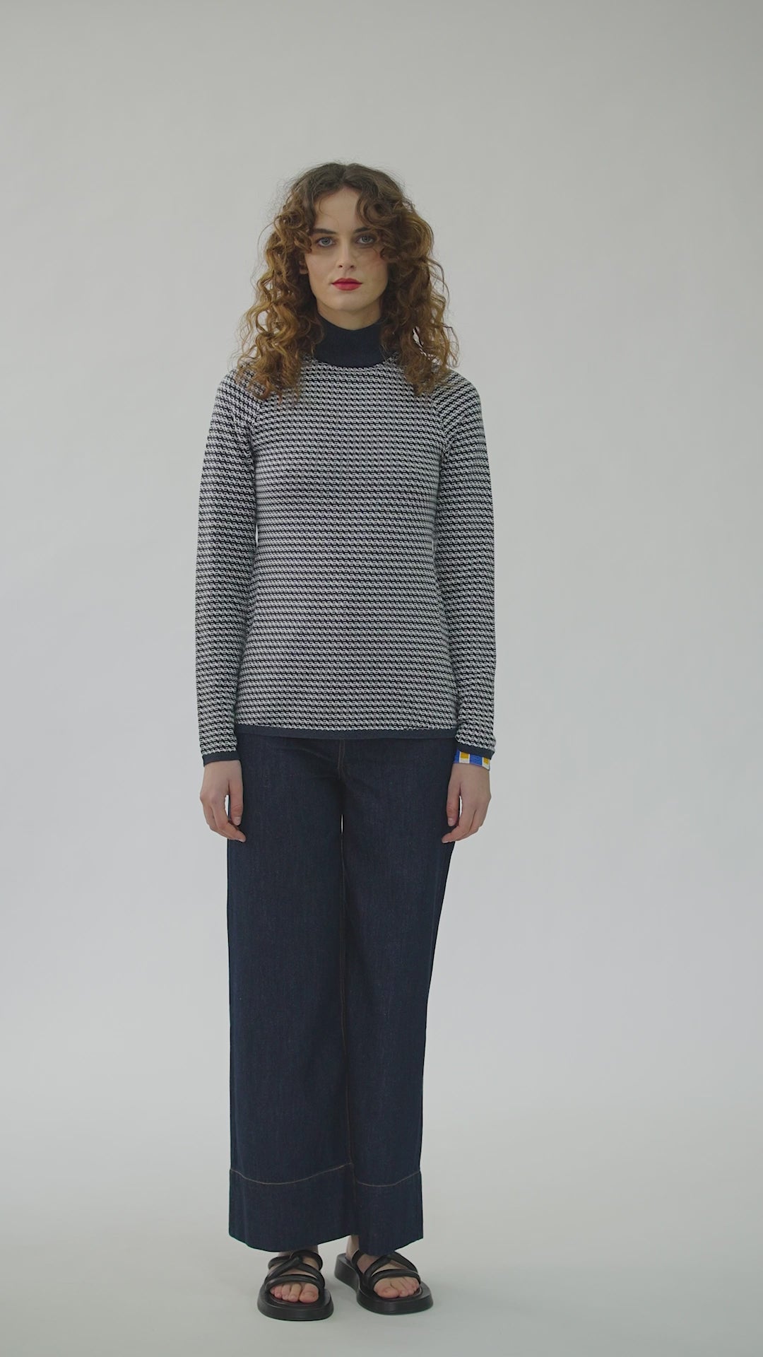 The Lagom Top is a raglan sleeve top, with a checked all over pattern. This style offers a contrast ribbed neckline, full length sleeves and a relaxed fit. Made from a merino wool / cotton blend.
