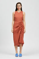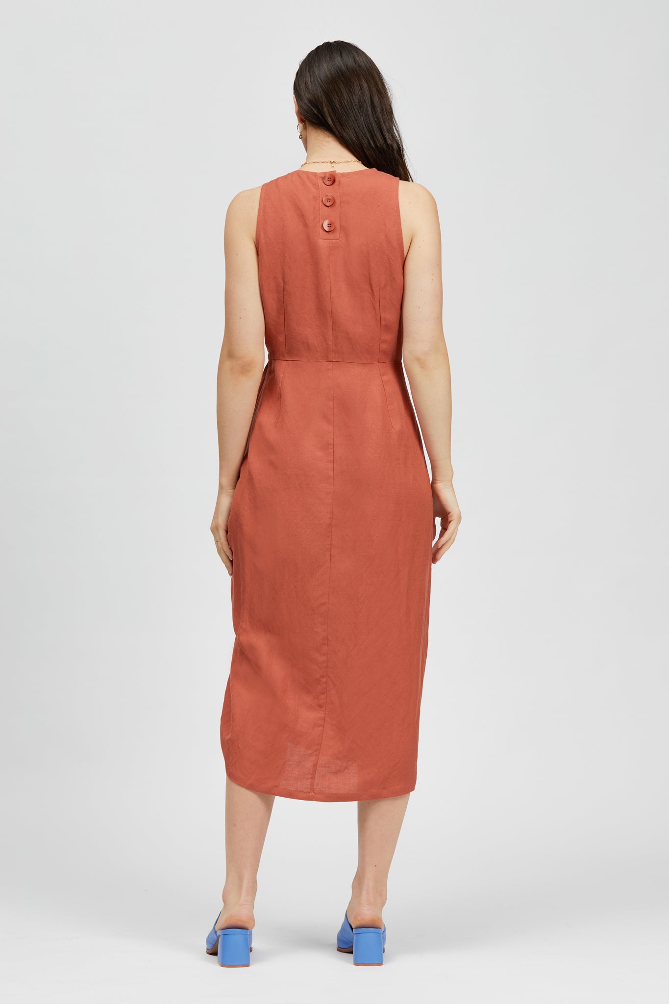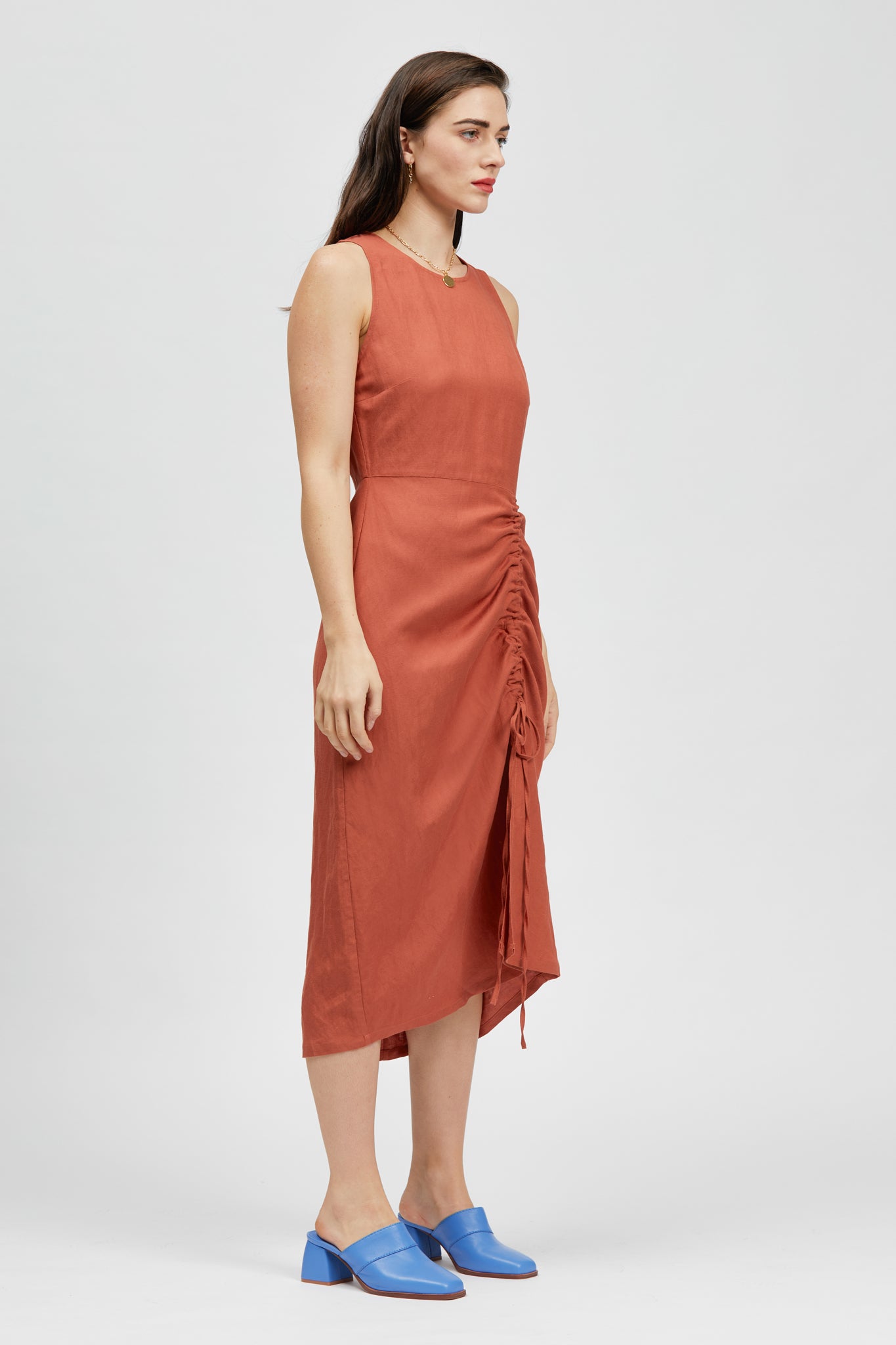 The Mar Dress is a sleeveless, mid-length style with a tailored fit. This style includes dart detailing and a drawstring that offers soft gathering when pulled, opening into a front slit. Made from a soft linen blend.