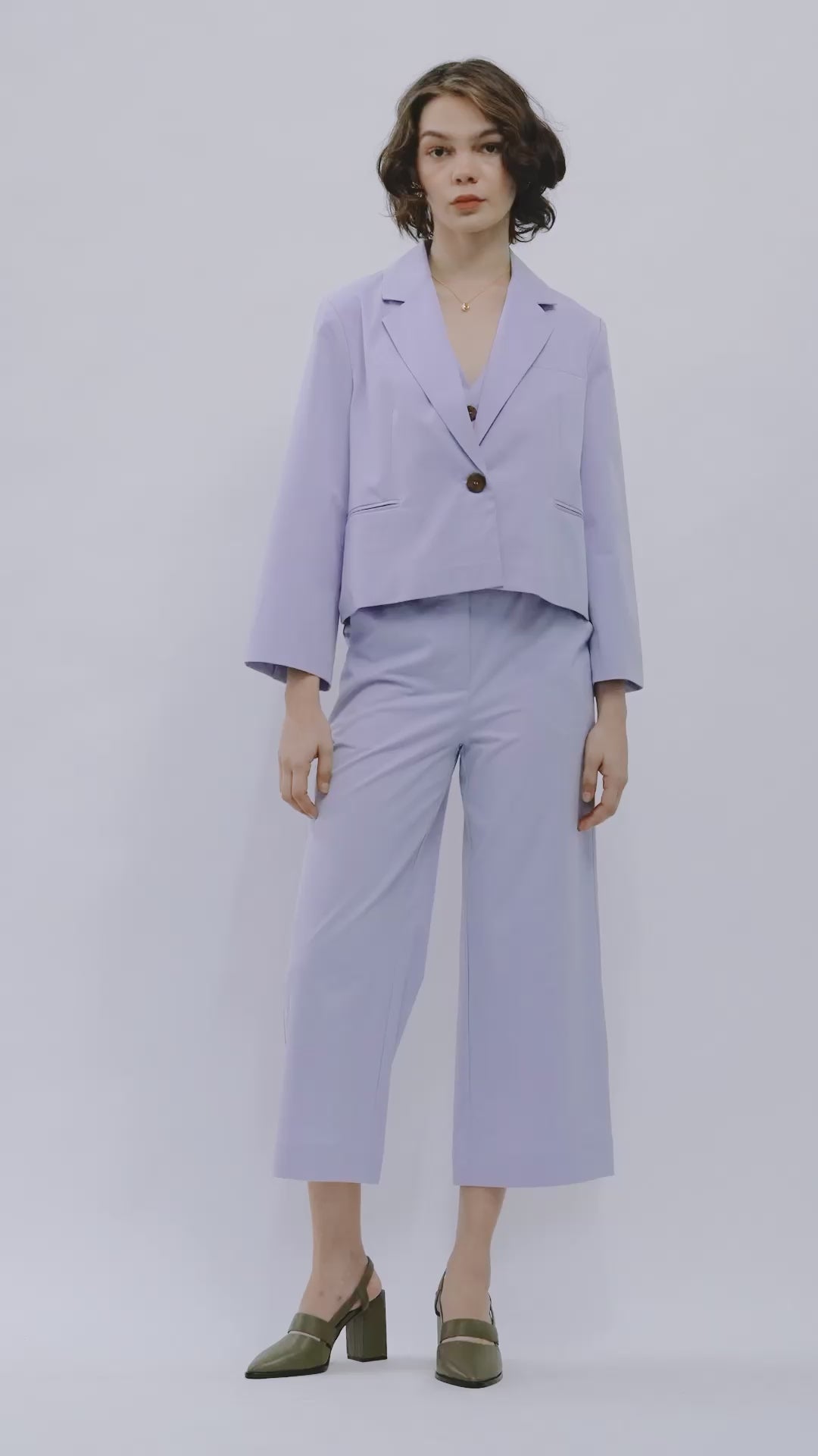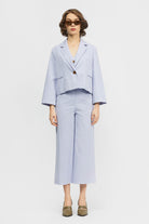 The Minhwa Blazer is a single breasted, cropped- length blazer in regular fit. This style offers a traditional lapel and collar, back vent, functional front welt pockets and an internal breast pocket. Made in a lightweight cotton/ tencel blend and fully lined in soft rayon. This style can be paired back with your existing wardrobe favourites or with the Brisa Pant and Ulster Vest in matching fabric as a set.