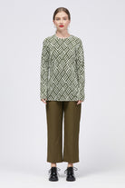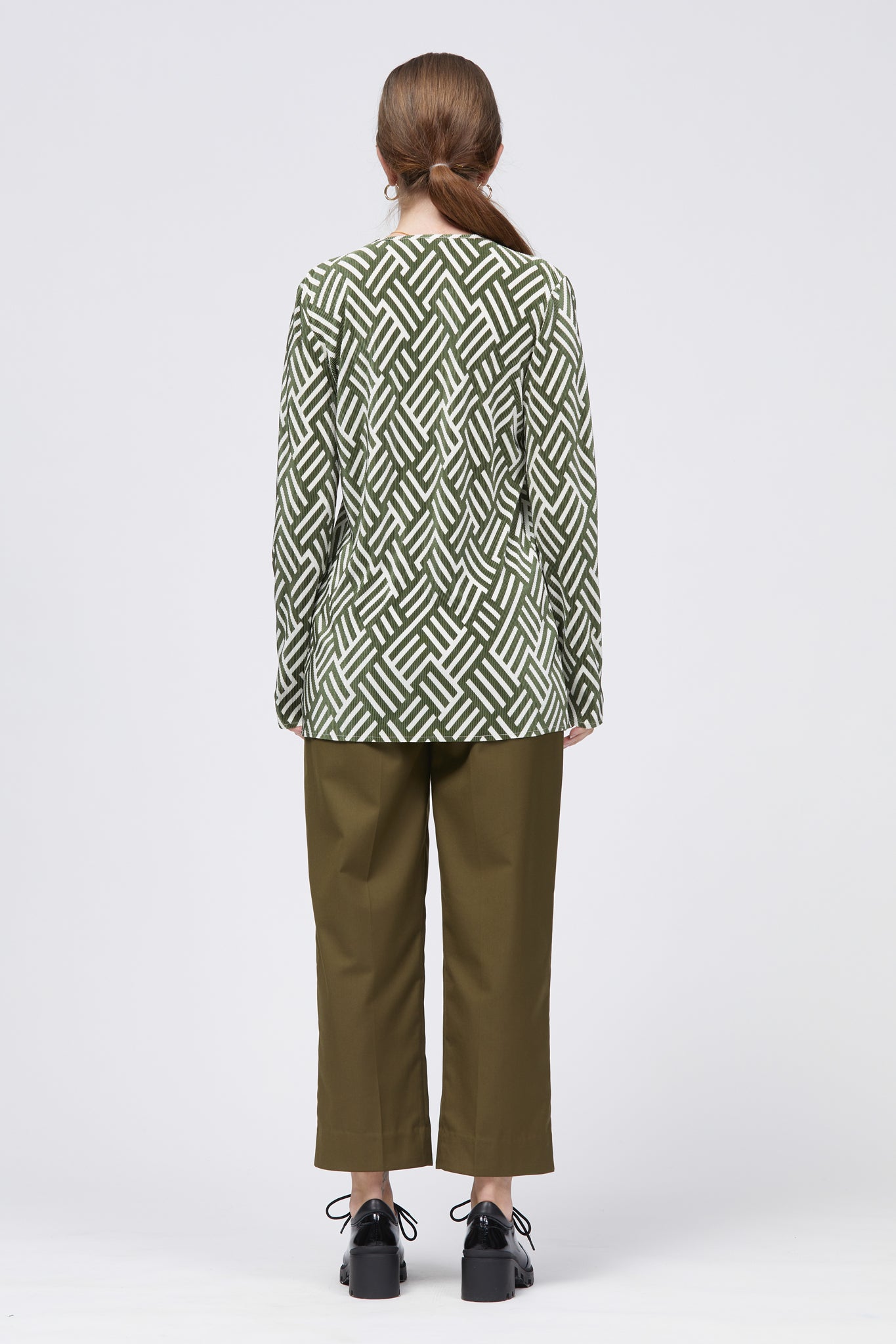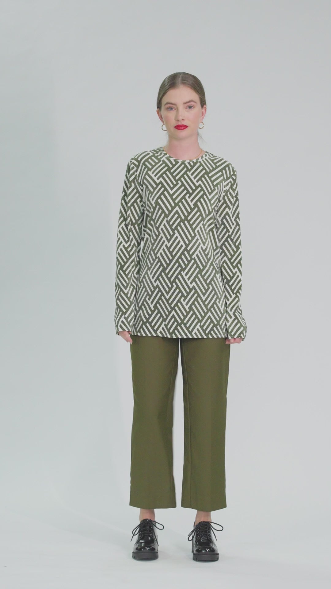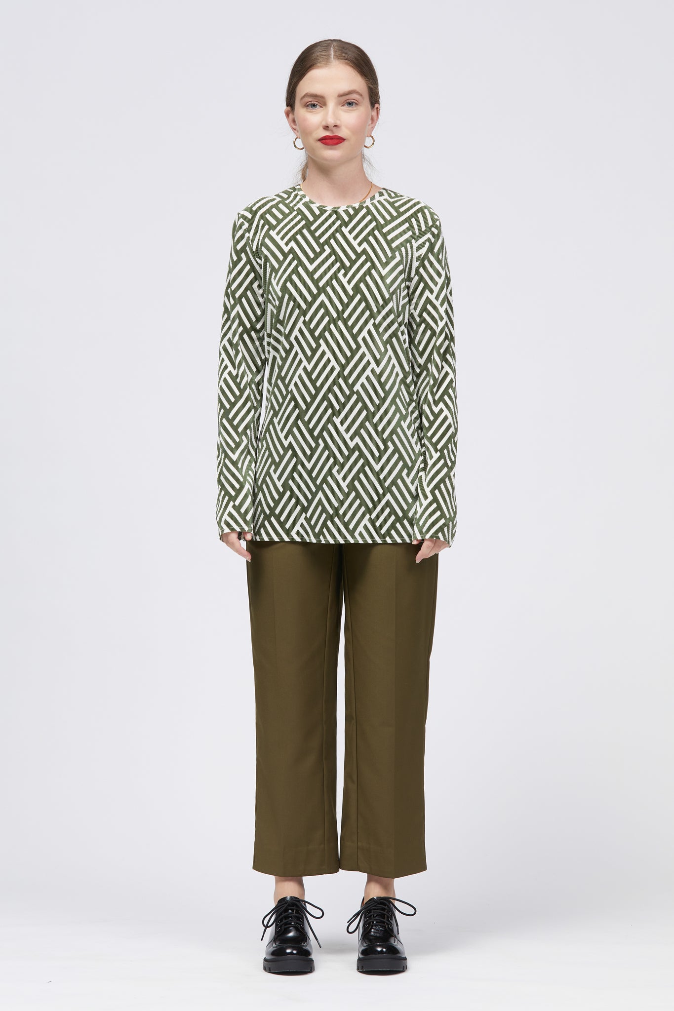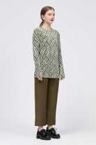 The Morze Top is a relaxed-fit style with full-length sleeves. Made in a smooth pleated Polyester fabrication with a Green/White Print.