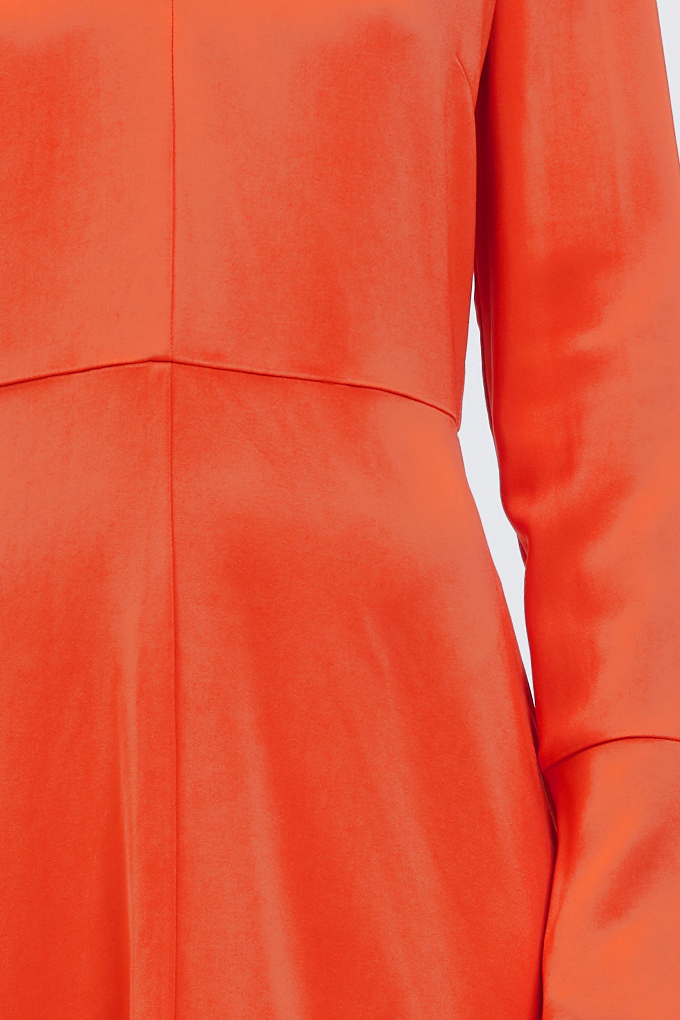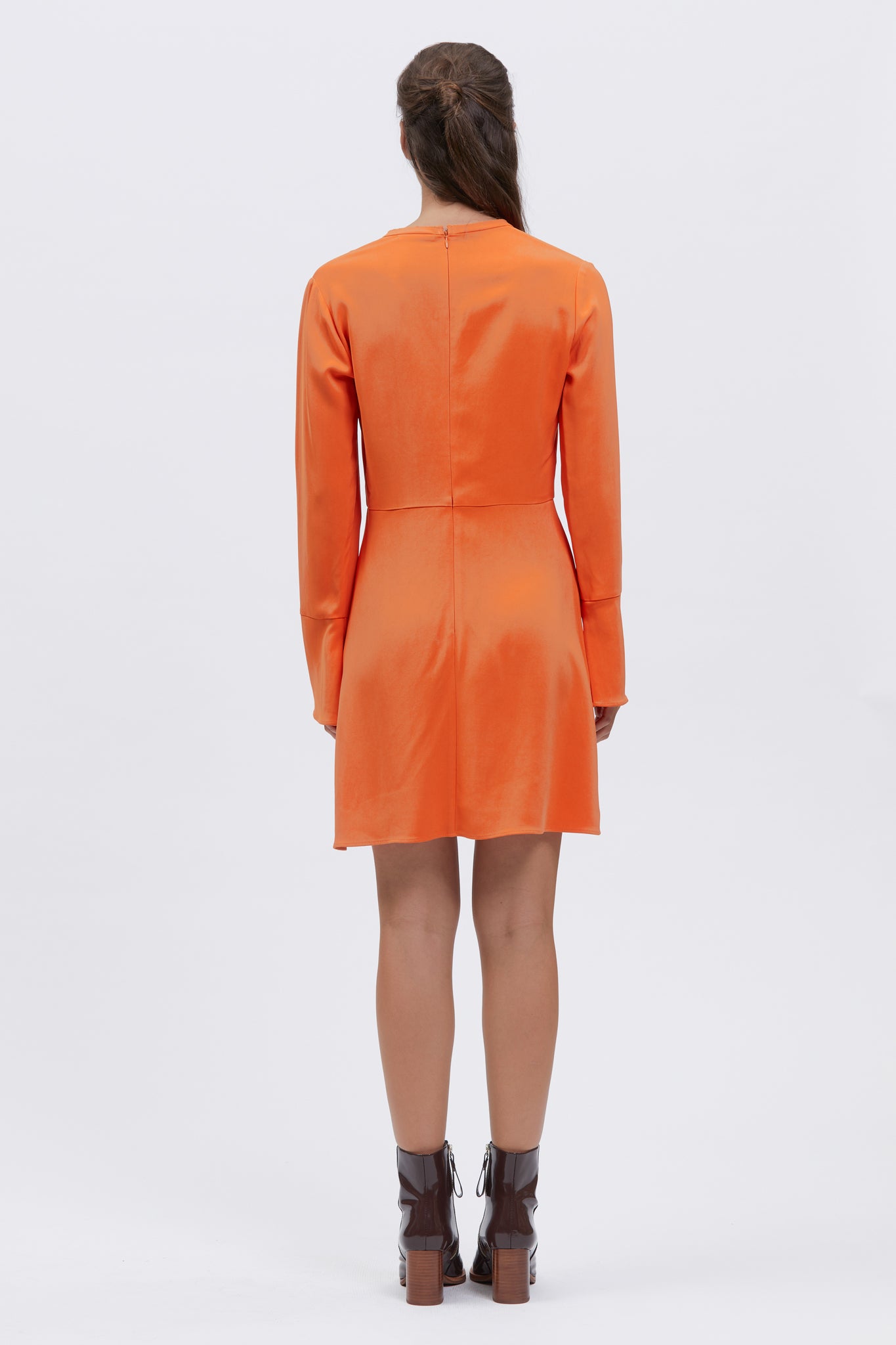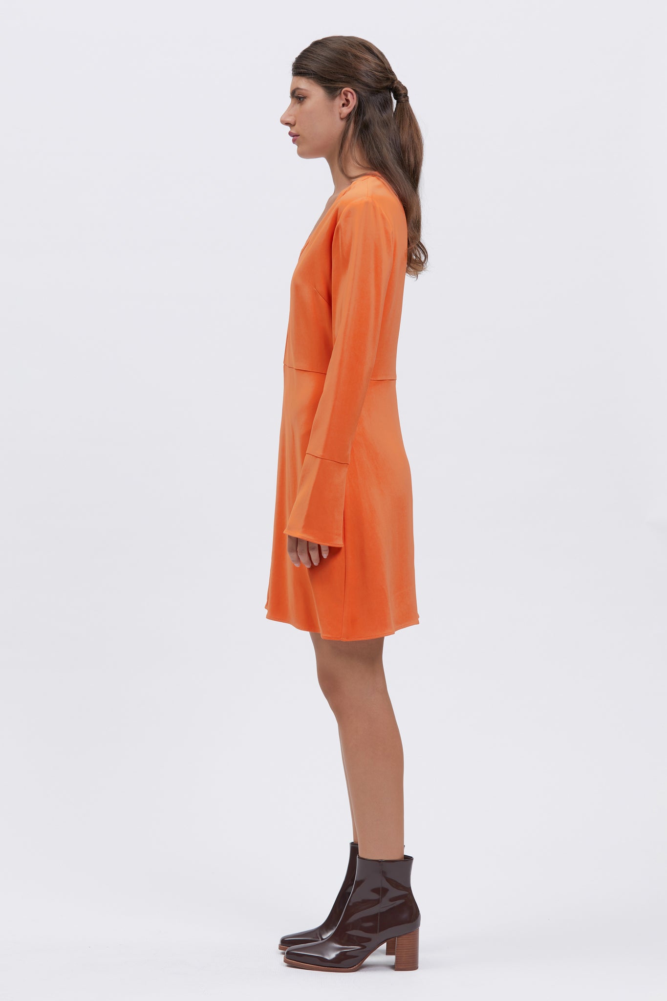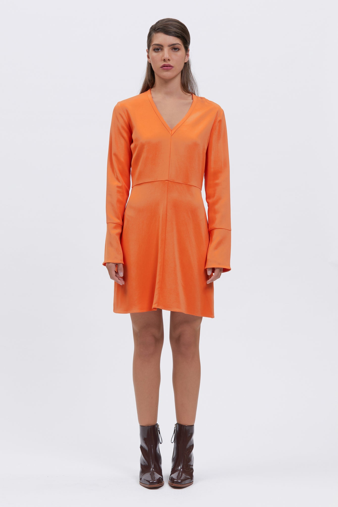 The Nadiu Dress is a relaxed v-neckline style mini dress with exposed trims along the cuffs and neckline, made with a stretchy Viscose blend. The sleeves are an exaggerated length with wide cuffs, that feature box pleats along the inner edge. this style comes in at the waistline, flares out towards the hem, and includes a zip closure along the centre back.