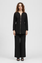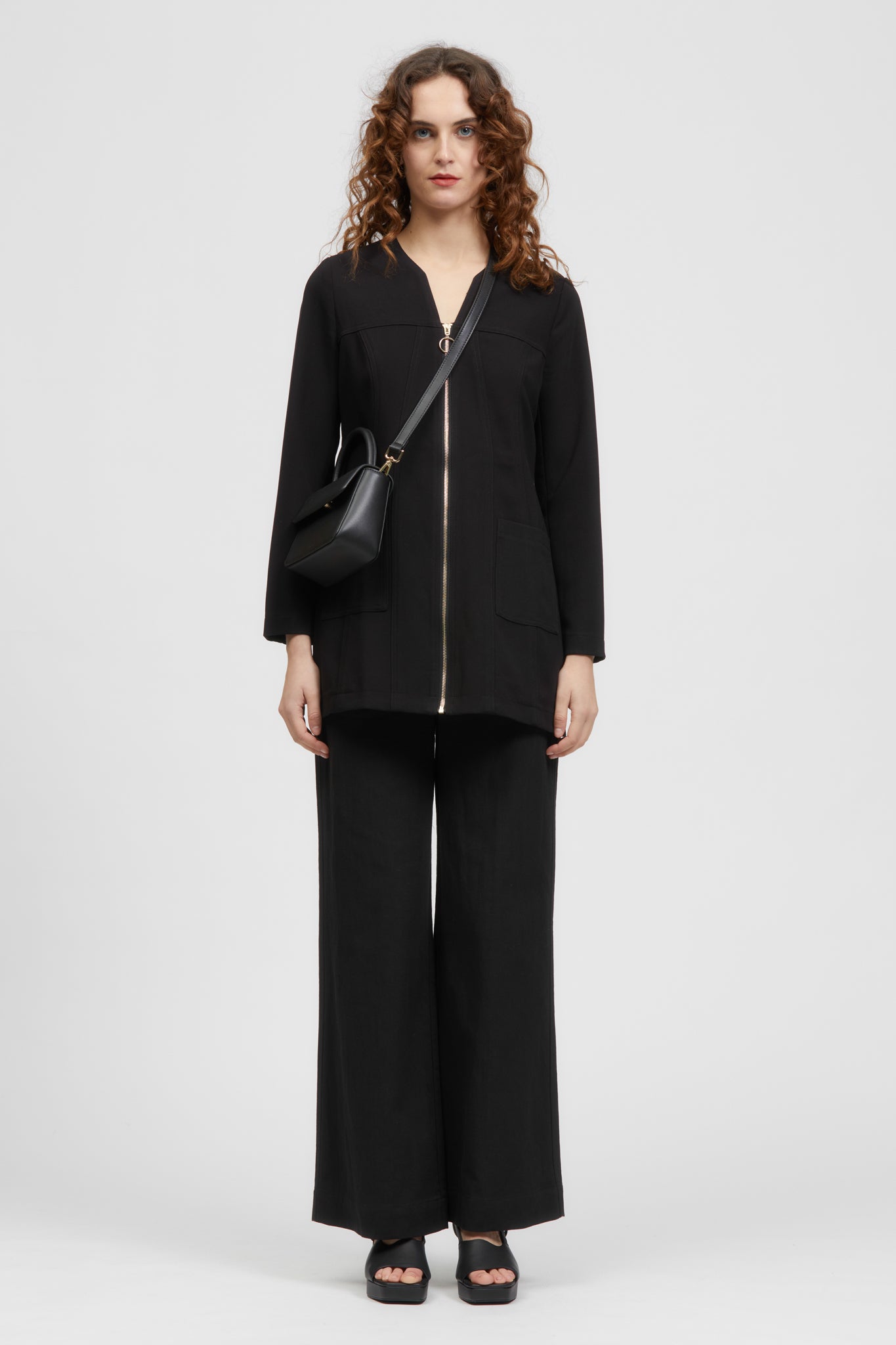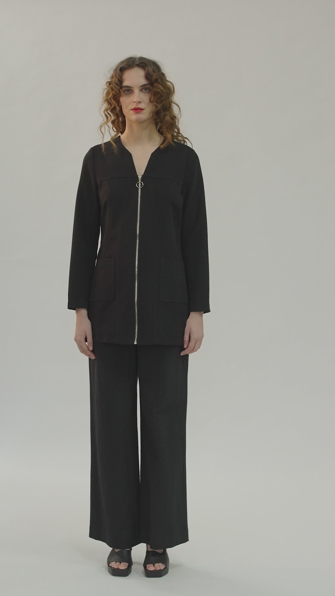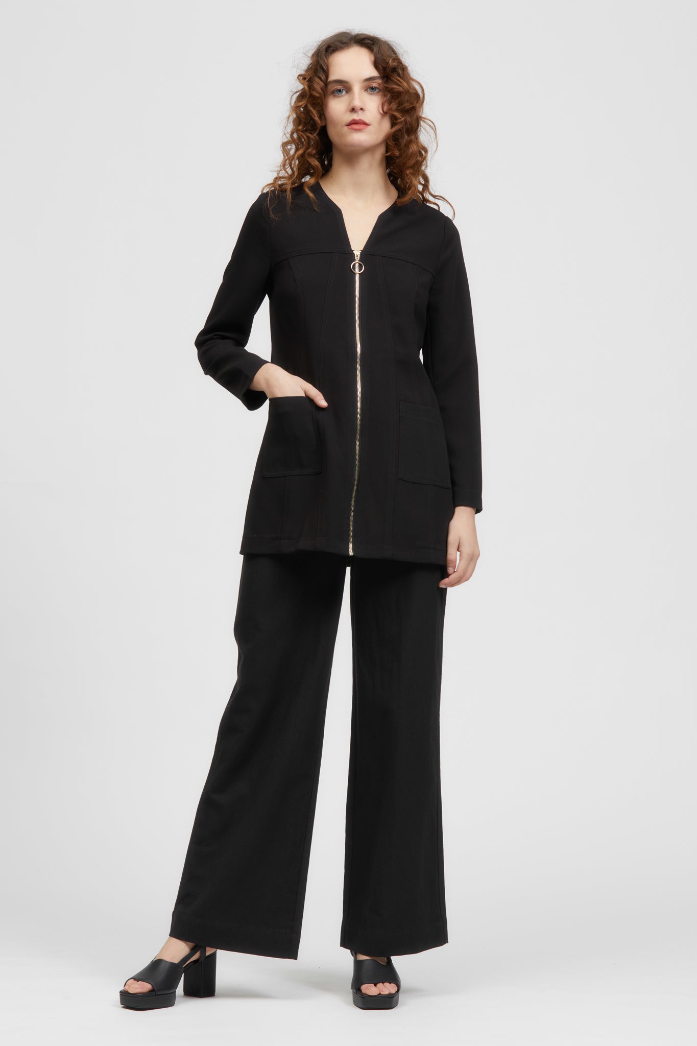 The Polepole Coat is a mini-length dress coat with a rounded neckline. It features panels at the front and back body giving a tailored shape with contrasting cream top stitch detailing. This style features a front and back yoke, a centre-front exposed zip with a circular pull and patch pockets at the front body. Made in a stretch Tencel blend for comfort.