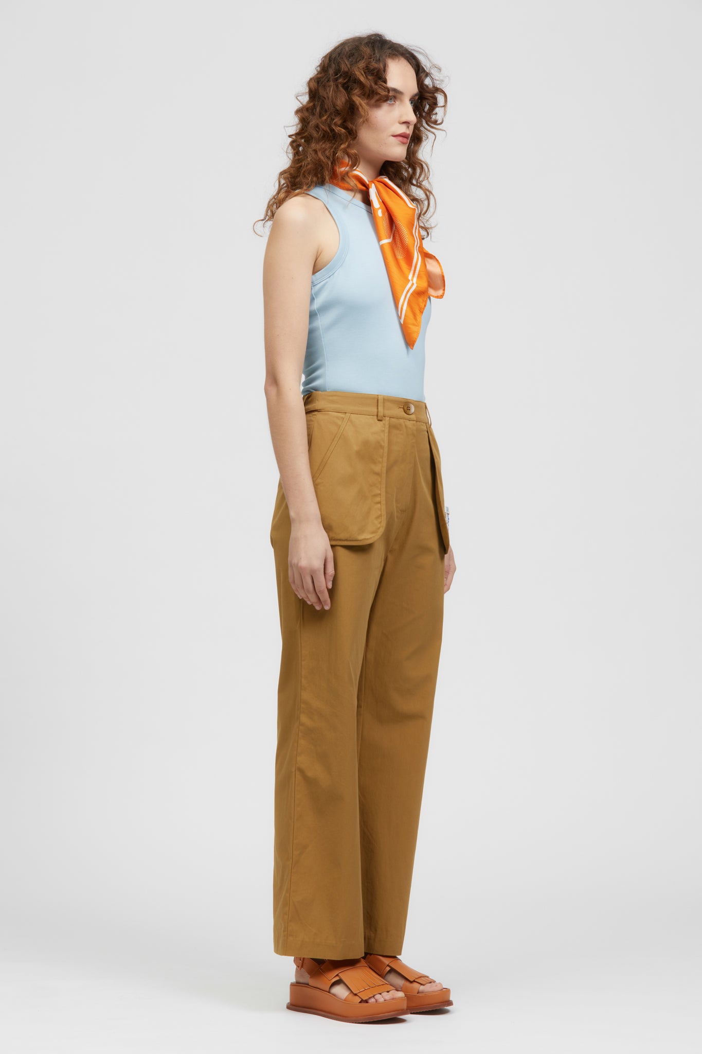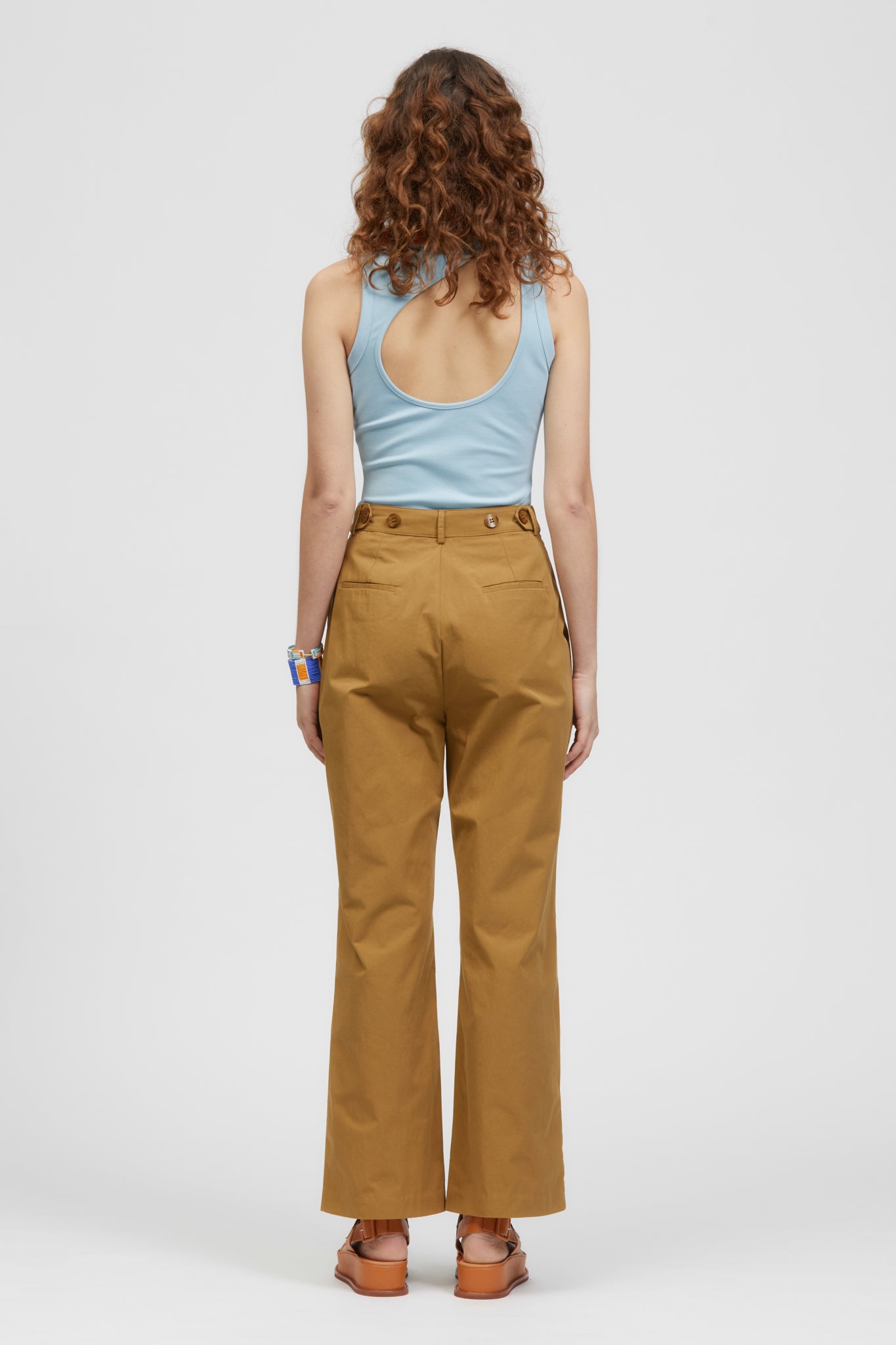 The Safi Pant is a high-waisted, full-length, straight-leg style. Featuring exterior pocket detailing at the front and welt pockets at the back. This style includes belt tabs at the back waistband with marbled shell button fastenings for size adjustment. Made in a crisp Cotton fabrication.