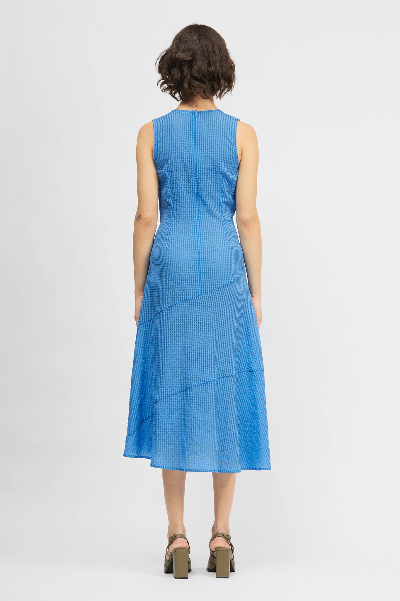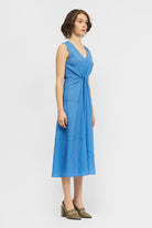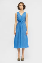 The Sori Dress is a sleeveless, mid-length style with a regular fit. This style offers a deep v-neckline, twist waist and asymmetrical seam detailing. Made in a lightweight seersucker fabrication.