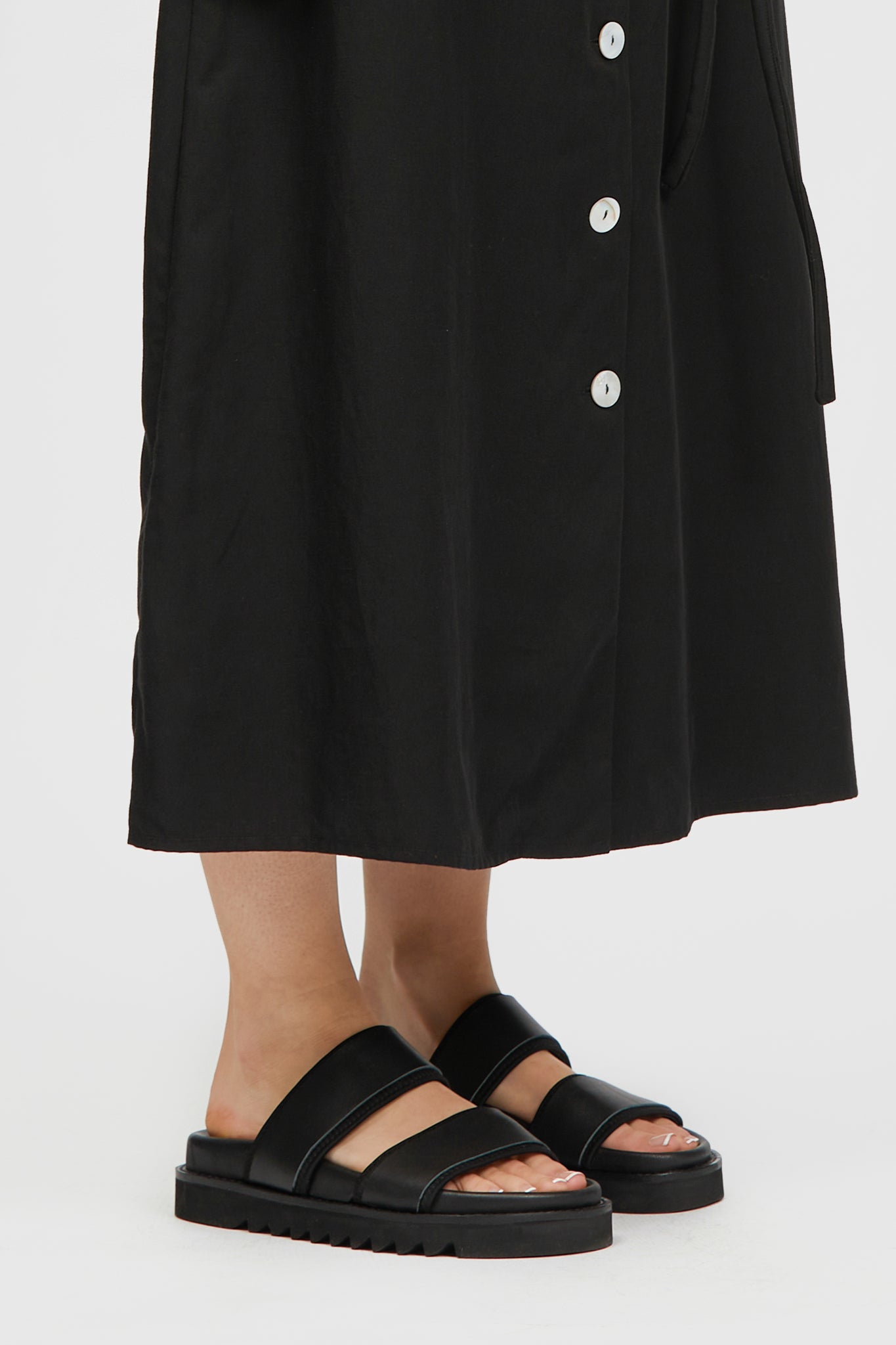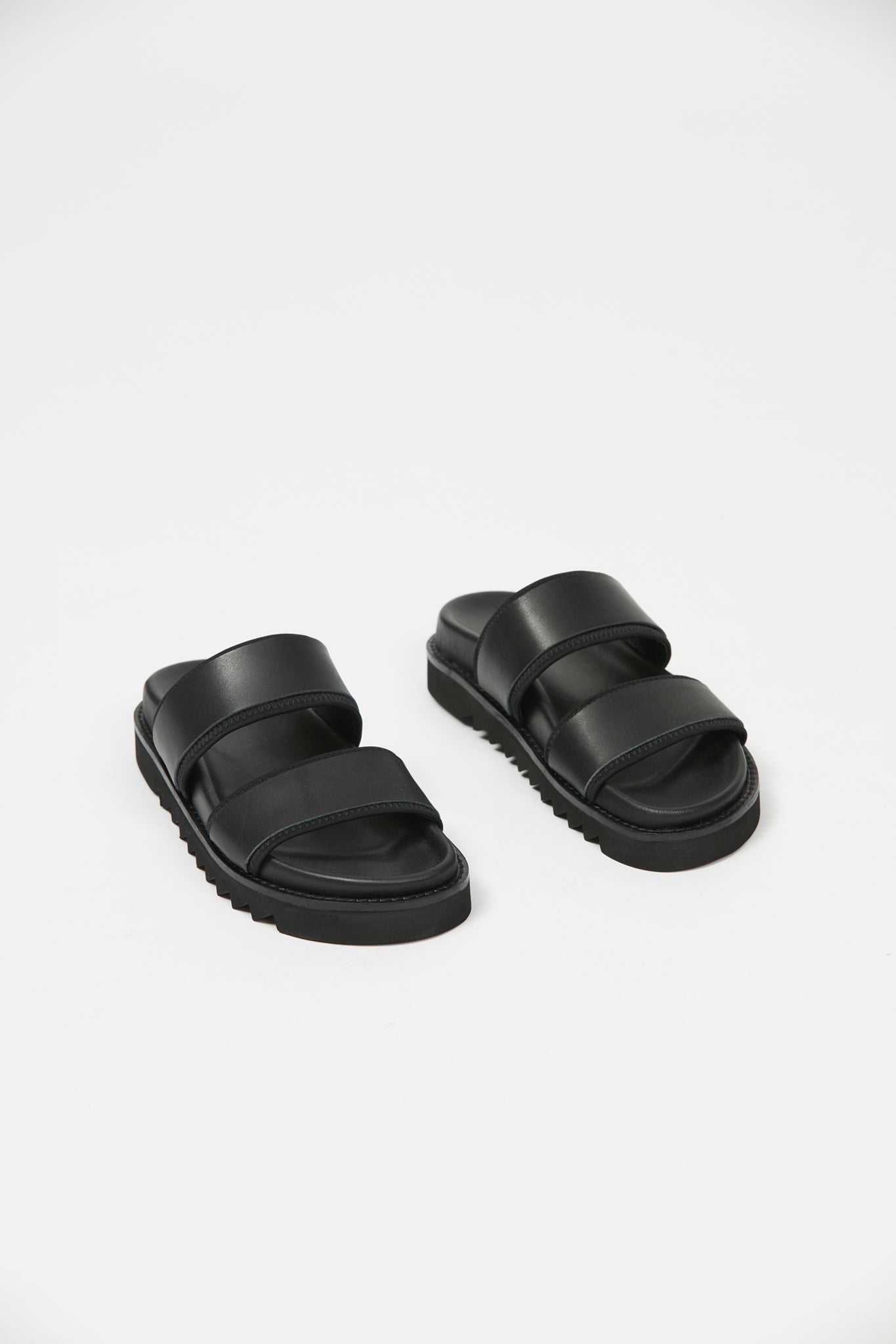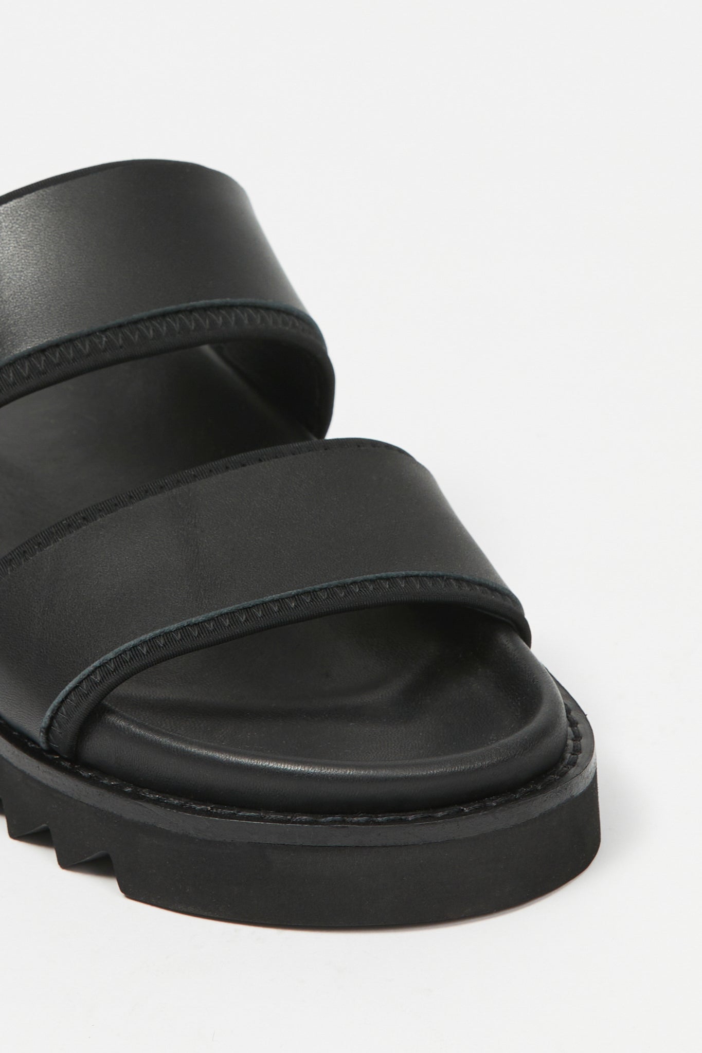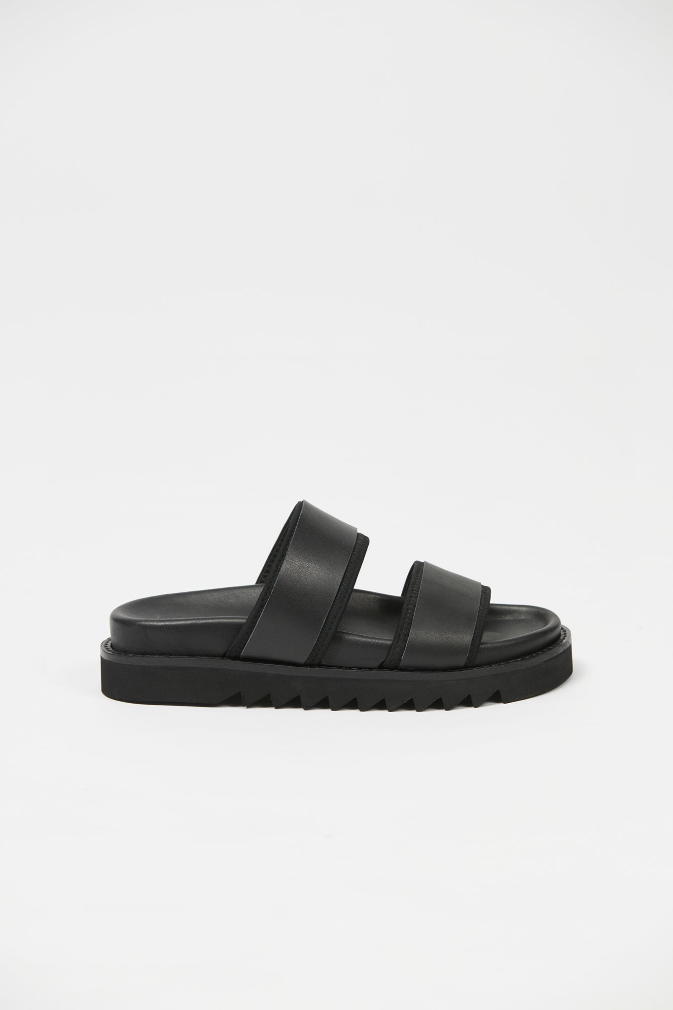 The Suco Slide is an open toe, slide on style. This style offers layered upper straps and a chunky sole. Made with neoprene and smooth leather.