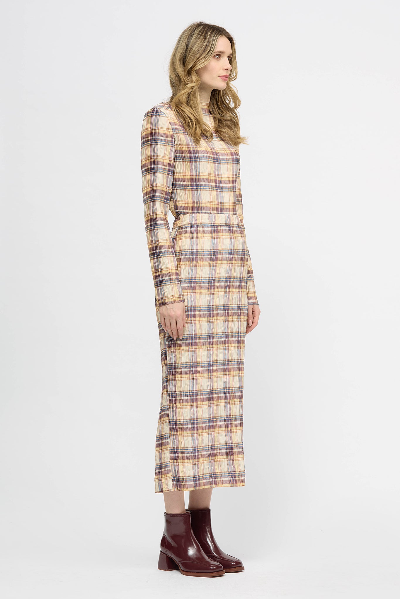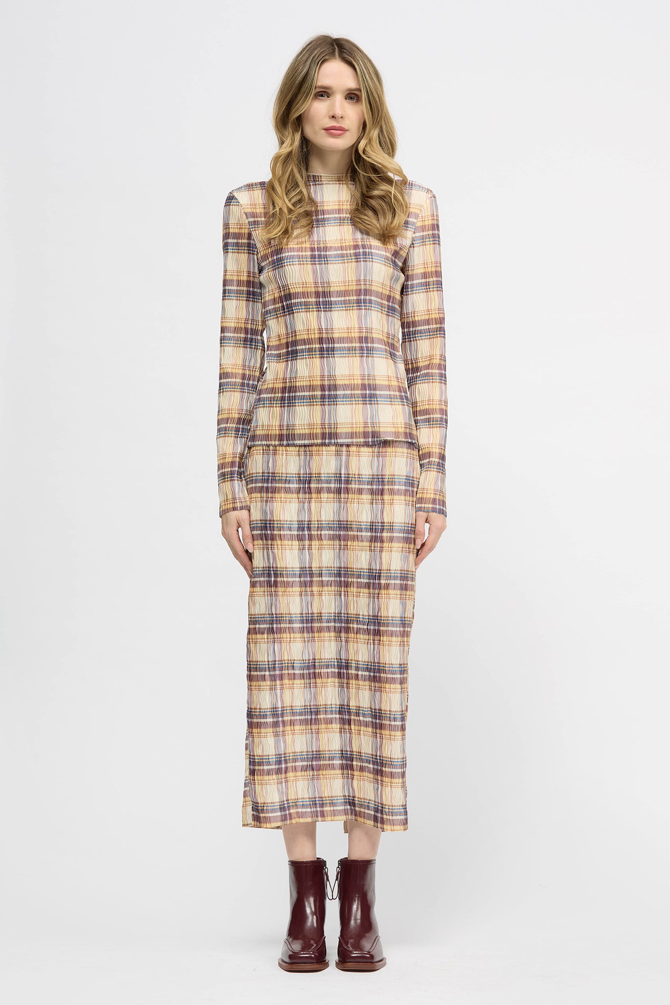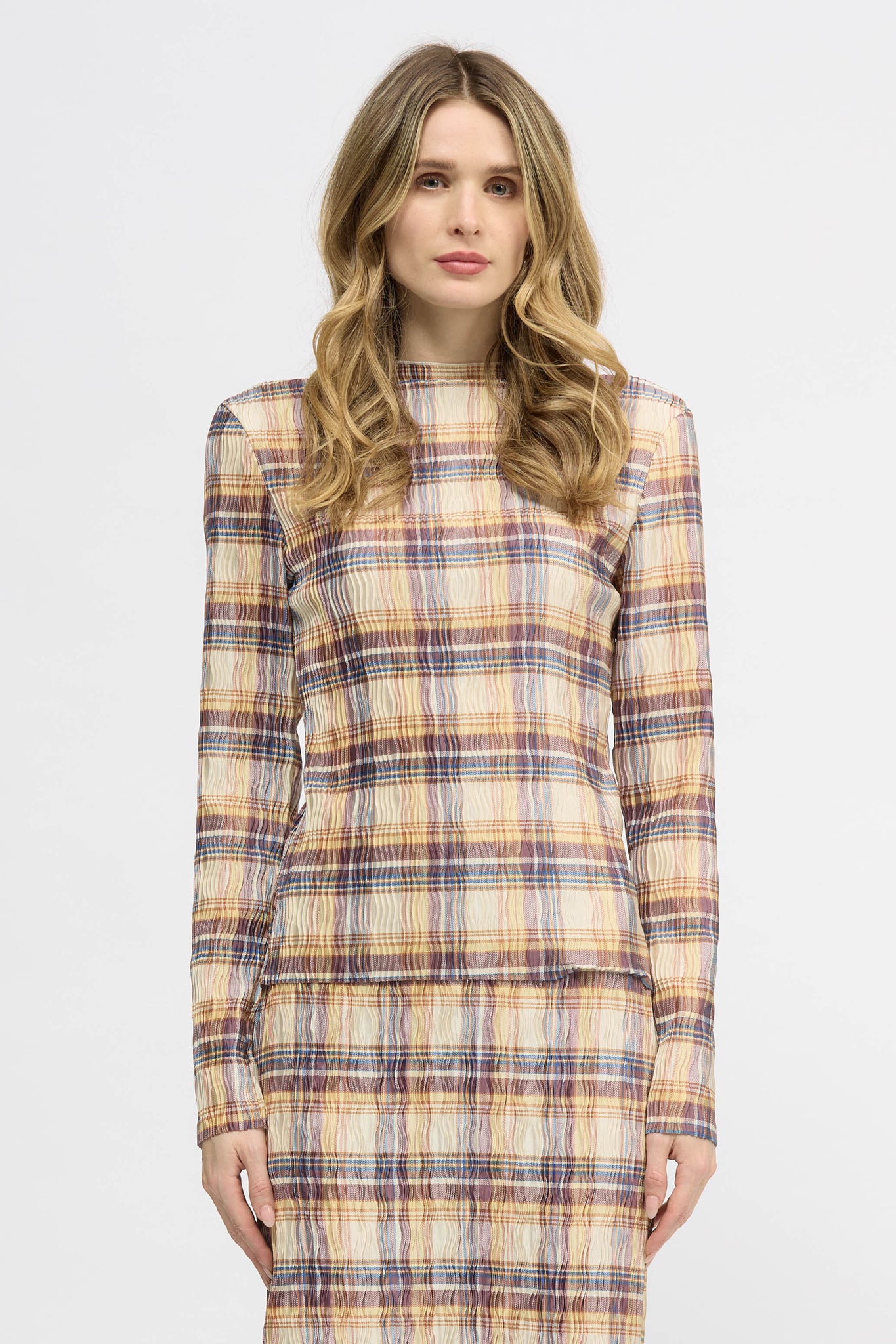 The Wave Top is a long sleeve, relaxed fit style designed with a high neckline. This style is finished with soft baby lock at neckline and raw edges at hems. Made from a pleated fabrication with high stretch for comfort. This style can be paired back with your existing wardrobe favourites or with the Hakea Skirt in matching fabric as a set.