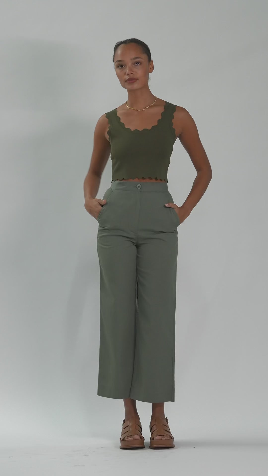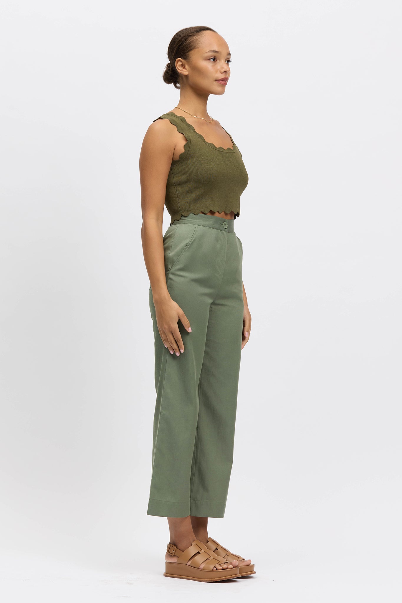 The Jaco Pant features a cropped leg and back pockets, made from a soft Tencel-cotton blend.
