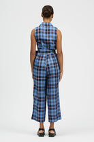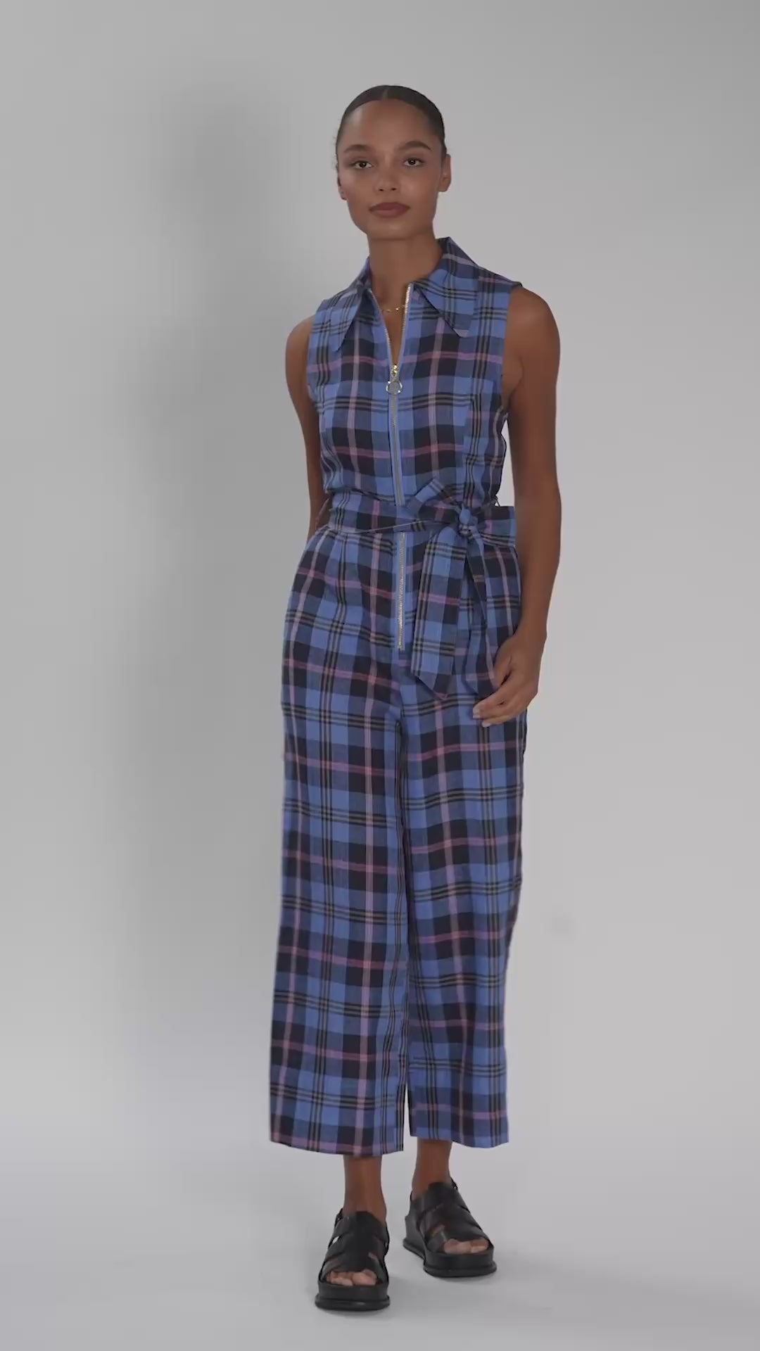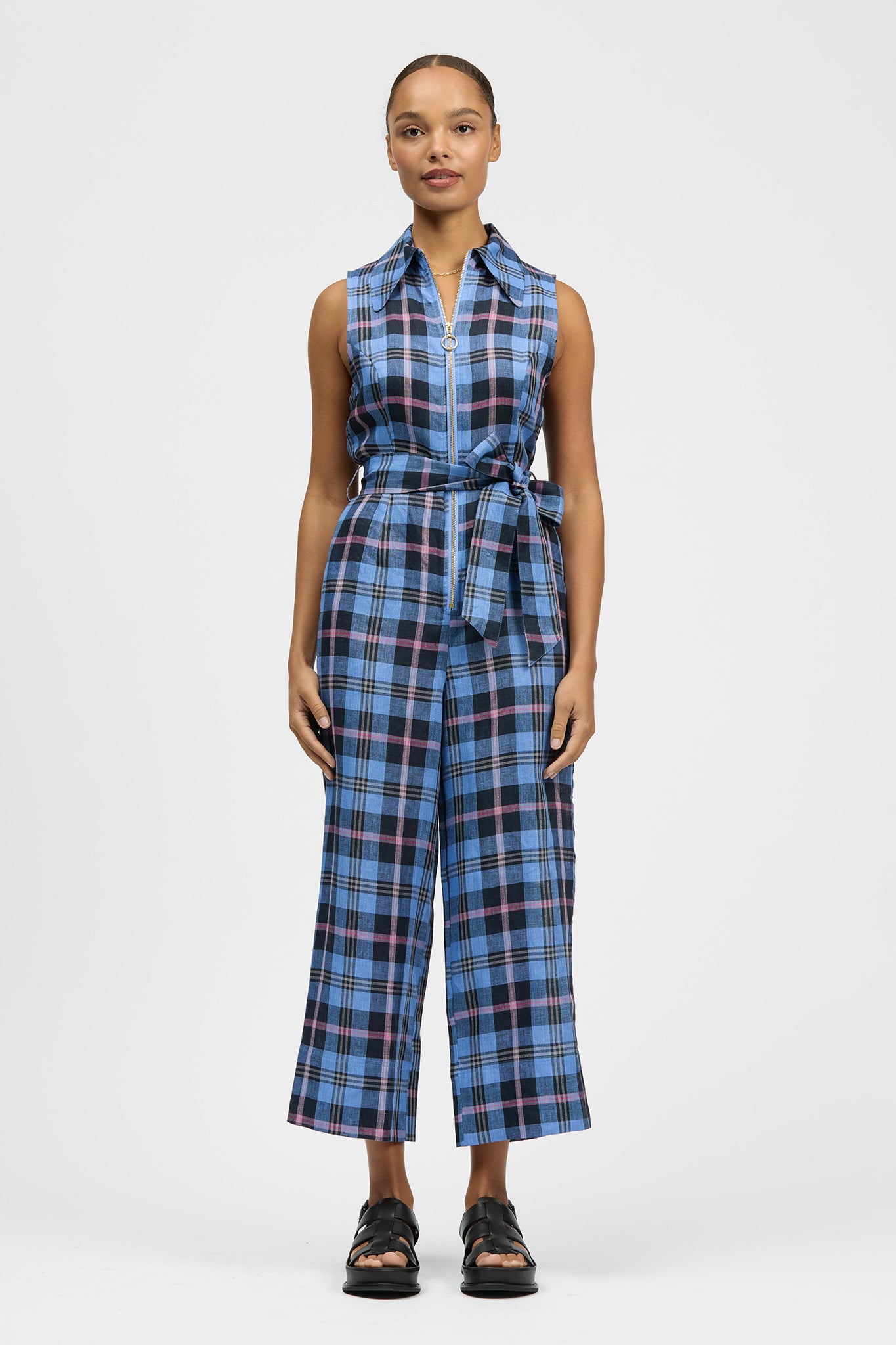 The Mocanal Onesie is a sleeveless jumpsuit featuring a front zip detail and a waist tie, made from soft linen.
