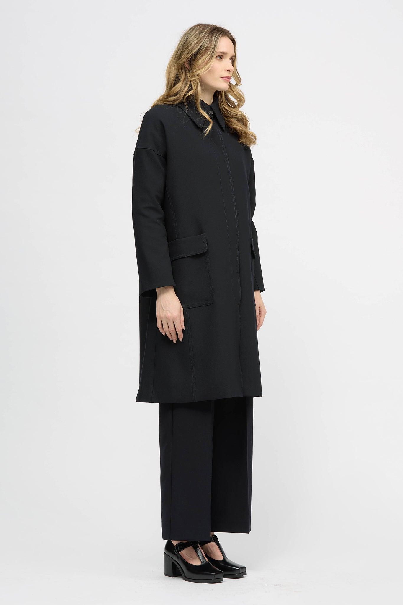 The Musgrave Coat is an oversized, mid-length style with a dropped shoulder and wide sleeves. Features include a classic collar and front patch pockets with a folded hem detail at the top opening edge. This is a single-breasted style made with hidden tonal marble buttons on a concealed front placket with a single button exposed on the collar. Made in a soft but structured polyester/ viscose blend and is fully lined in a matching navy satin. Wear with your existing wardrobe favourites or with the Aimsir Pant in Dark Navy as a matching set.