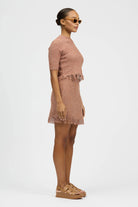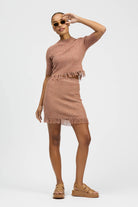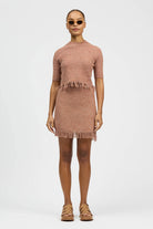The Borla Skirt is a mini length skirt featuring fringe detailing along the hemline. Made in 100% textured cotton. This style can be paired with your existing wardrobe favourites or with the Borla Top in matching fabric as a set.