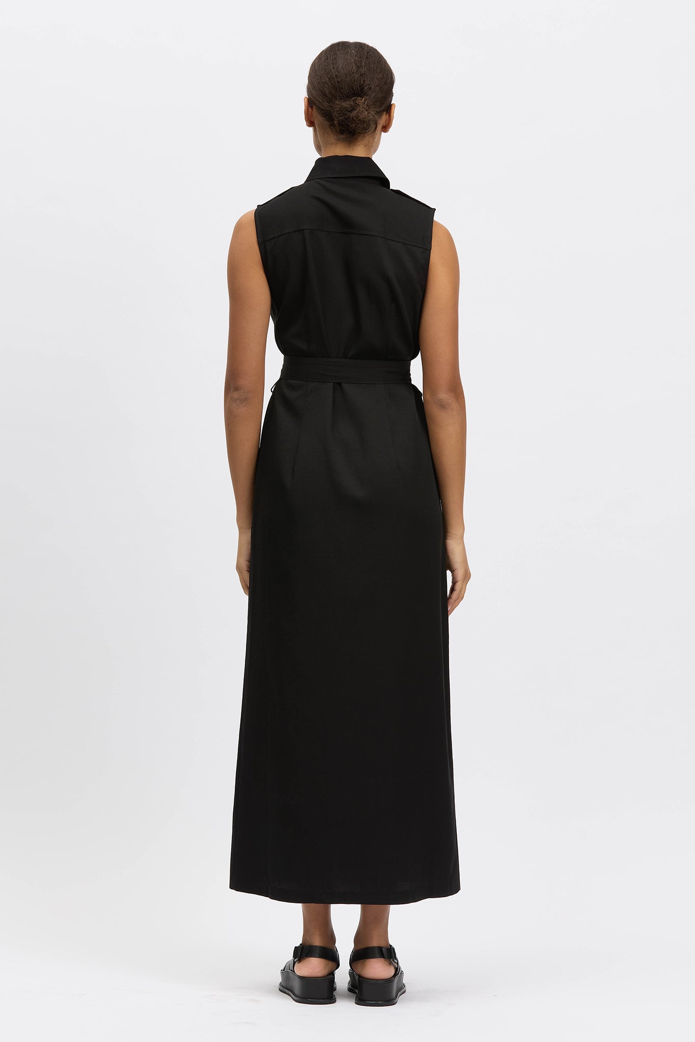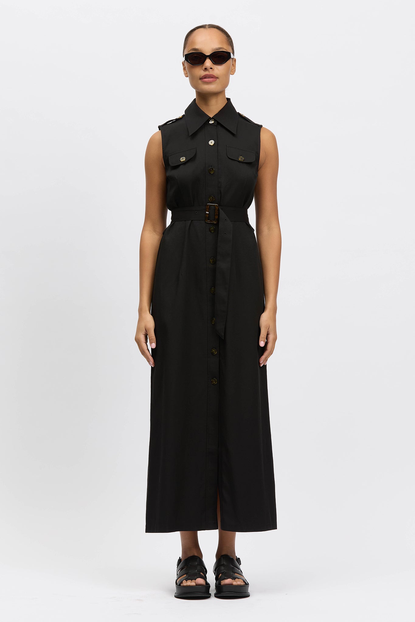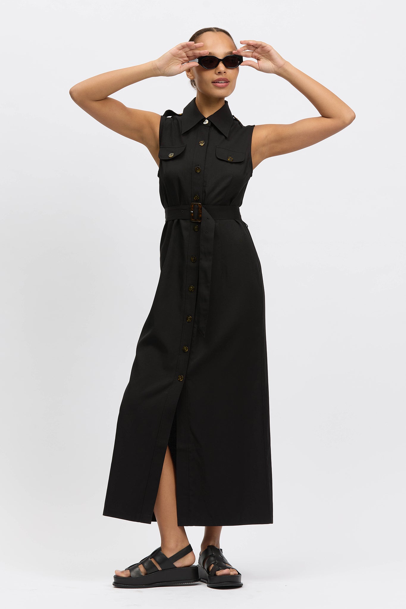 The Vera Sleeveless Shirt Dress features a button-front design and a refined silhouette, highlighted by a waist cinching belt. Made from a soft blend of Tencel and Cotton.