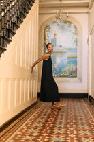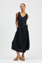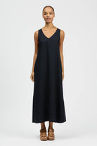 The Vida Dress is a maxi-length, A-line silhouette made from soft, self-stripe Tencel for all-day comfort. It also features convenient side pockets.