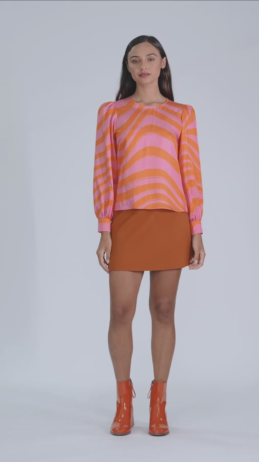 The Belmont Top is designed as a relaxed fit through the body with balloon style sleeves. Details include an organic-shaped gold button fastening on each cuff and centre back slit which leads to a small gold button closure at the top. Made in a smooth Viscose with búl’s house-designed Squiggle Print. This style can be paired back with your existing wardrobe favourites or with the Hilden Skirt in the same print as a matching set.