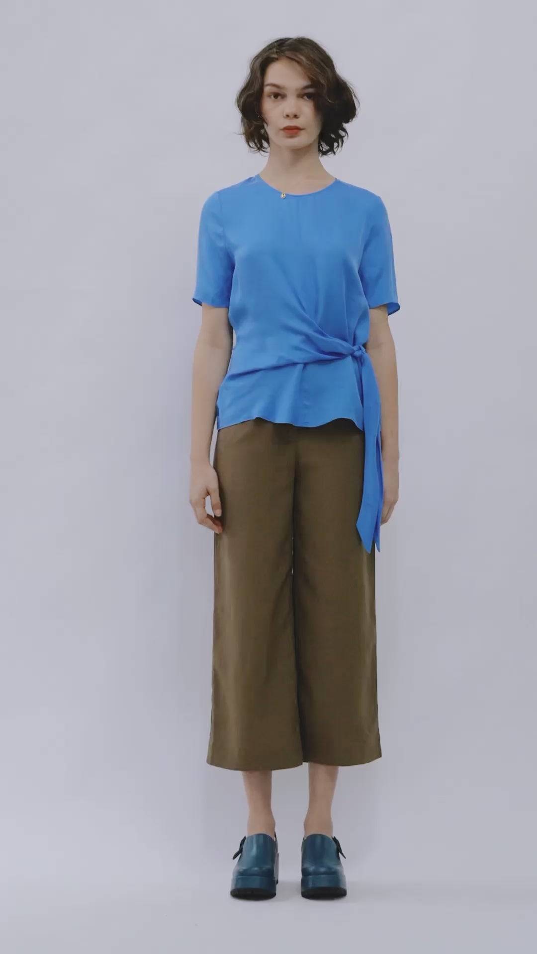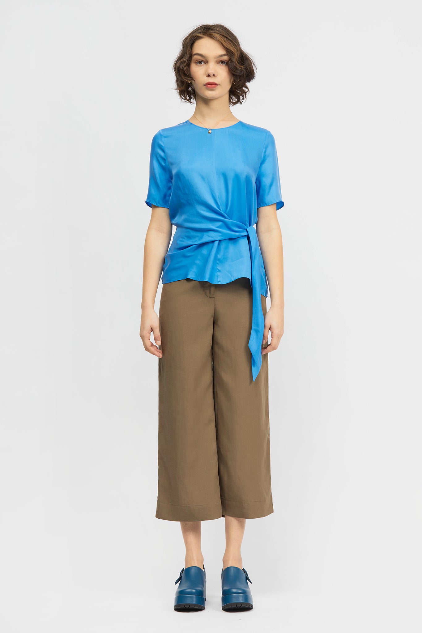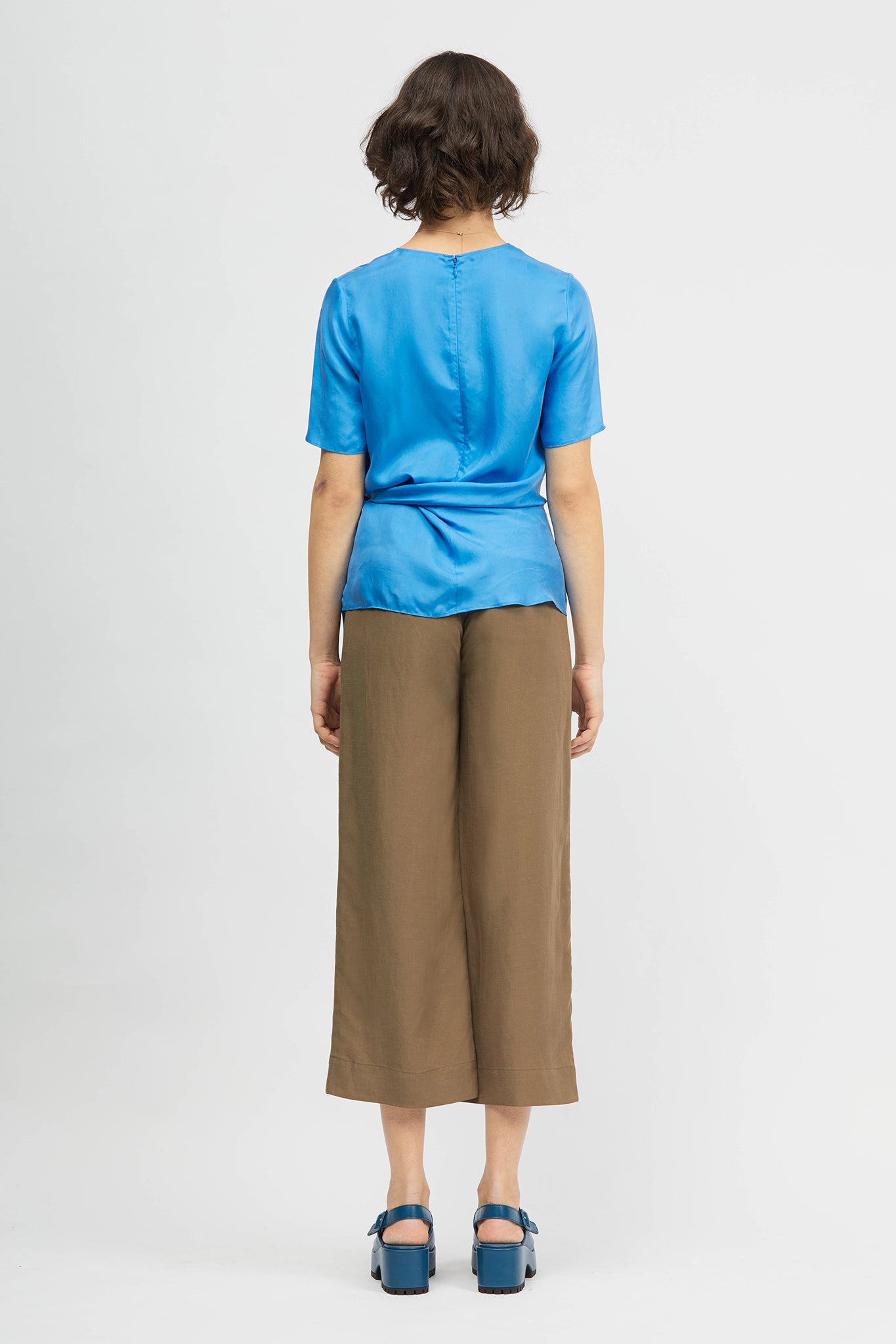 The Bia Top is a regular fit style with a round neck and short sleeves. This style features a side tie that can be knotted or tied into a bow and a centre back invisible zipper closure. Made in a soft and silky cupro/ viscose blend.