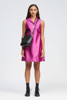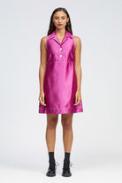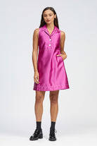 The Blas Dress is a mini-length, sleeveless style with a button up front. This style is a regular fit with a tailored waist and upper body that flows into an A-line skirt. Features include the open lapel collar, contrast cream stitching and inseam pockets. This style fastens with a hidden inseam invisible zipper at the side and a button up front. Made in a lustrous Rayon/Nylon blend fabrication.