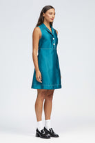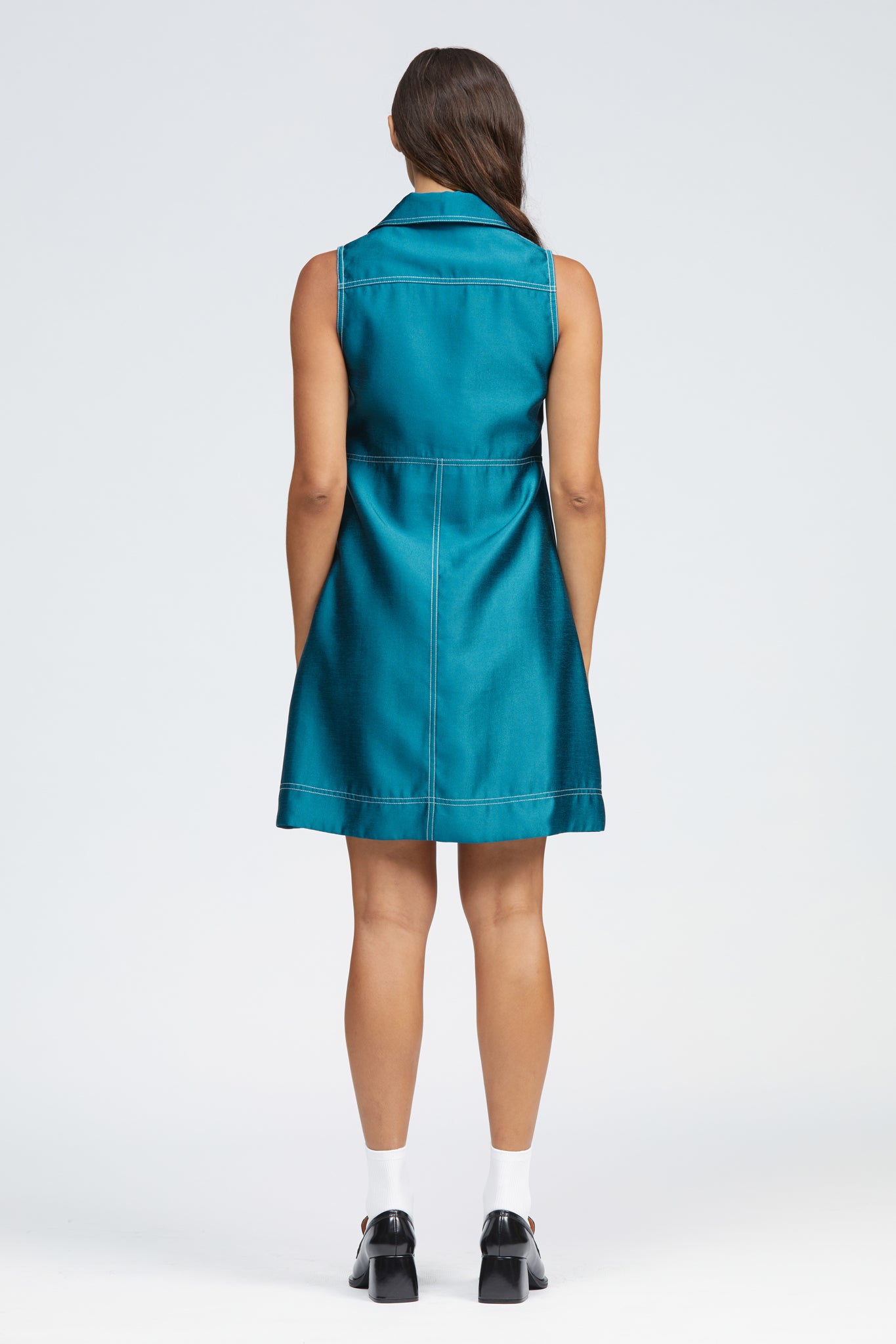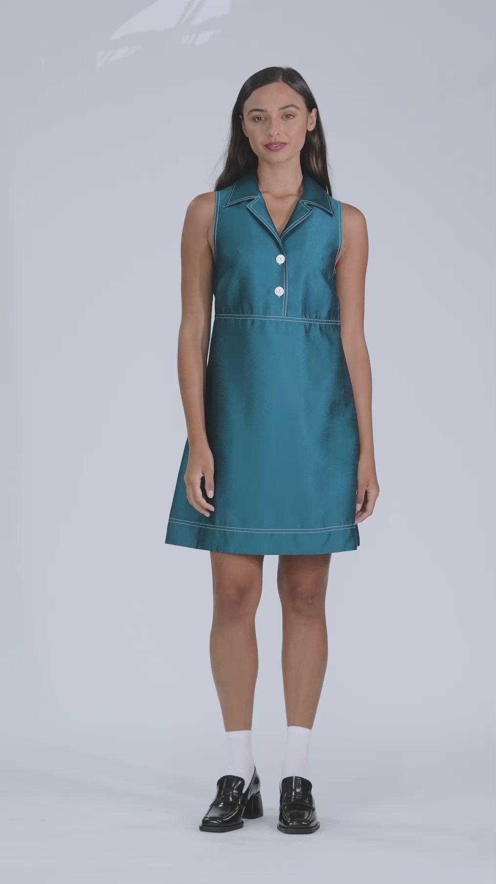 The Blas Dress is a mini-length, sleeveless style with a button up front. This style is a regular fit with a tailored waist and upper body that flows into an A-line skirt. Features include the open lapel collar, contrast cream stitching and inseam pockets. This style fastens with a hidden inseam invisible zipper at the side and a button up front. Made in a lustrous Rayon/Nylon blend fabrication.
