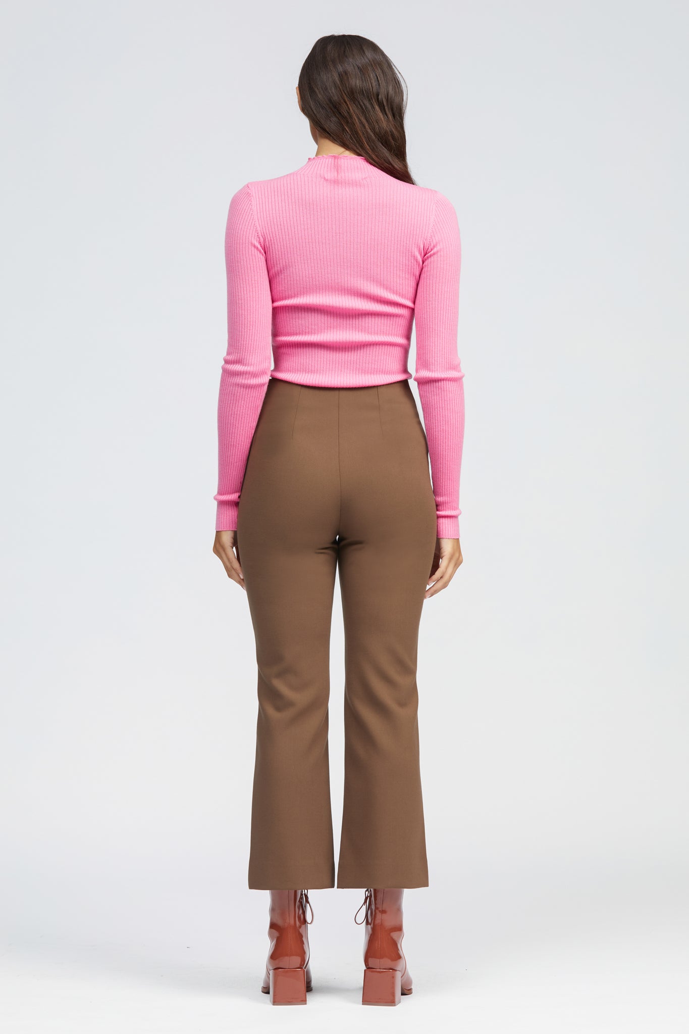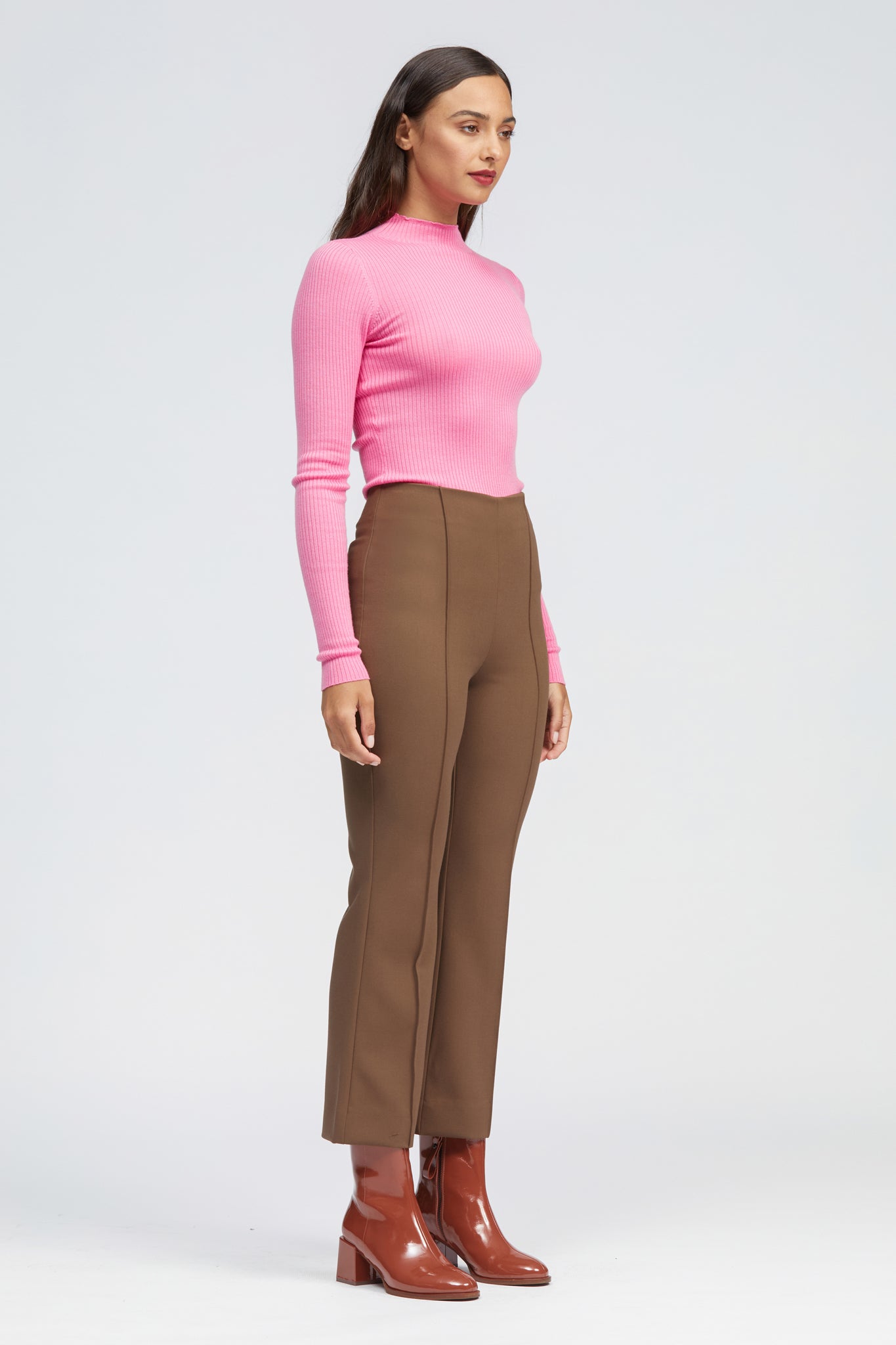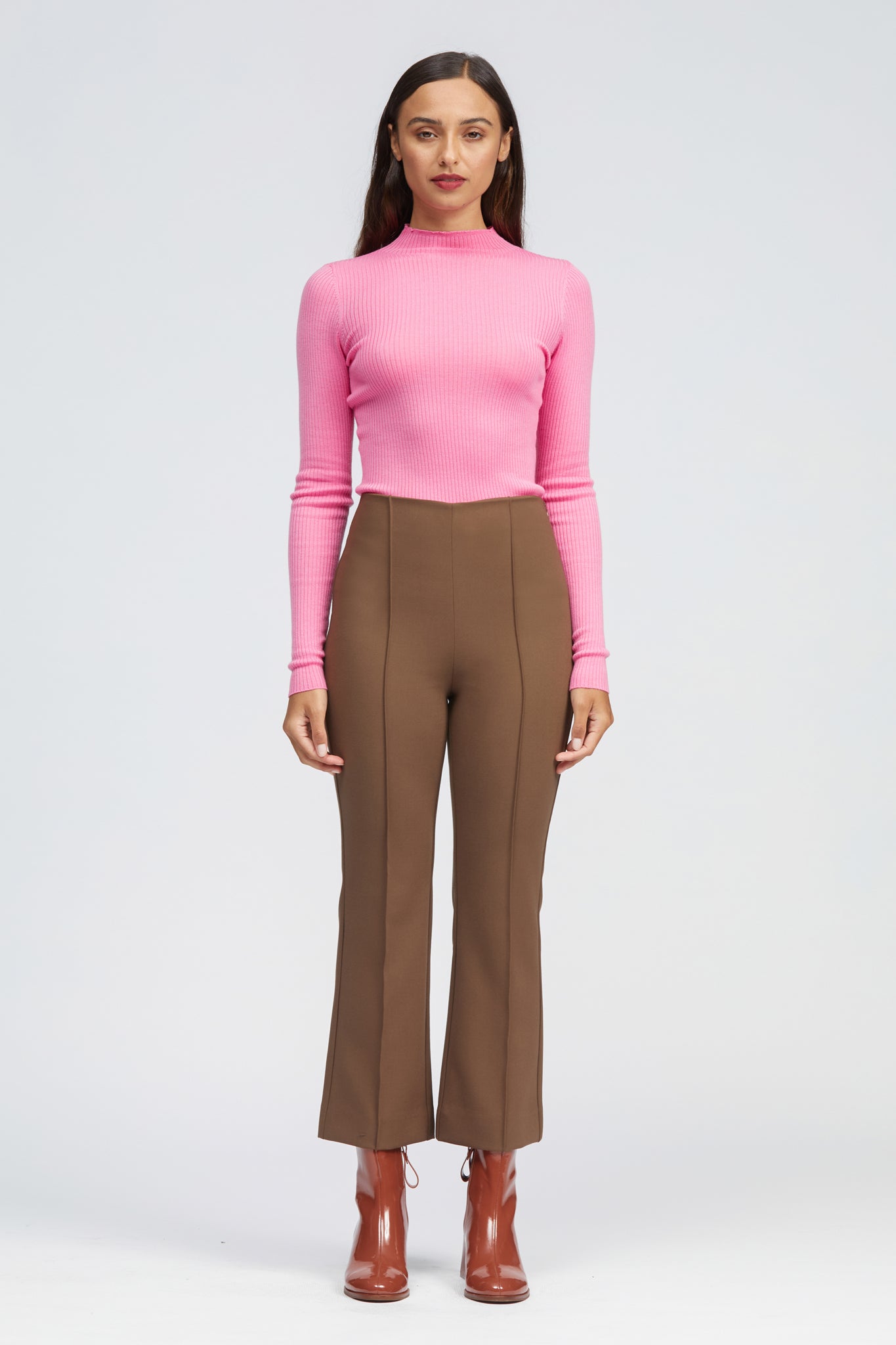 The Malone Pant is a flared, cropped-length style with a high-waist. It features a flattering clean front with no waistband, a side inseam invisible zip fastening and pintuck seams through the centre-front legs. Made from a soft but structured Polyester/Viscose with a slight stretch.