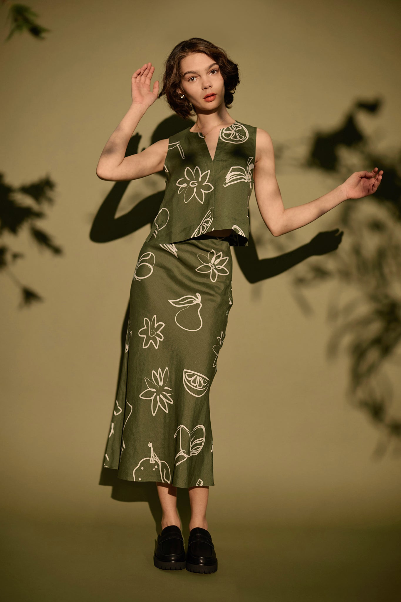 The Onggi Top is a sleeveless style in a cropped length and A-line silhouette. Details include side splits and an open V-neckline. Made from a soft linen/ viscose blend in búl’s in-house designed Bom Print. This style can be paired back with your existing wardrobe favourites or with the Sorrir Skirt in matching fabric as a set.