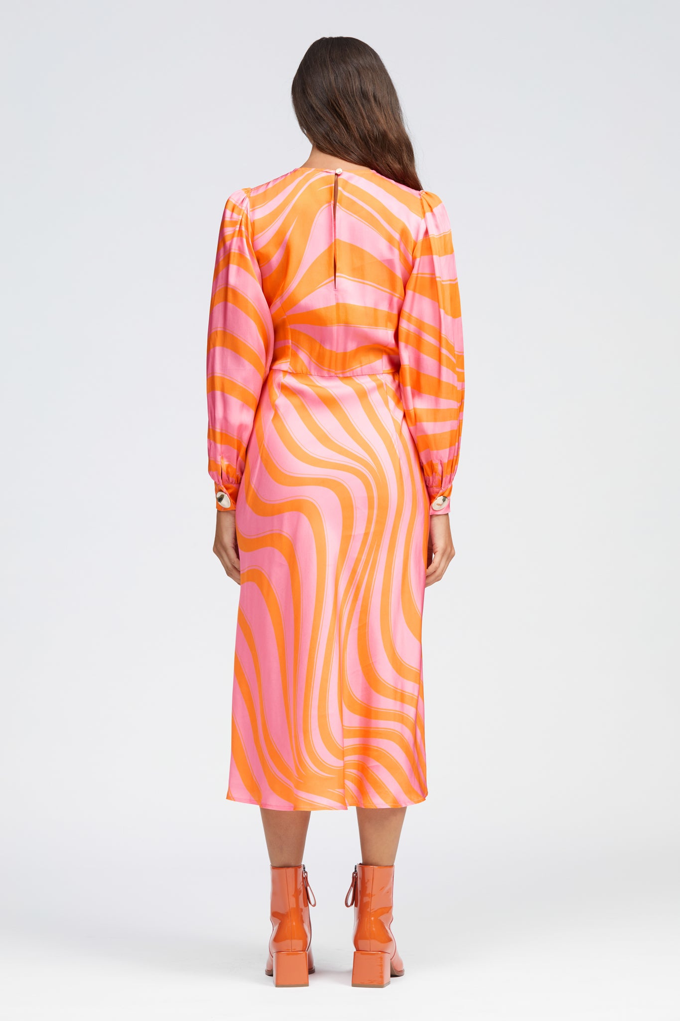 The Peregrine Dress is a mid-length style with a fitted upper body and waist that falls into a bias-cut flowy skirt. Features include balloon sleeves and organic-shaped gold button fastening on each cuff, a round neckline and a centre back slit which leads to a small gold button fastening at the back neck. Made in a smooth and silky Viscose fabrication with búl’s house-designed Squiggle Print.