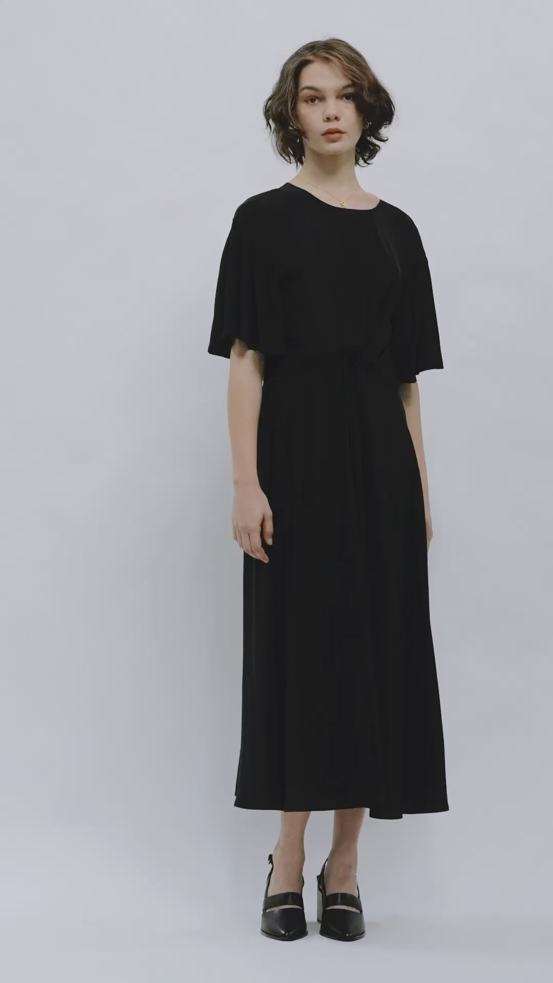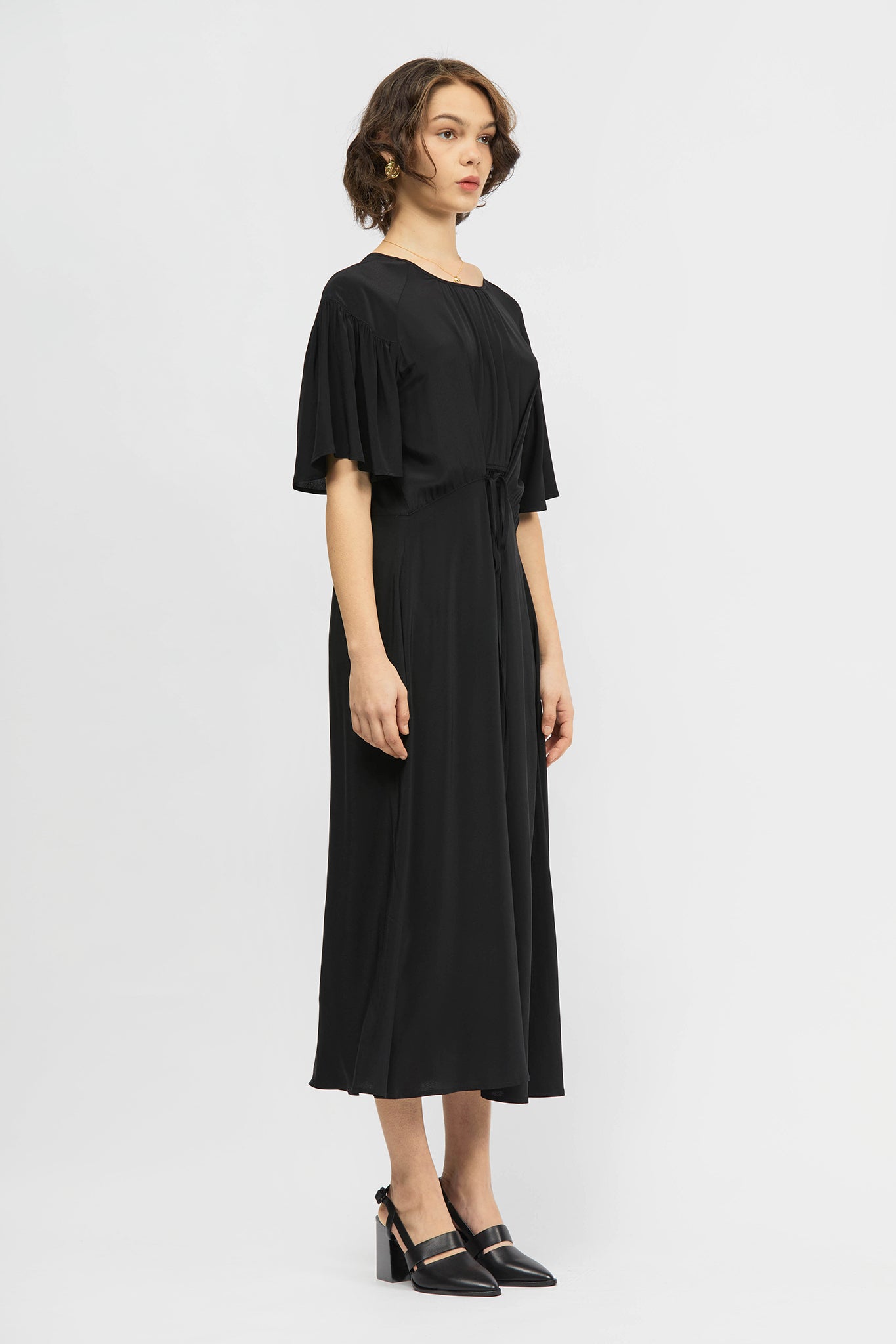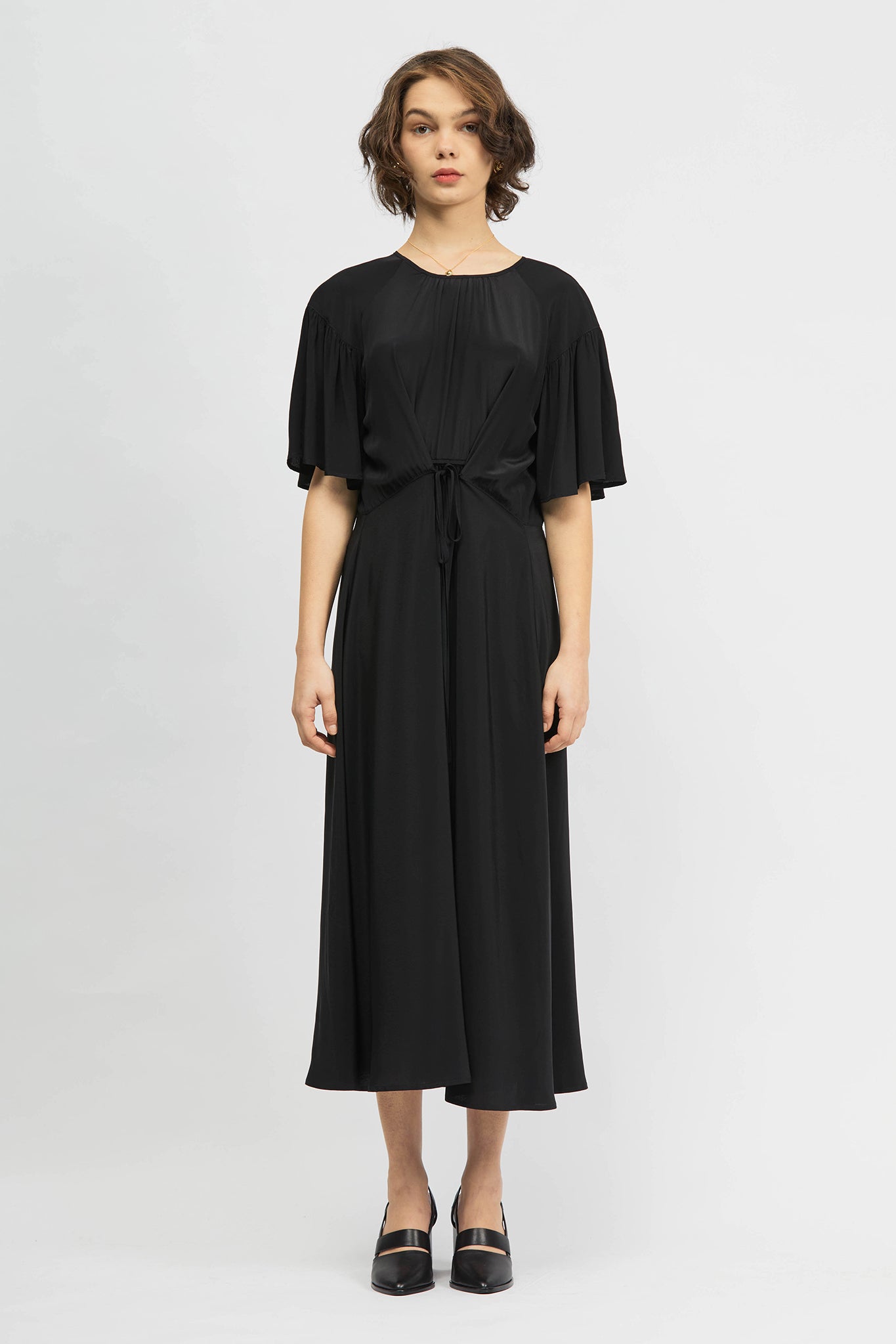 The Prazer Dress is a short sleeve, maxi length, relaxed fit style. This style includes gathers throughout and a drawstring waist detail that can be tied towards the front or back. Made in a smooth and flowy acetate blend.