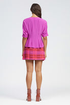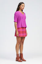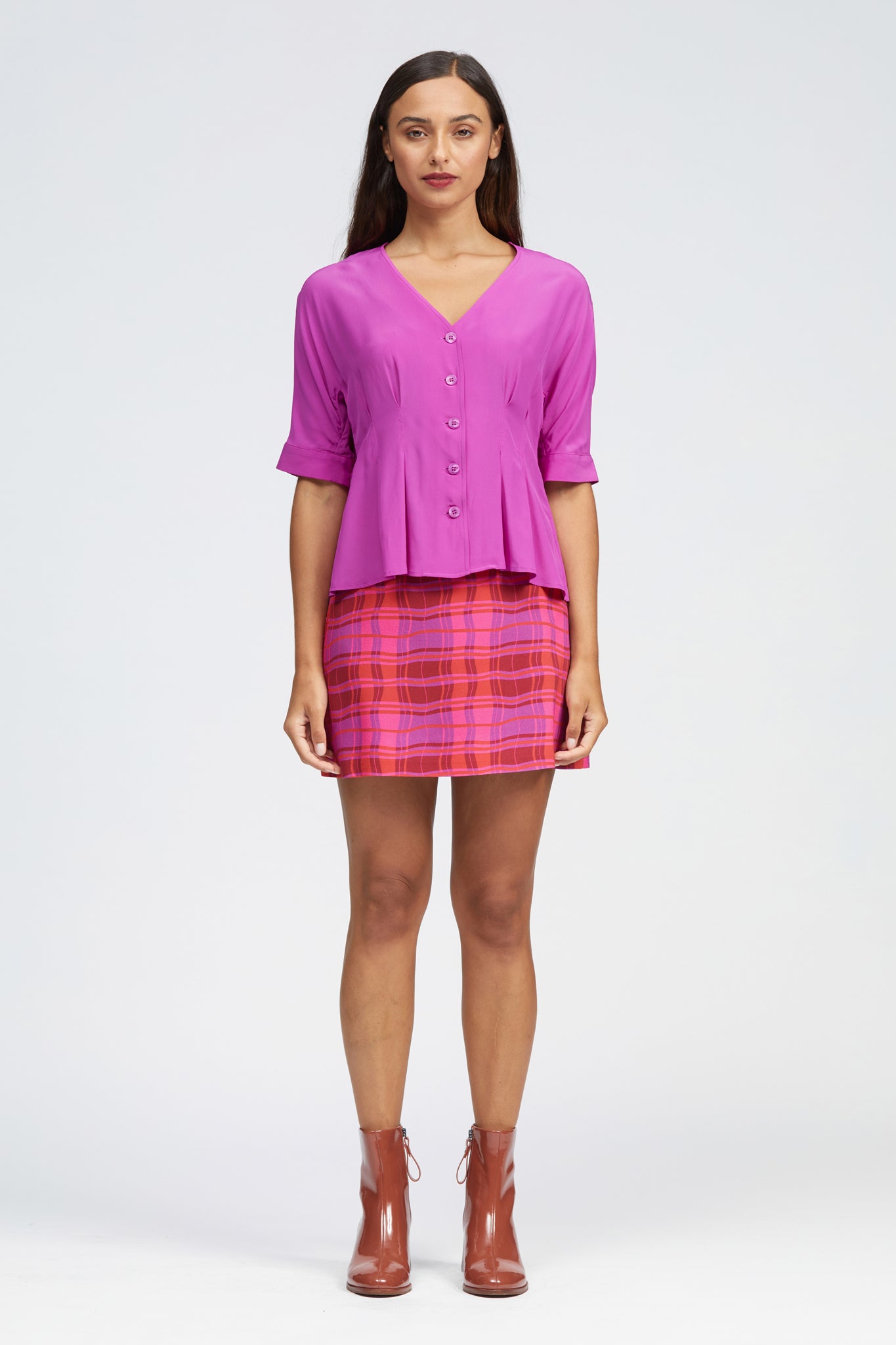 The Solas Top buttons at the front and has kimono style short sleeves with a buttoned fastening at the cuffs. This style features pintuck details that create a tailored fit through the waist. Made from a soft and flowy Acetate blend fabrication.